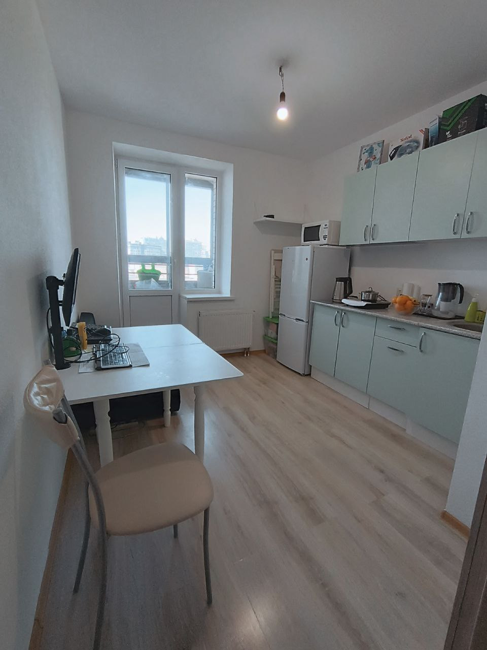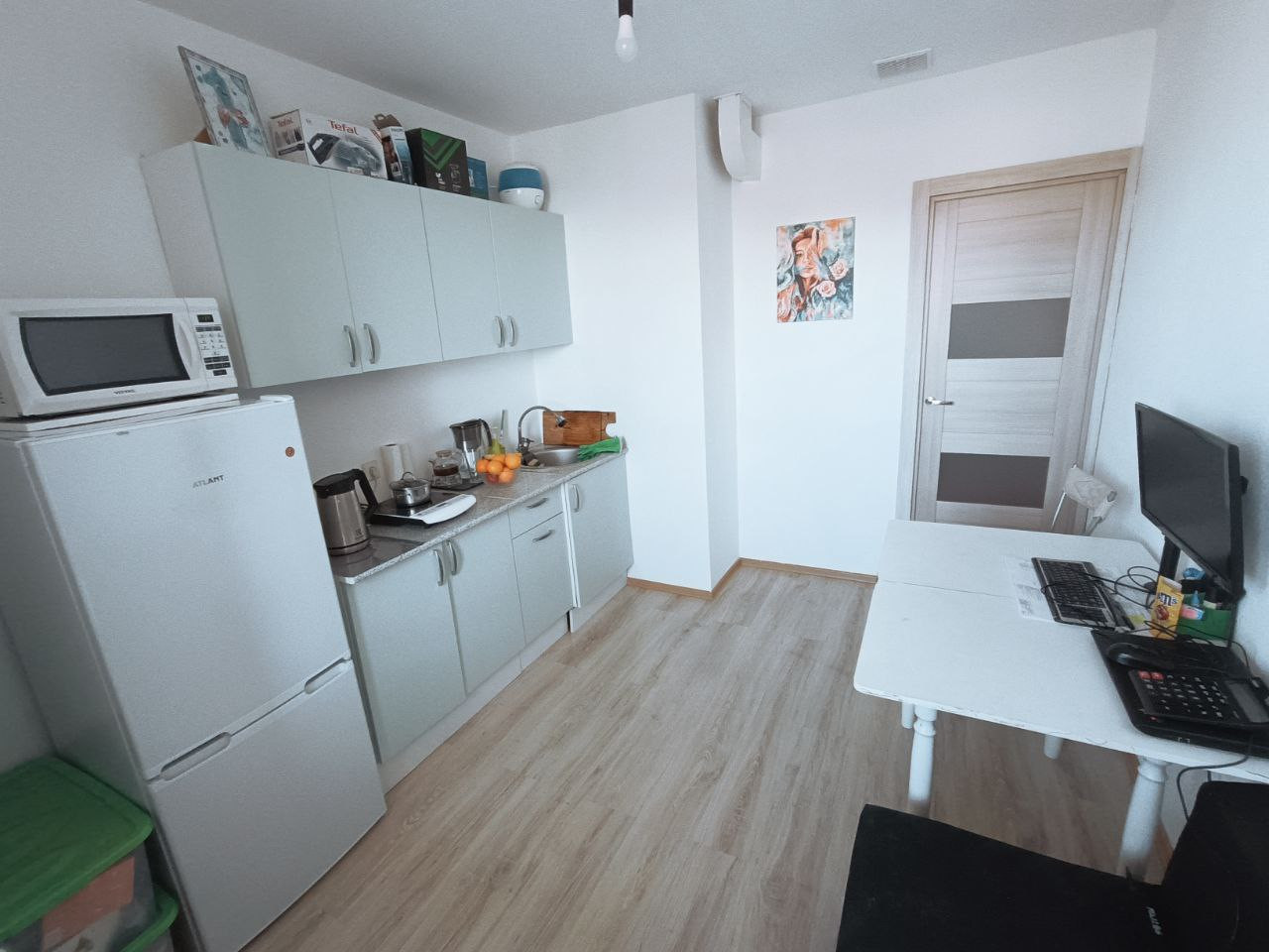 В квартире: кухонный гарнитур, 2-х спальная кровать, стол, стулья, стиральная машина, холодильник, сушилка для белья, утюг, система хранения одежды в гардеробной. Интернет проведён, но не подключен.