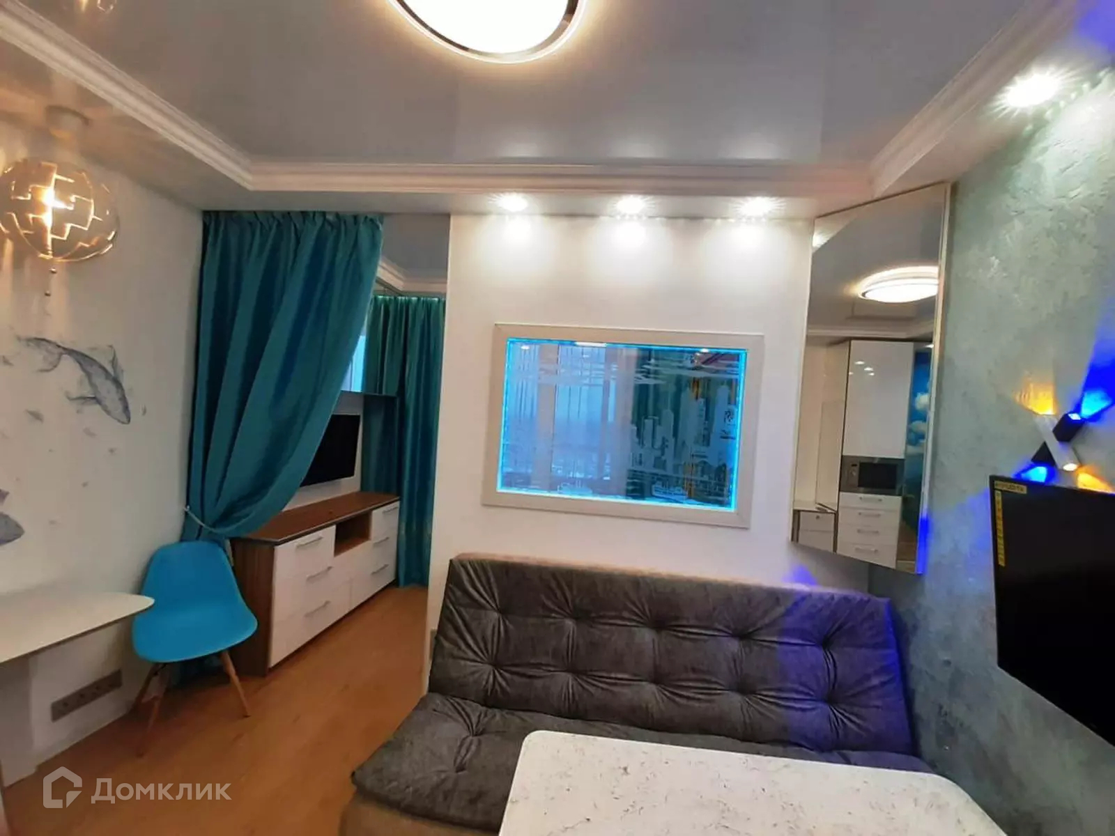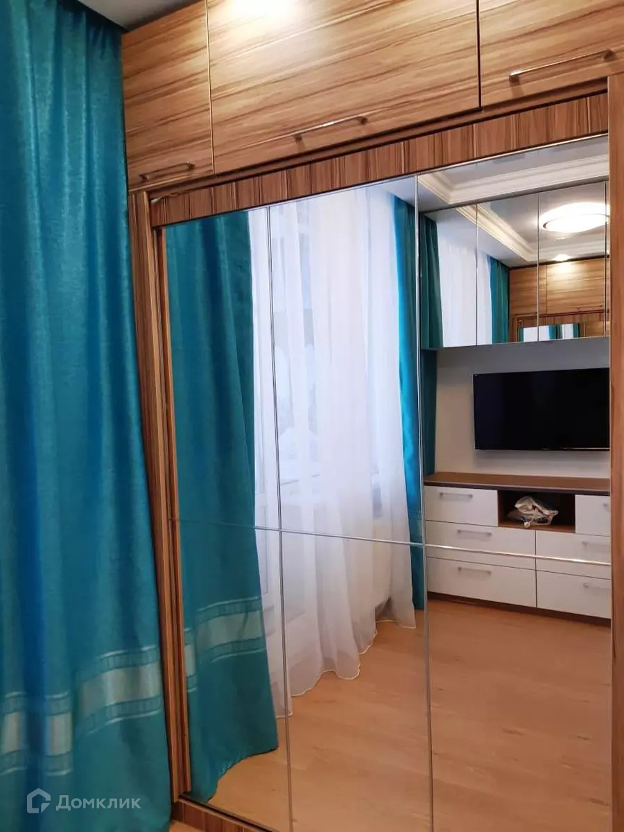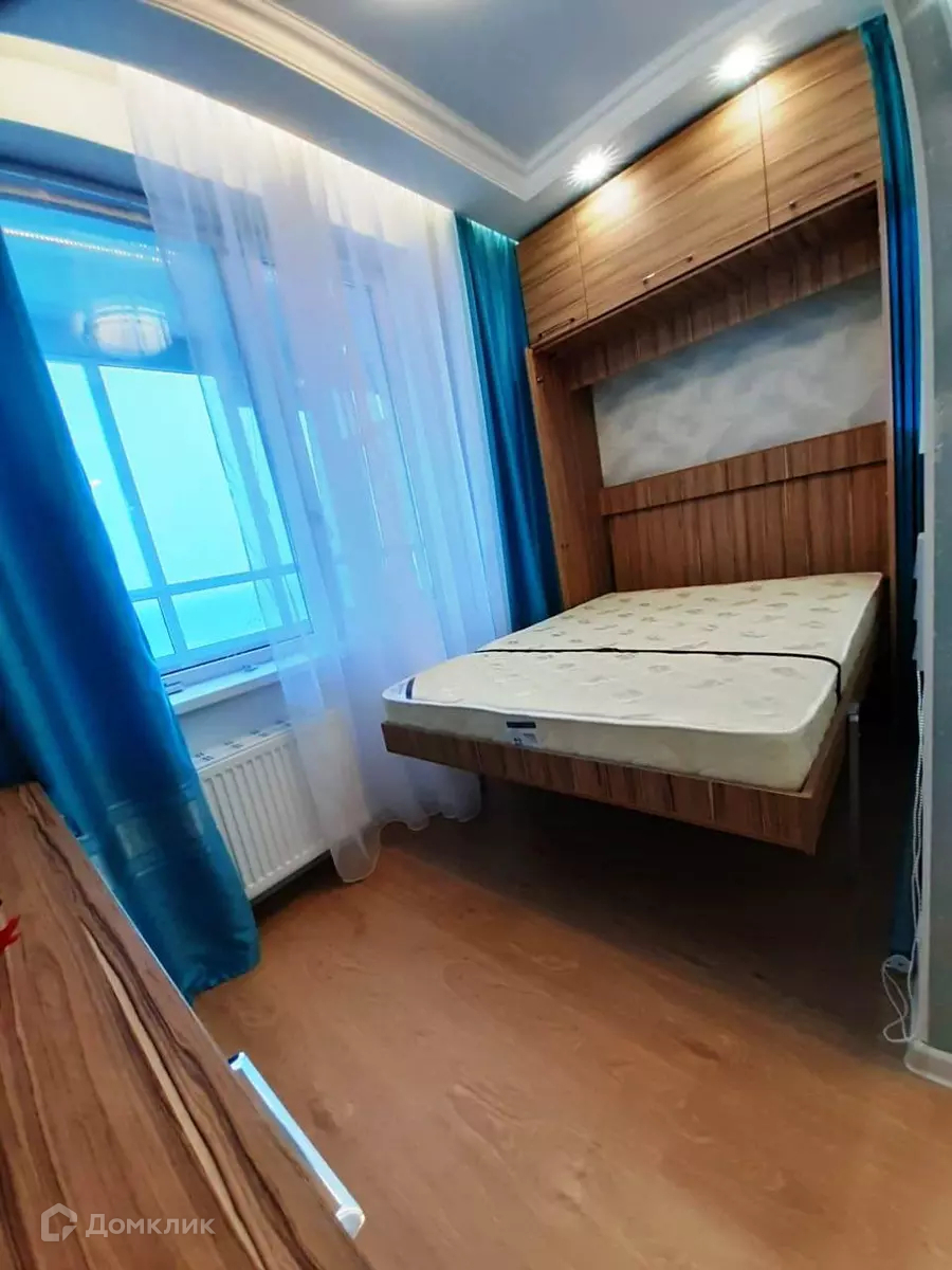 мебель: двухспальная подъемная кровать 140х200 (новый ортопедич. матрас), диван (раскладной), много мест для хранения (шкафы, стеллаж, комод, навесные шкафы), рабочее место (под компьютер, ноутбук). Шторы блэкаут.