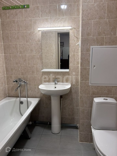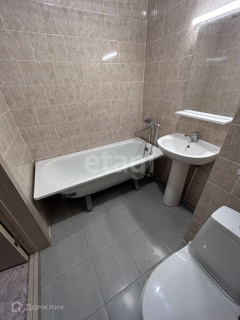 Санузел, совмещенный в кафеле, с новой сантехникой.