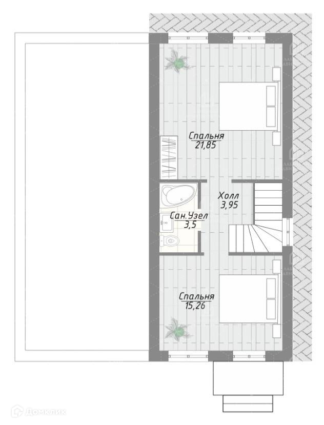 - 3 ИЗОЛИРОВАННЫХ спальных комнаты (8,41/15,26/21,85 м²): одна на 1-ом этаже и две на 2-ом этаже