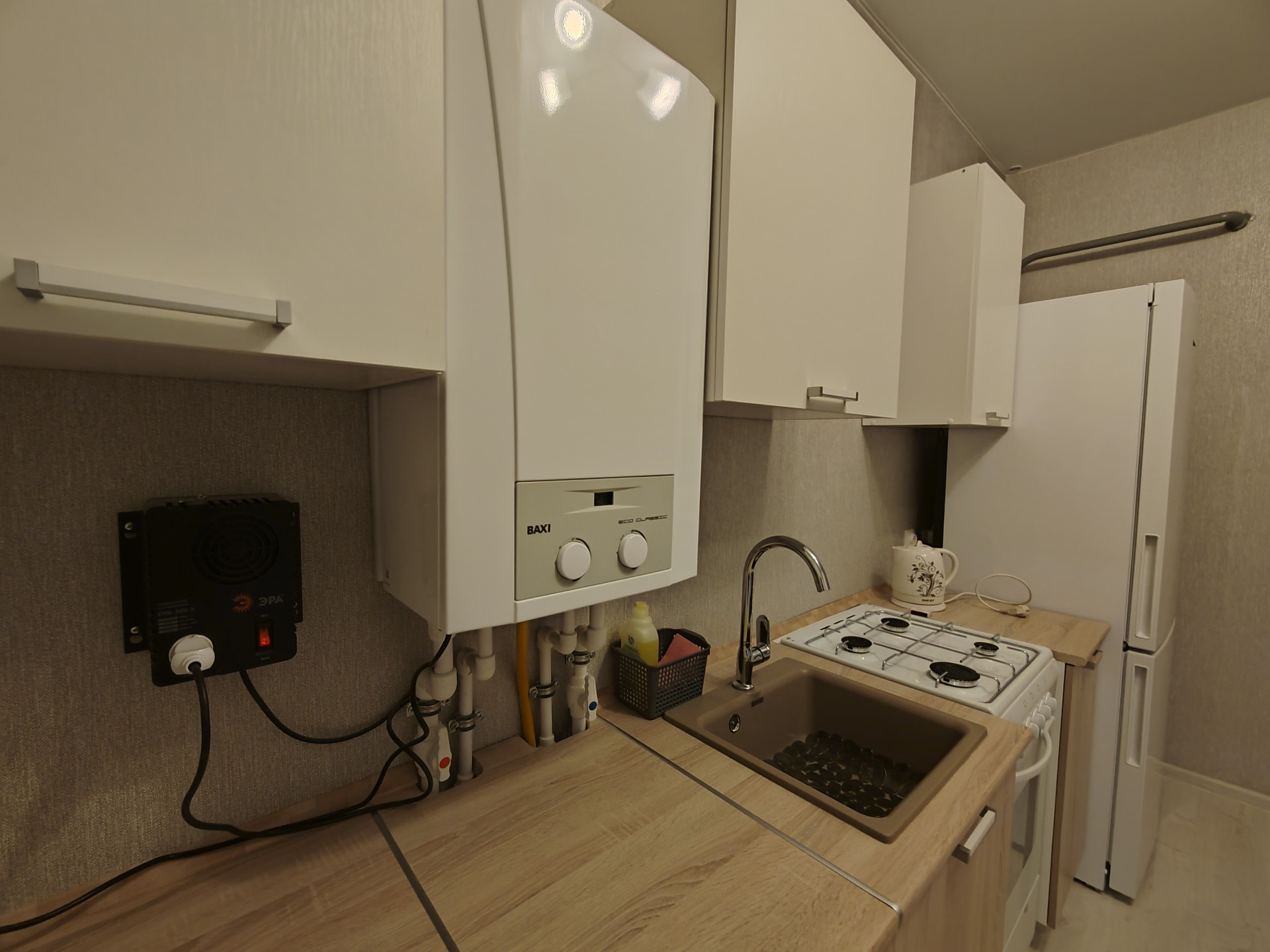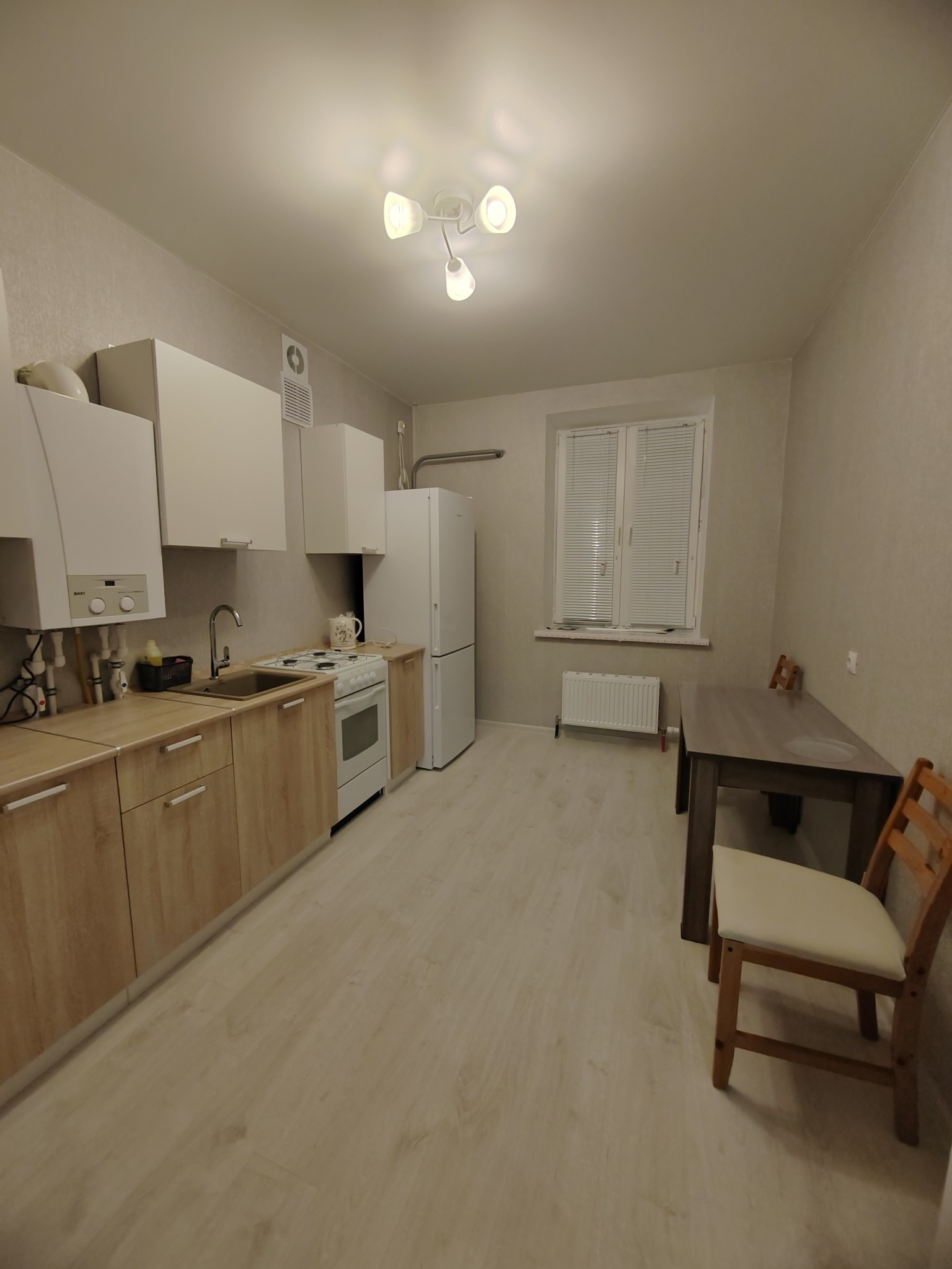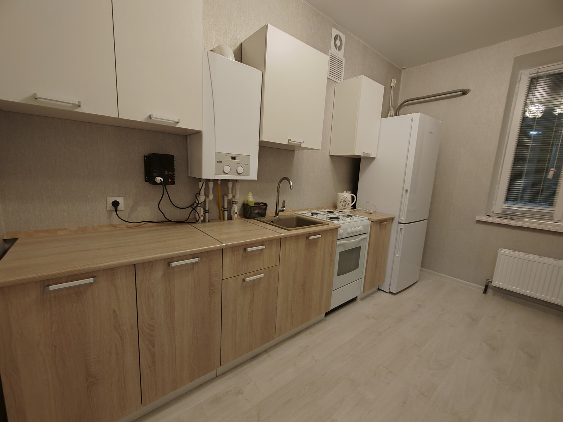 - На кухне новый кухонный гарнитур,двухкамерный холодильник,электрочайник.