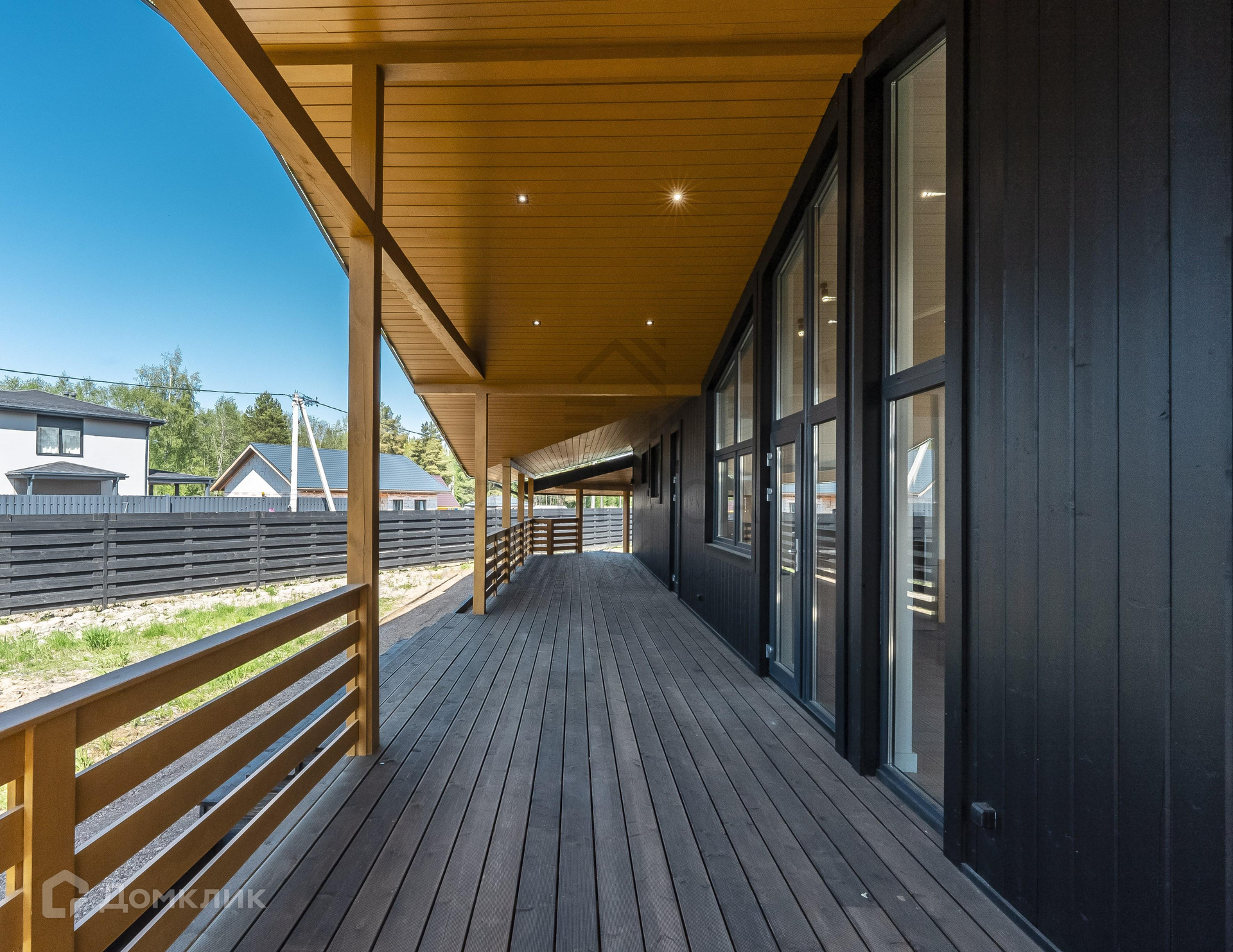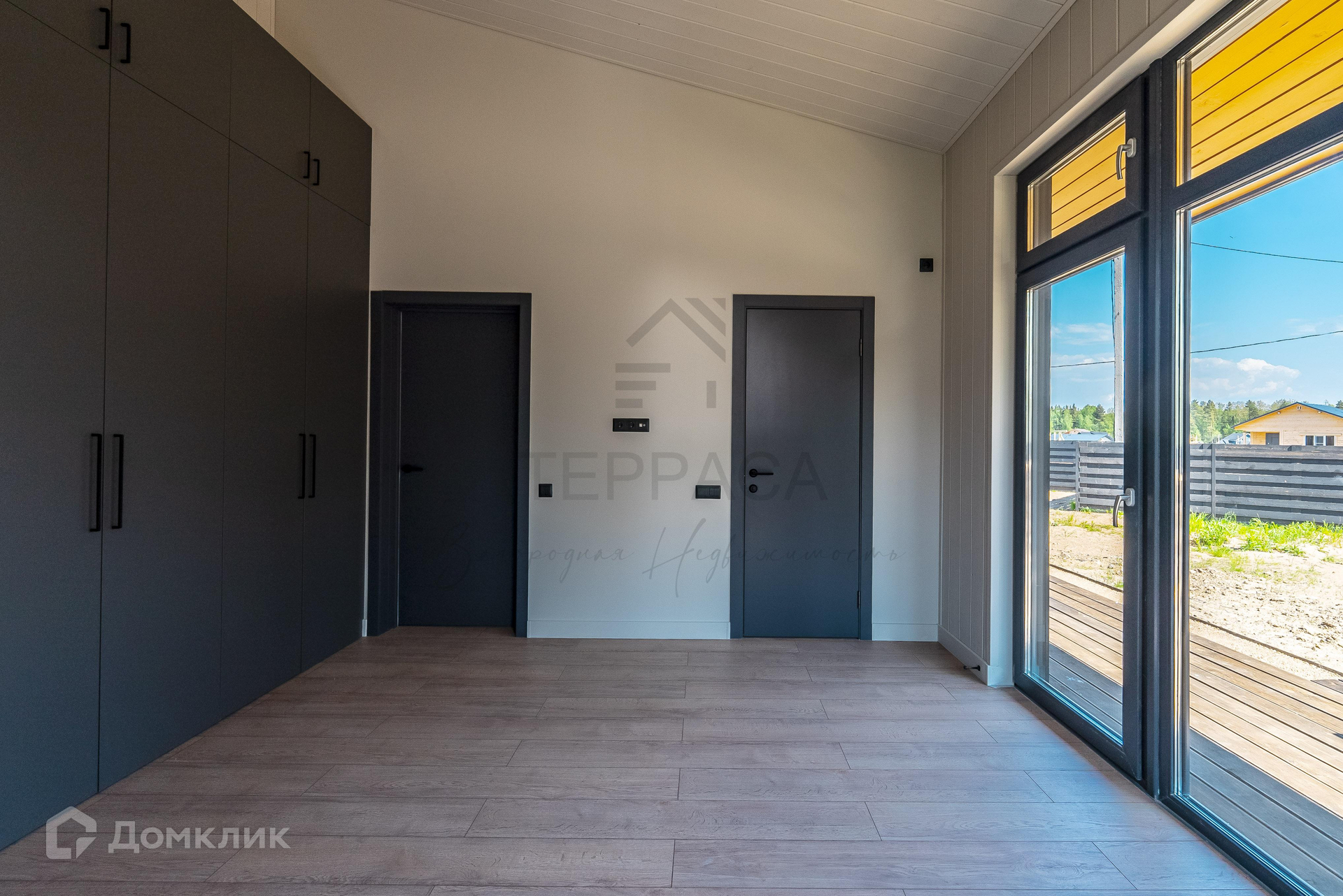 Окна и двери – 2-х камерные панорамные стеклопакеты, морозостойкий профиль «REHAU» с ламинацией. На входе стильная дверь с большой площадью остекления