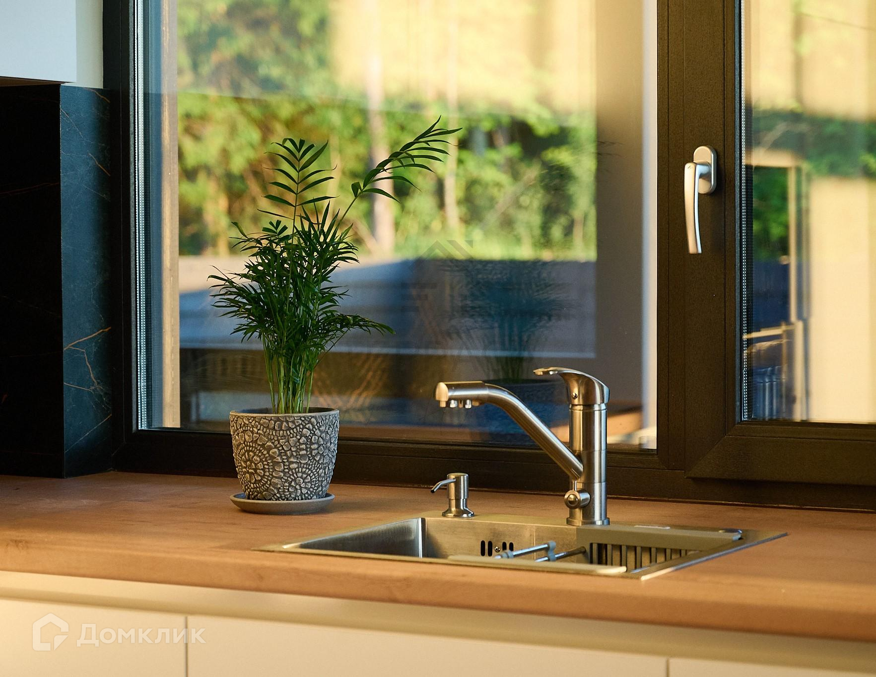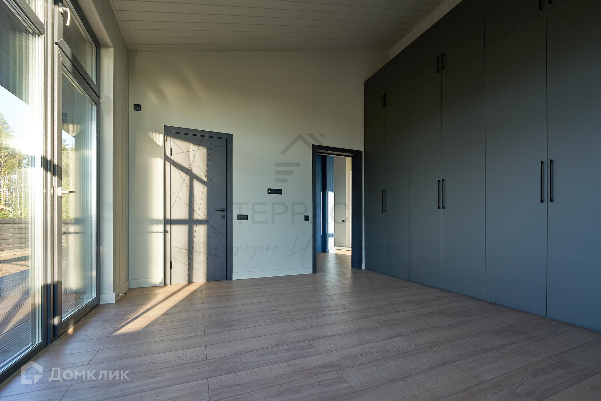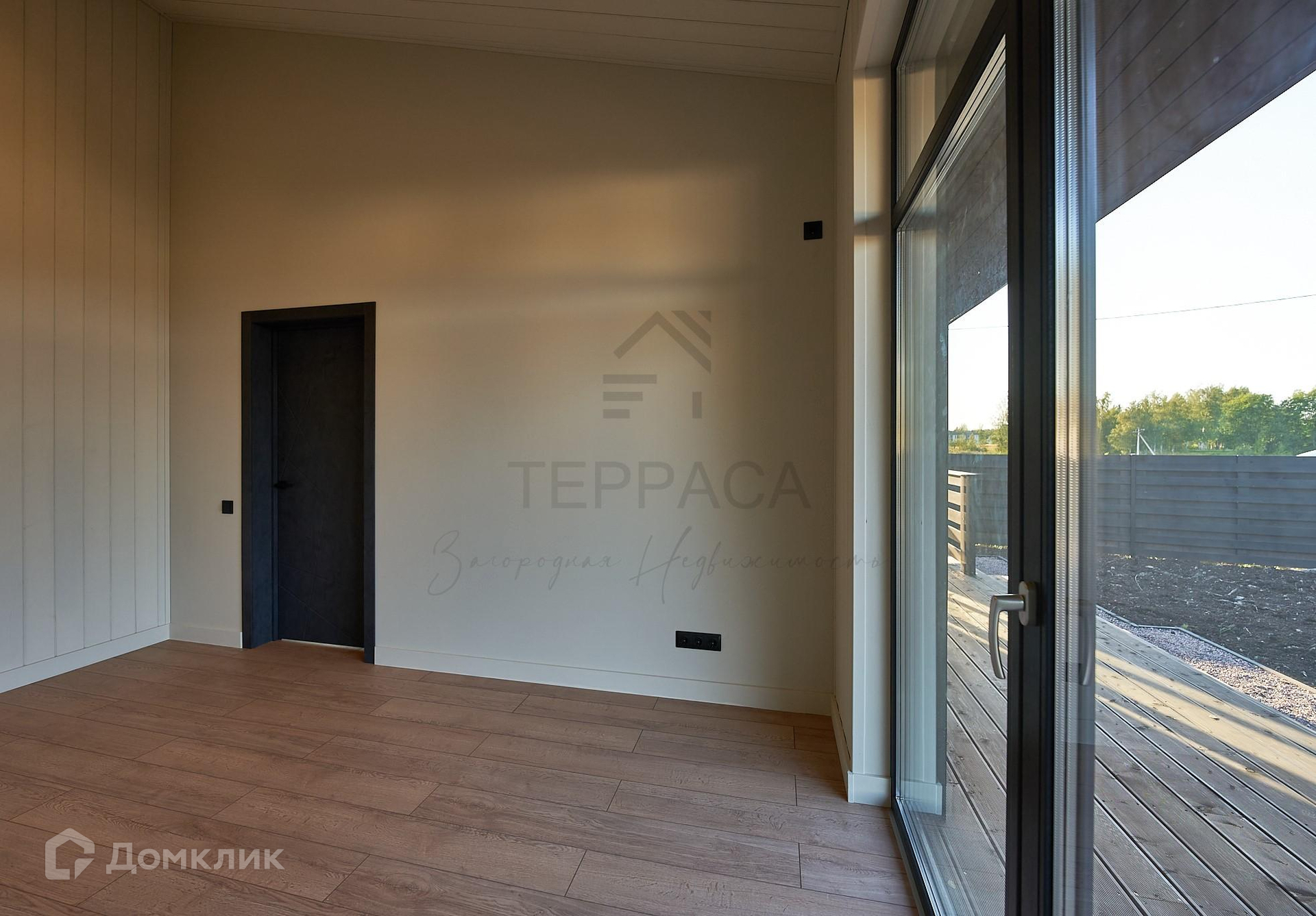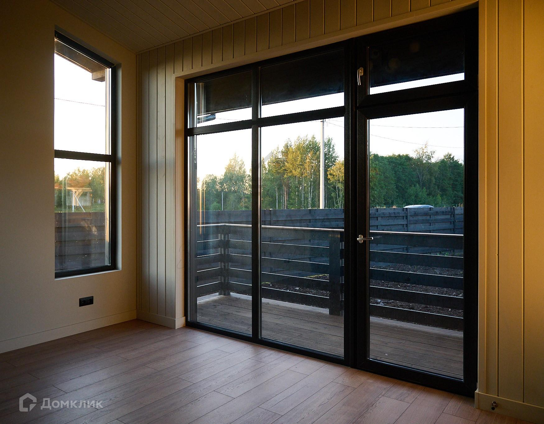 Окна и двери – 2-х камерные панорамные стеклопакеты, морозостойкий профиль «REHAU» с ламинацией. На входе стильная дверь с большой площадью остекления