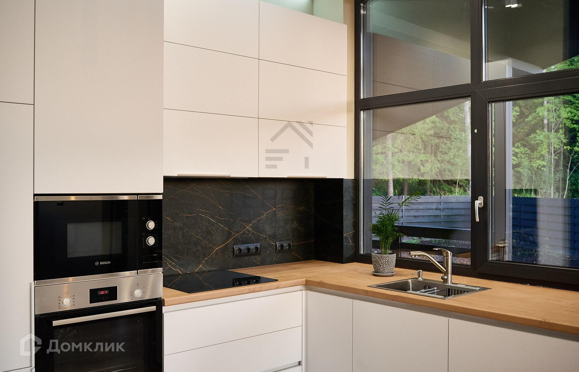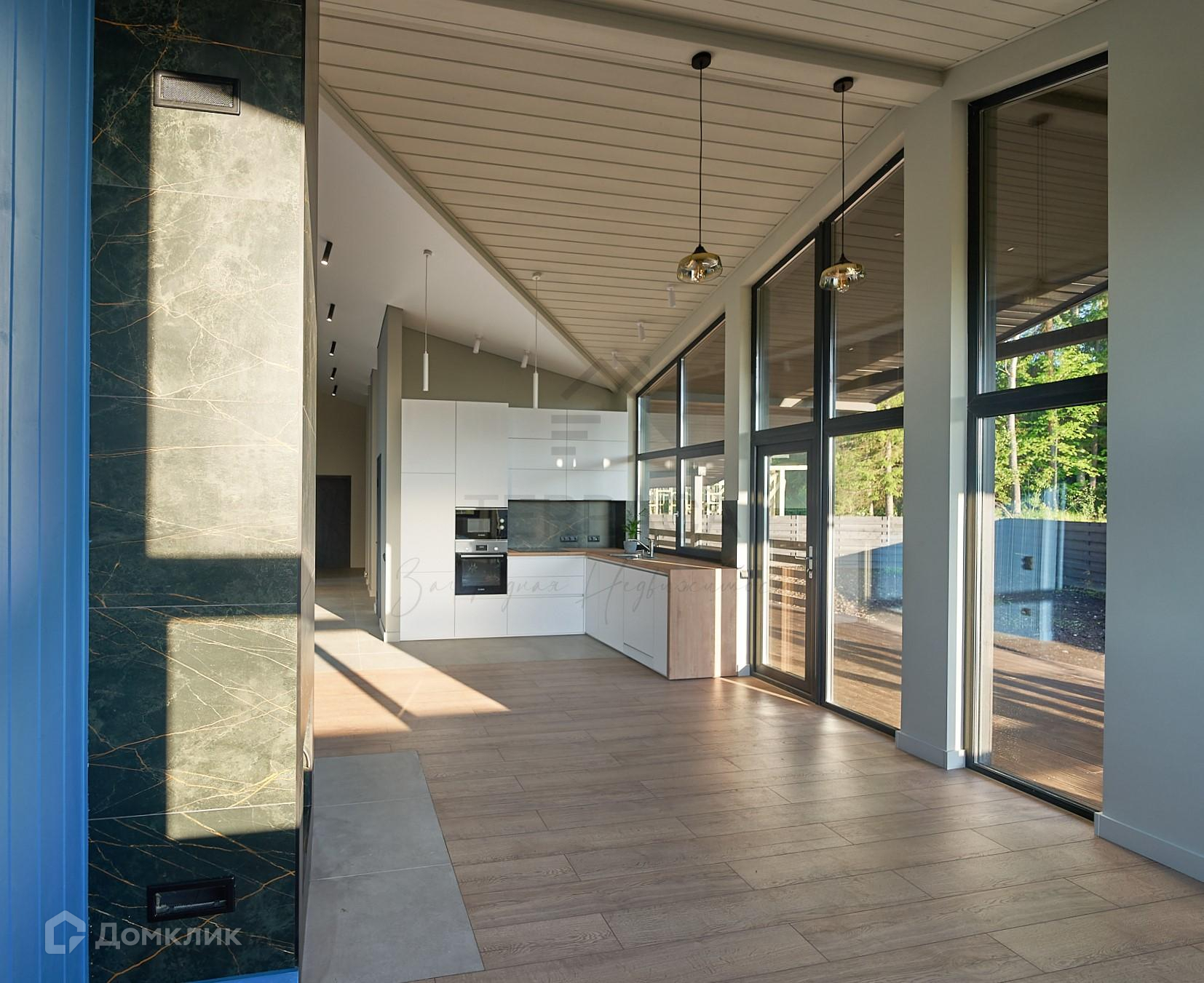 Панорамные окна в пол и второй свет. Высокие потолки (4.4 м). Теплые водяные полы. Камин. Сауна с панорамным окном. Кухня под заказ со встроенной техникой + стиральная машина, вся техника производства "BOSCH".  Большая гостевая парковка на 5 машин. Точечное внутренне и круговое фасадное освещение с ночной подсветкой. Дорожки, клумбы, газон. Грамотная планировка и качественная отделка ДОМА.