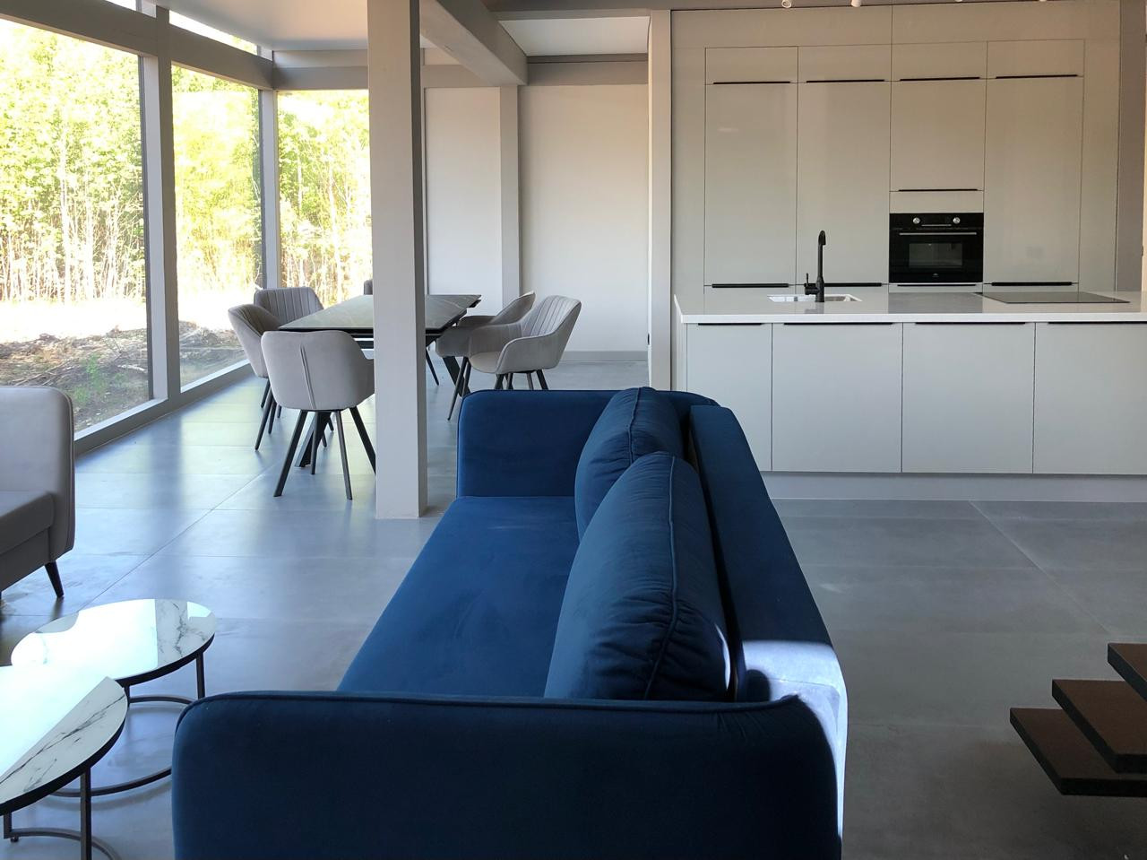 Наша фирменная отделка «бизнес». Мебель: кухня с островом, стол стулья, два дизайнерских дивана, журнальный столик, двуспальная кровать.