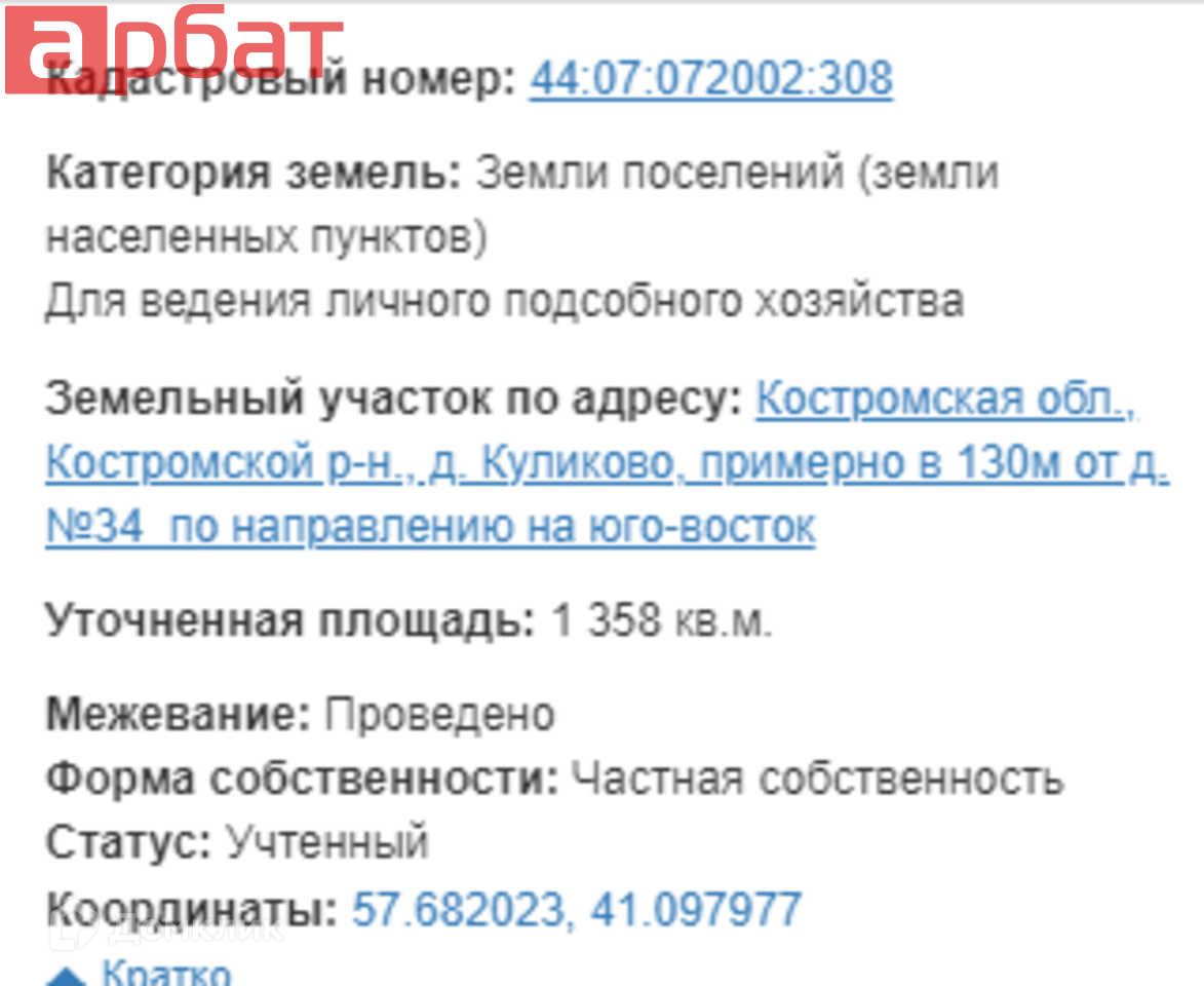 Кадастровый номер - 44:07:072002:308. ЛПХ (строиться можно, налог на землю меньше, чем на ИЖС, в остальном никаких отличий). Газ, электричество на границе участка.