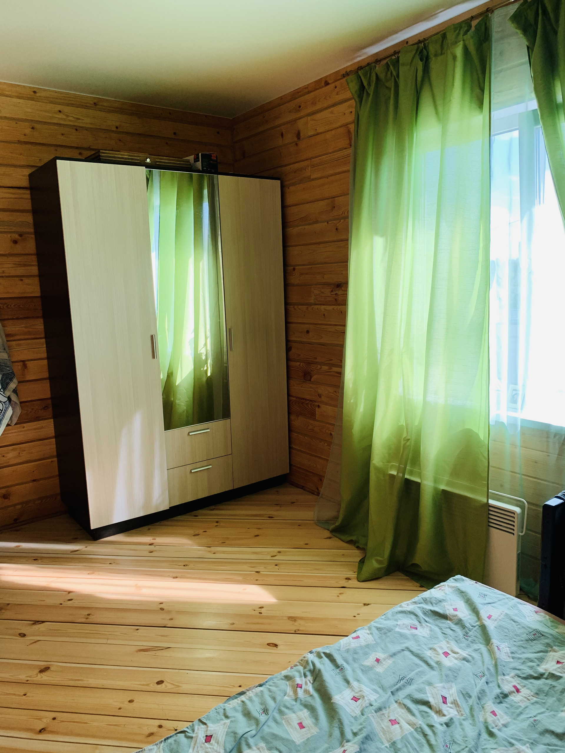 Полы из массива сосновой доски , кухня и ванная  из художественного модульного паркета . Из внутри  и с наружи дерево отшлифовано и обработано маслом .