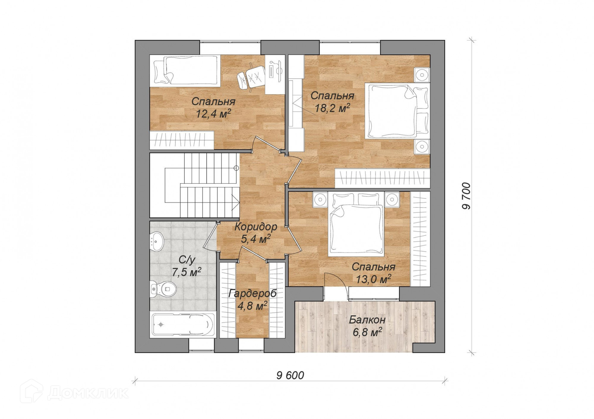 Первый этаж: в доме расположены прихожая, котельная, гостевой санузел, комната и просторная кухня-гостиная. Второй этаж: 3 спальни с выходом на балкон, второй санузел и гардеробная комната