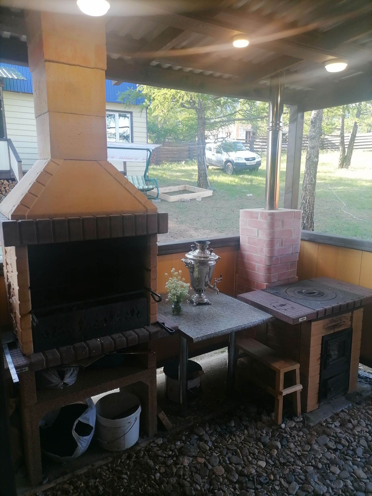 Общая площадь дома с учетом пристроя 148 кв.м. Второй дом в один этаж 6*6 м, к дому пристроен вагончик с 2 спальными местами, а также летняя терраса с мангалом, столом-гриль, печью для казана.