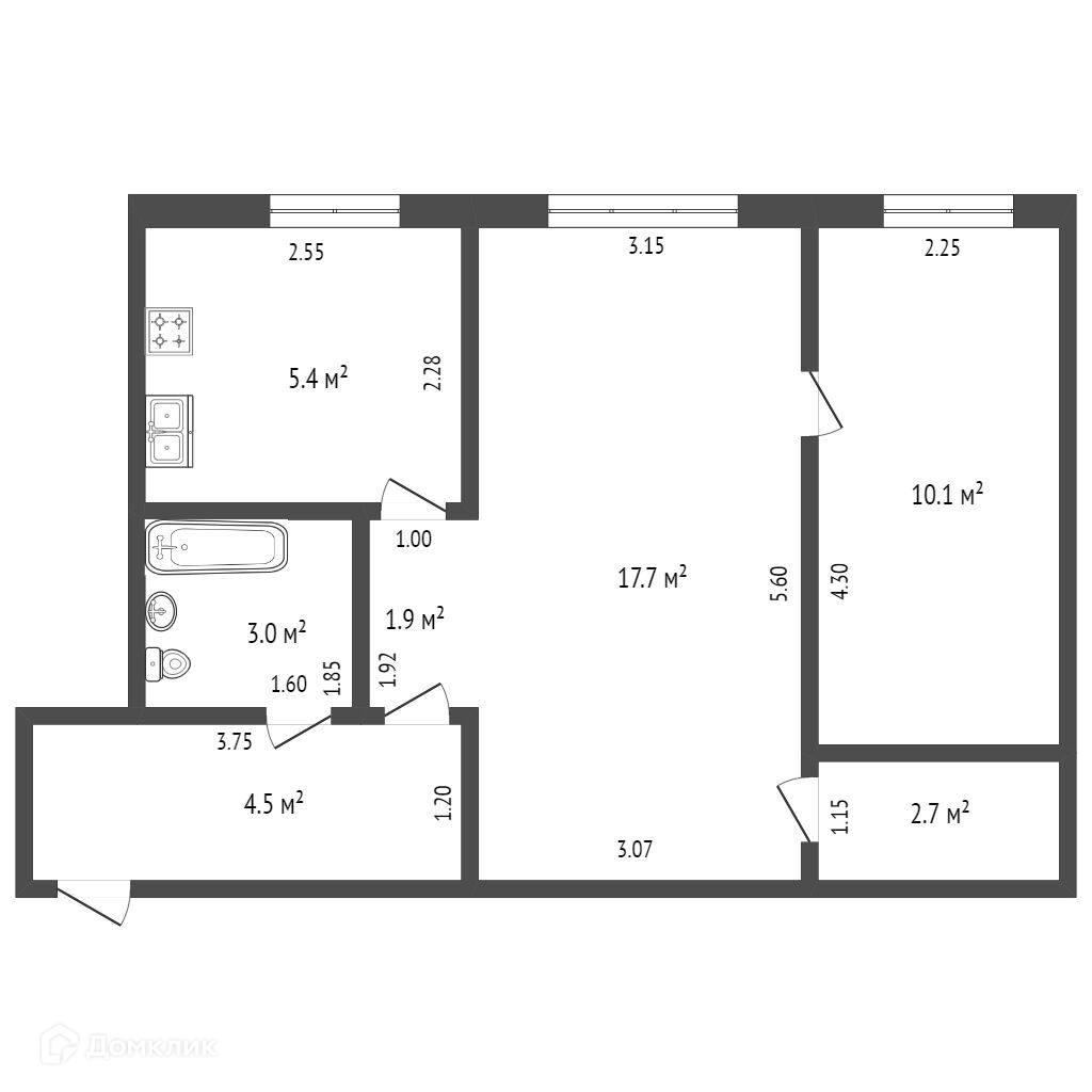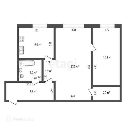 Общая площадь 45.3 м2