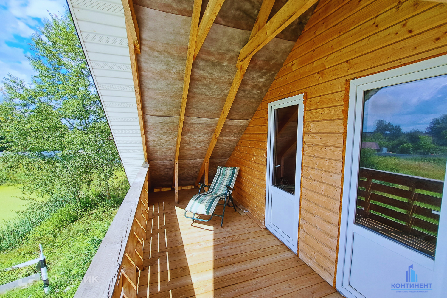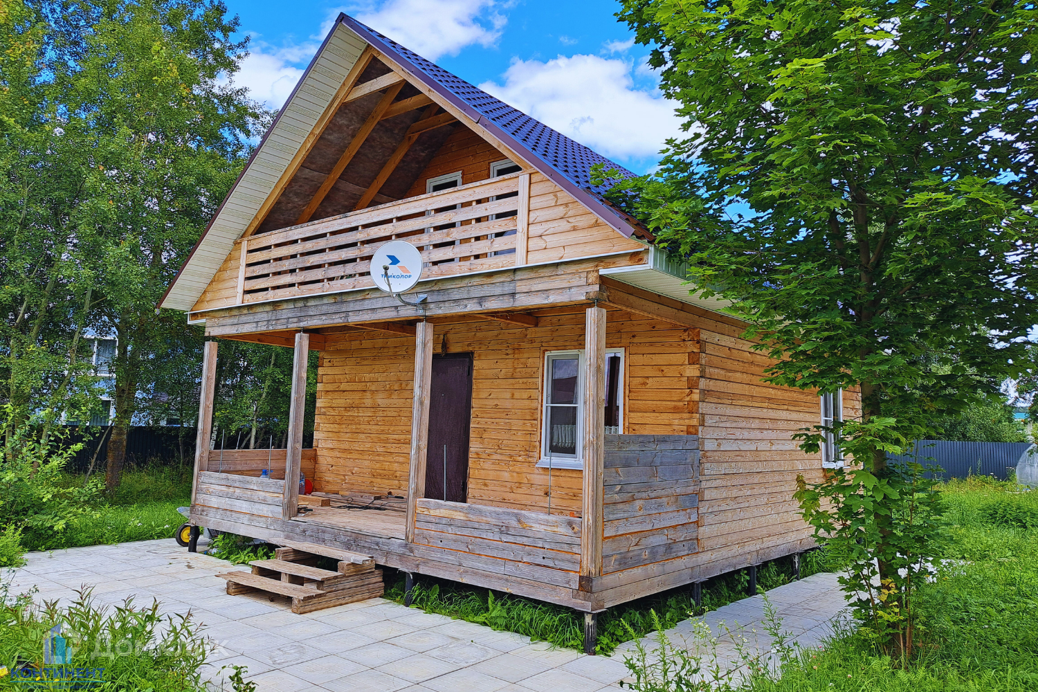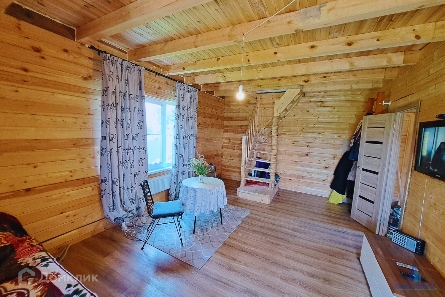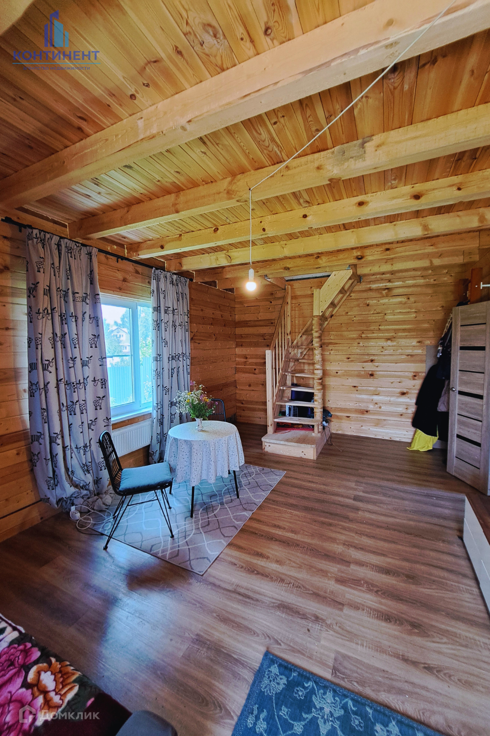 Дом изготовлен из бруса. Фундамент свайный. Первый этаж - гостиная, кухня, ванная и котельная. Мансардный этаж - две спальни с выходом на балкон. Вся мебель и техника остаётся!