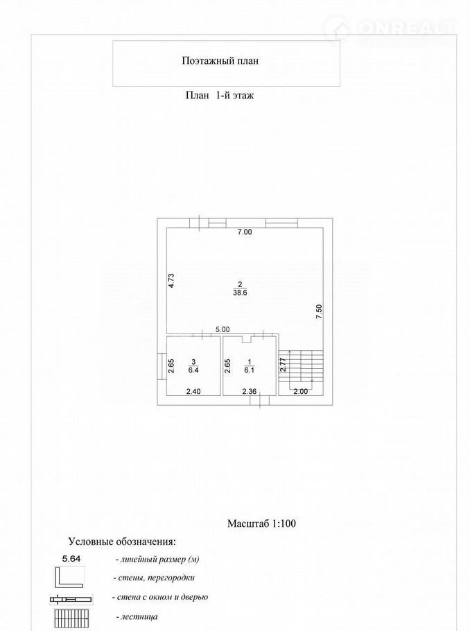 1 этаж - прихожая (6,1м), кухня-гостиная (38,6м), сан узел (6,4м).
