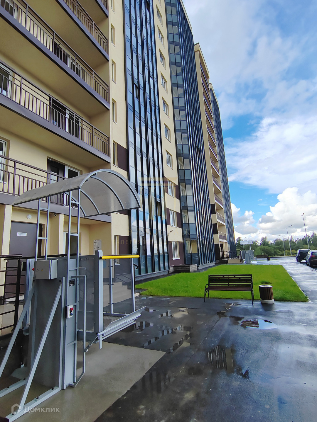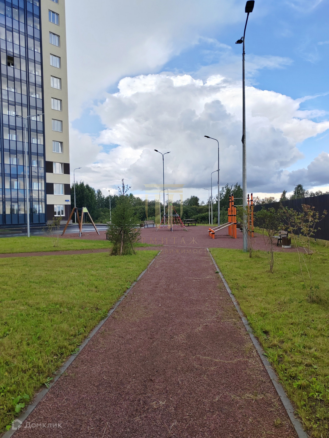 - Дом не "высотка", всего 12 этажей и 4 парадных. Во дворе установлена площадка с современным комплексом снарядов и тренажеров для детского спорта и развлечений. Выполнено благоустройство - установлены лавочки, урны и озеленение двора - высажены деревья, кустарники, цветы и газон.