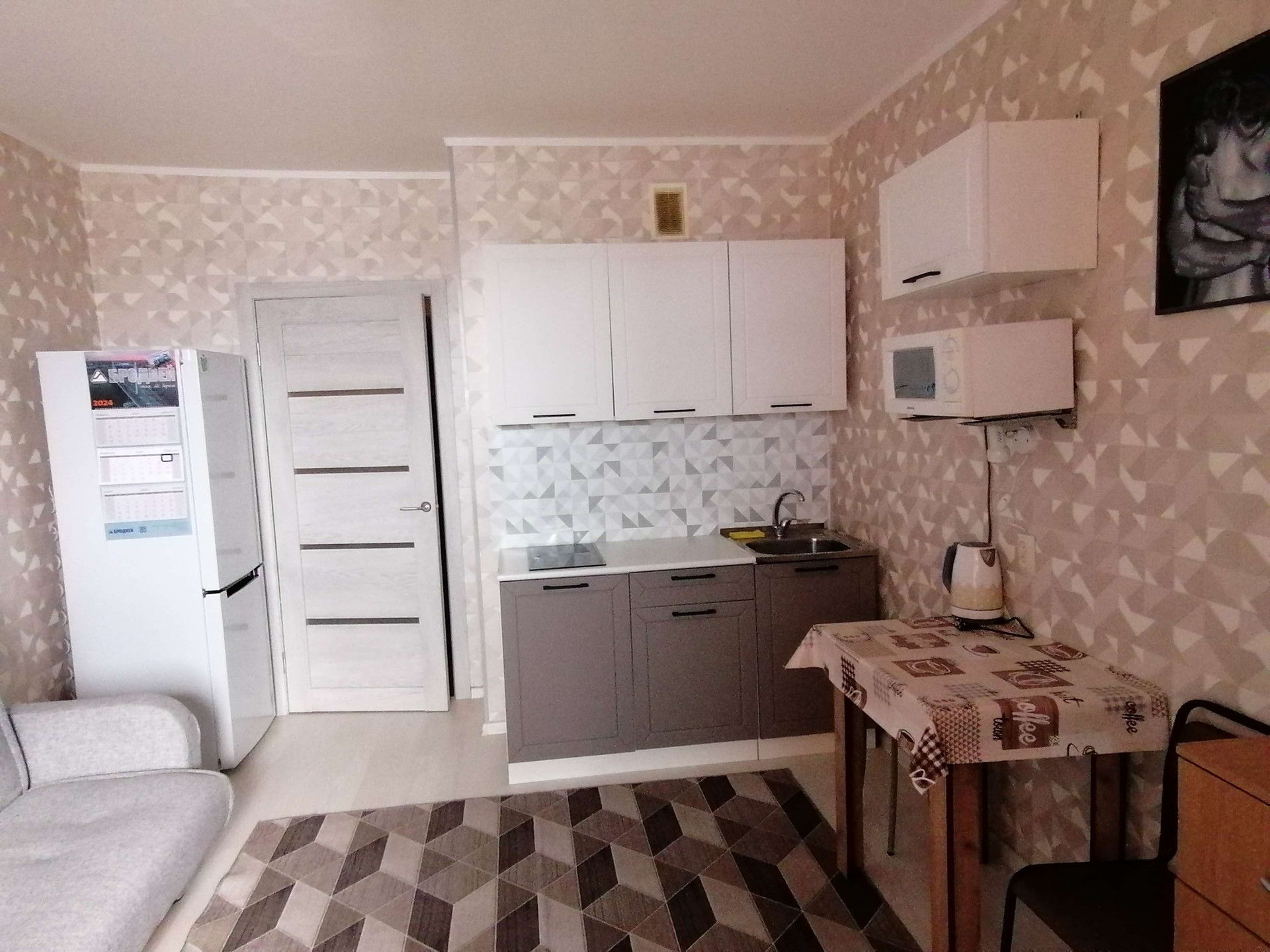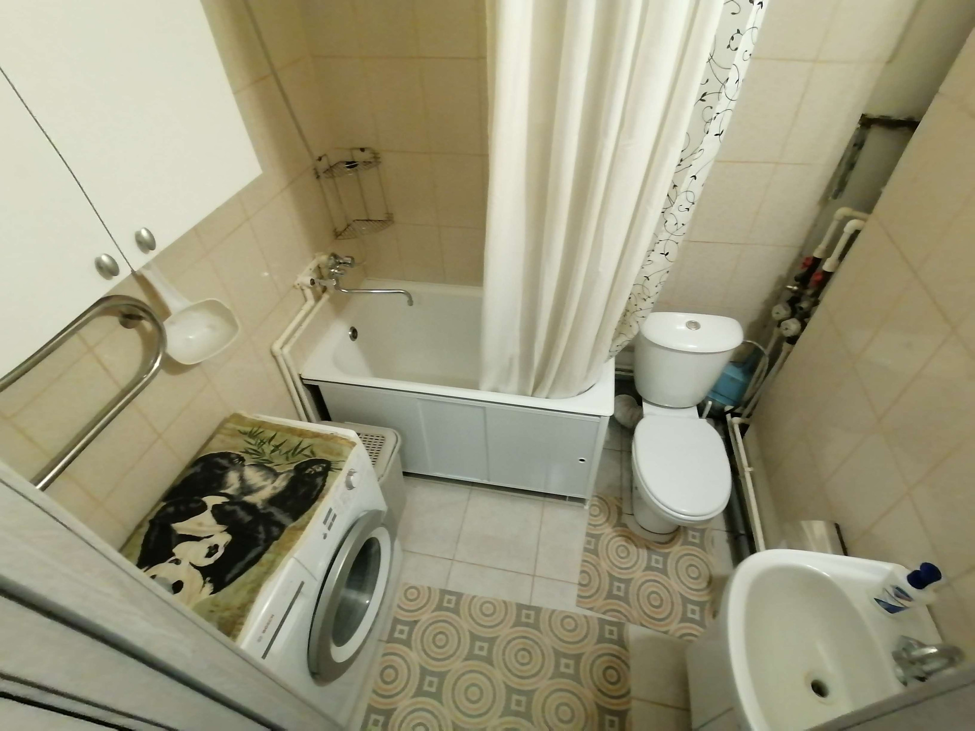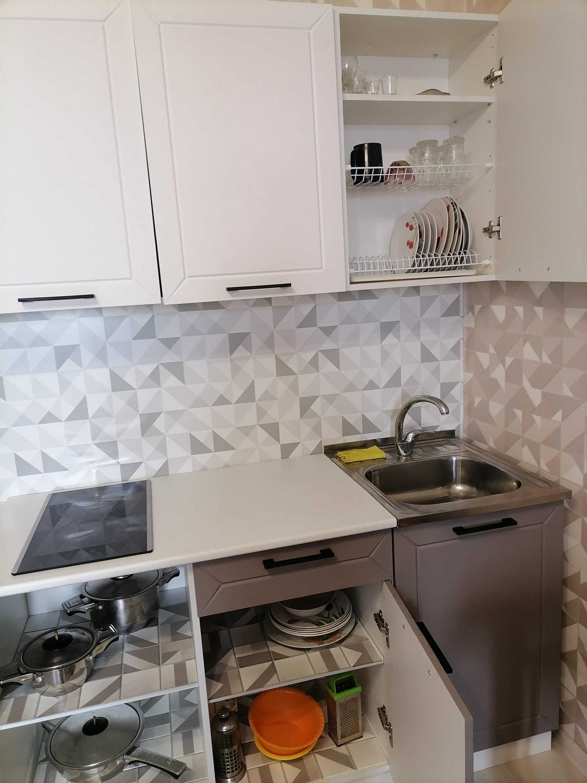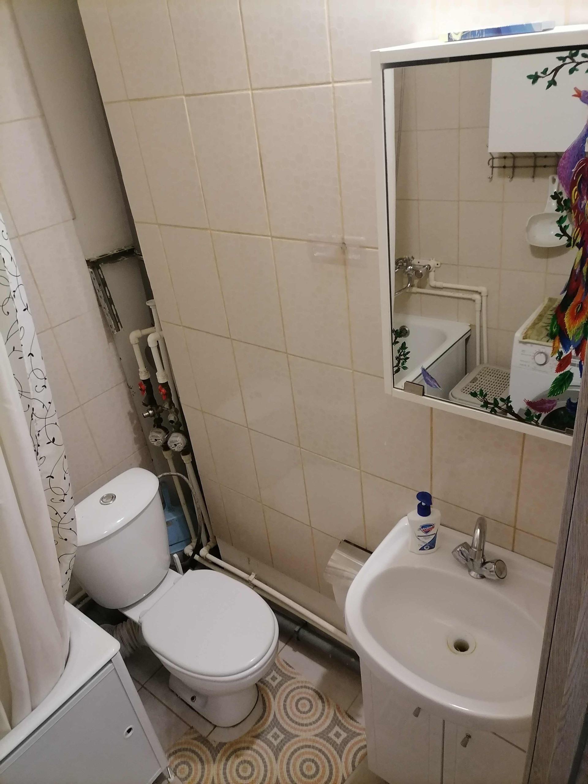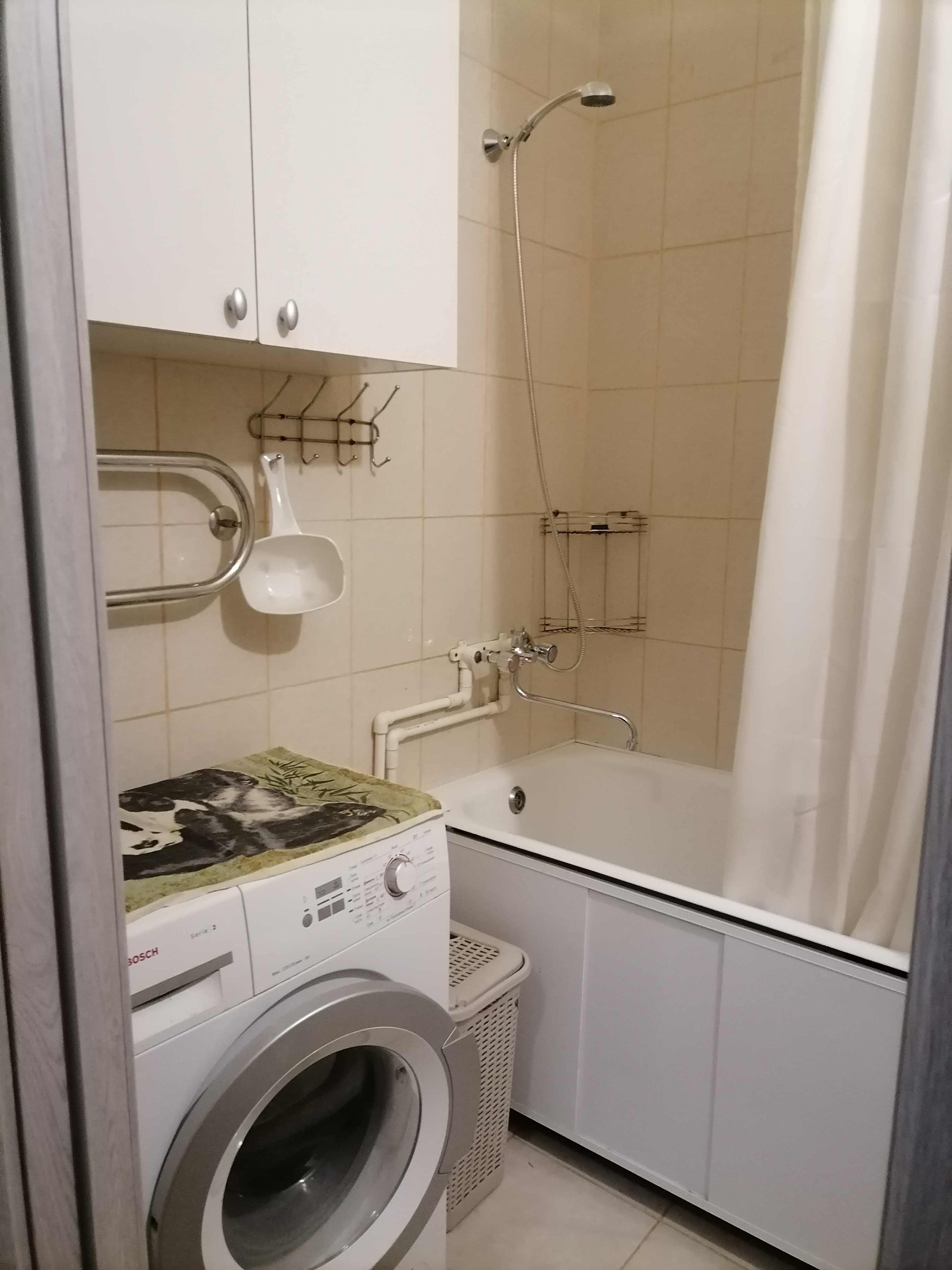 Всё необходимое для проживания есть: стиральная машина, холодильник, чайник, микроволновка, плита, посуда.