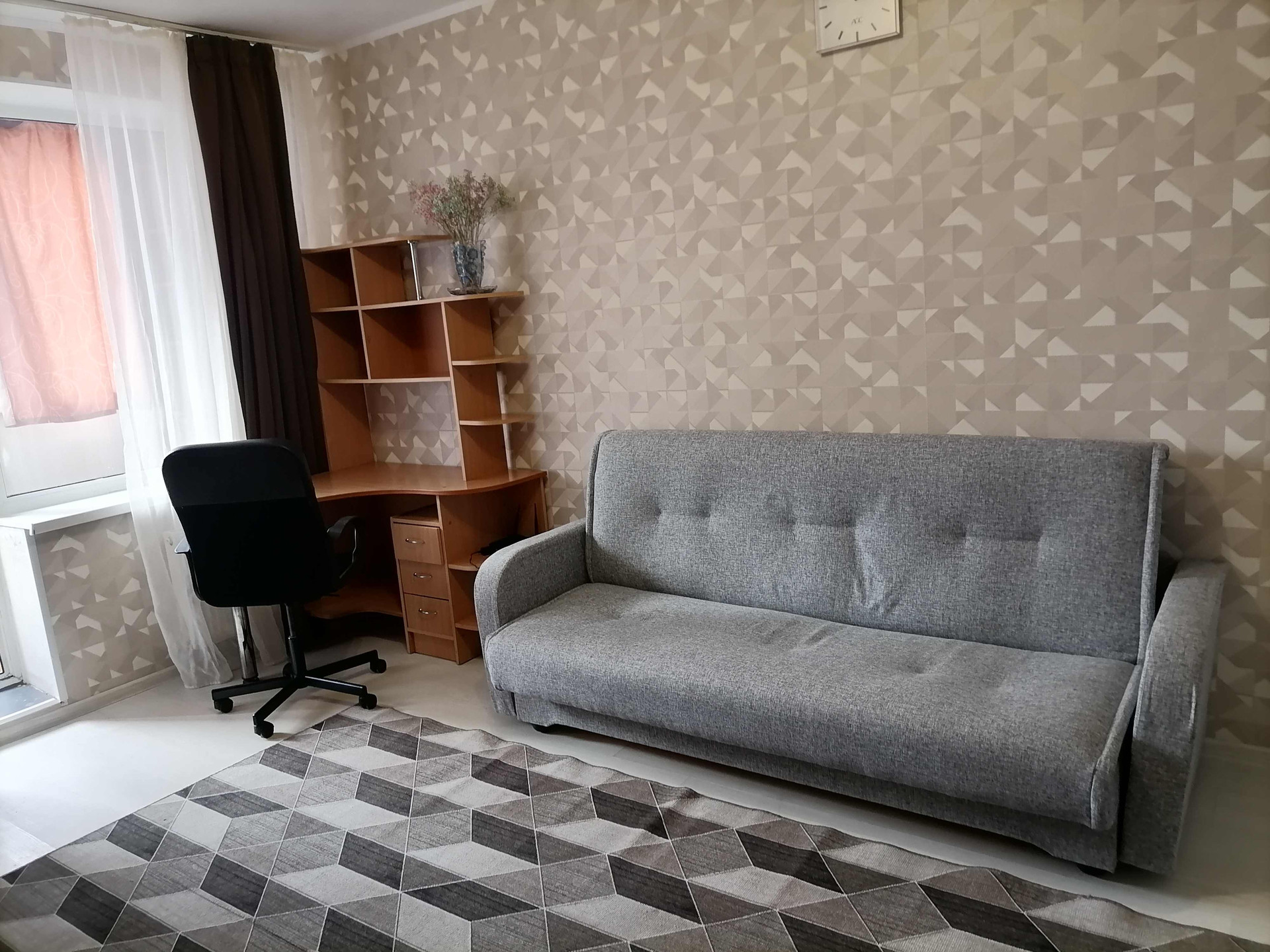 В комнате оборудовано рабочее место - компьютерный стол, кресло.