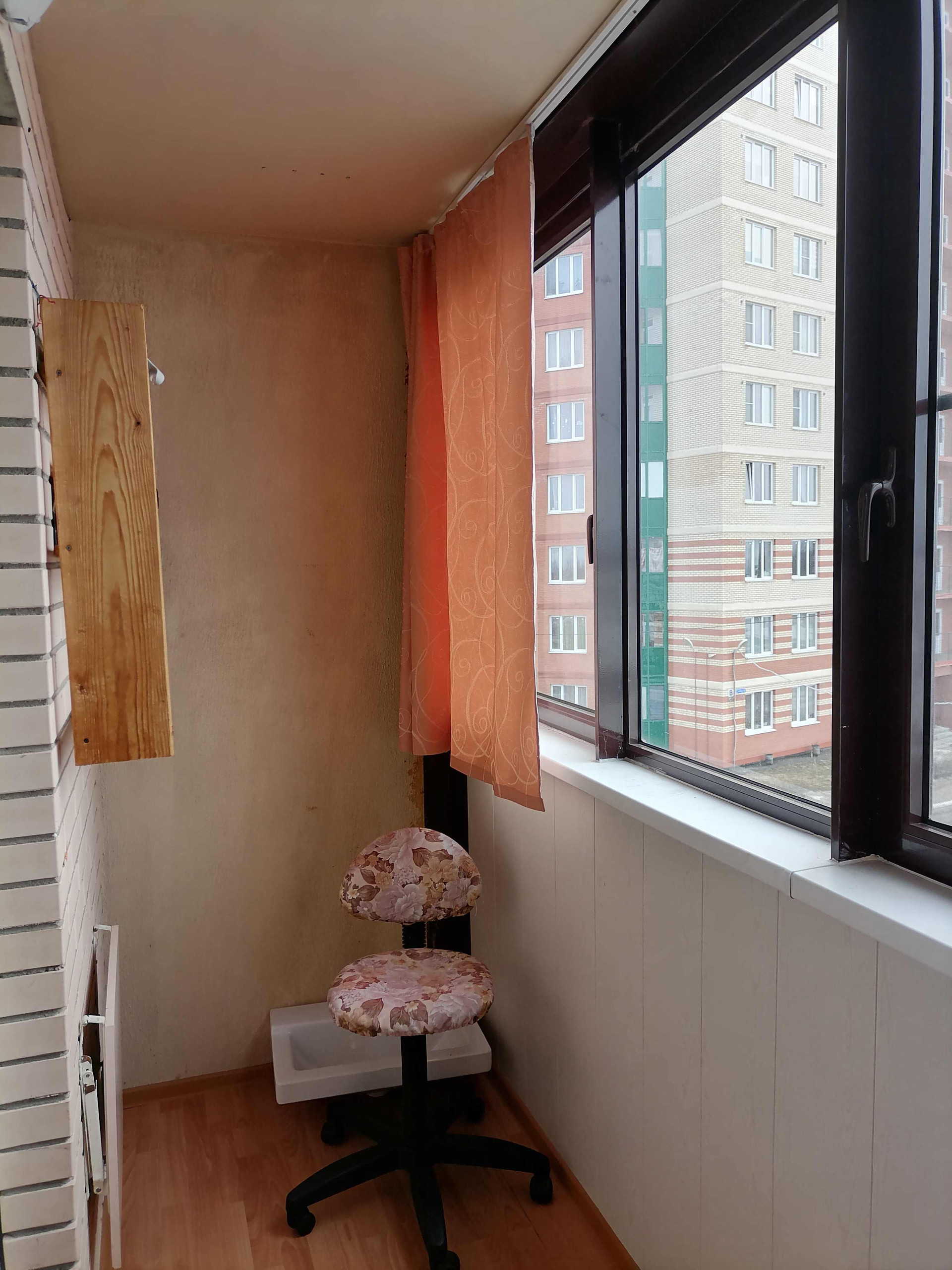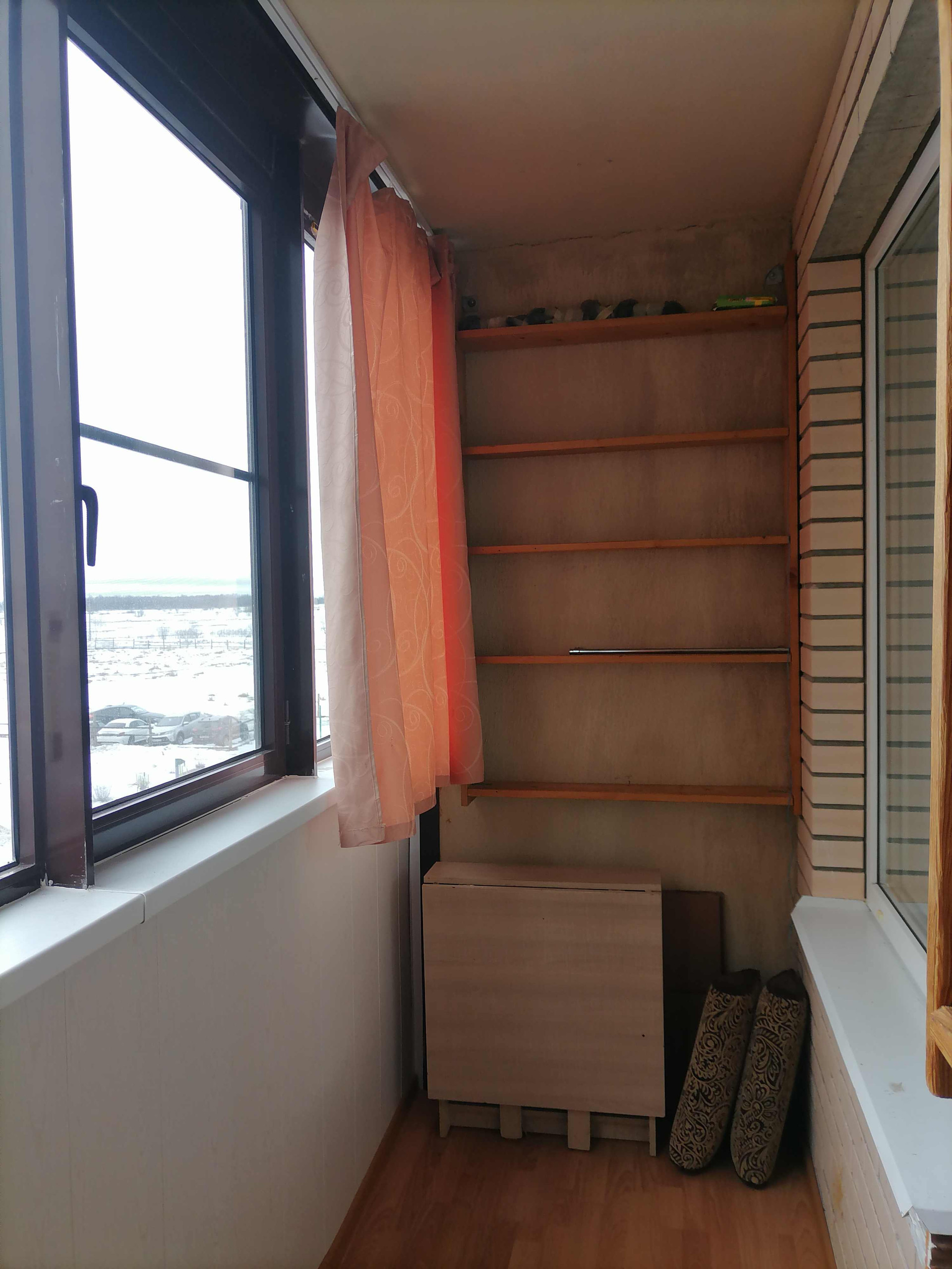 Балкон чистый, на полу - ламинат; установлены подоконники, стеллажи на стенах.