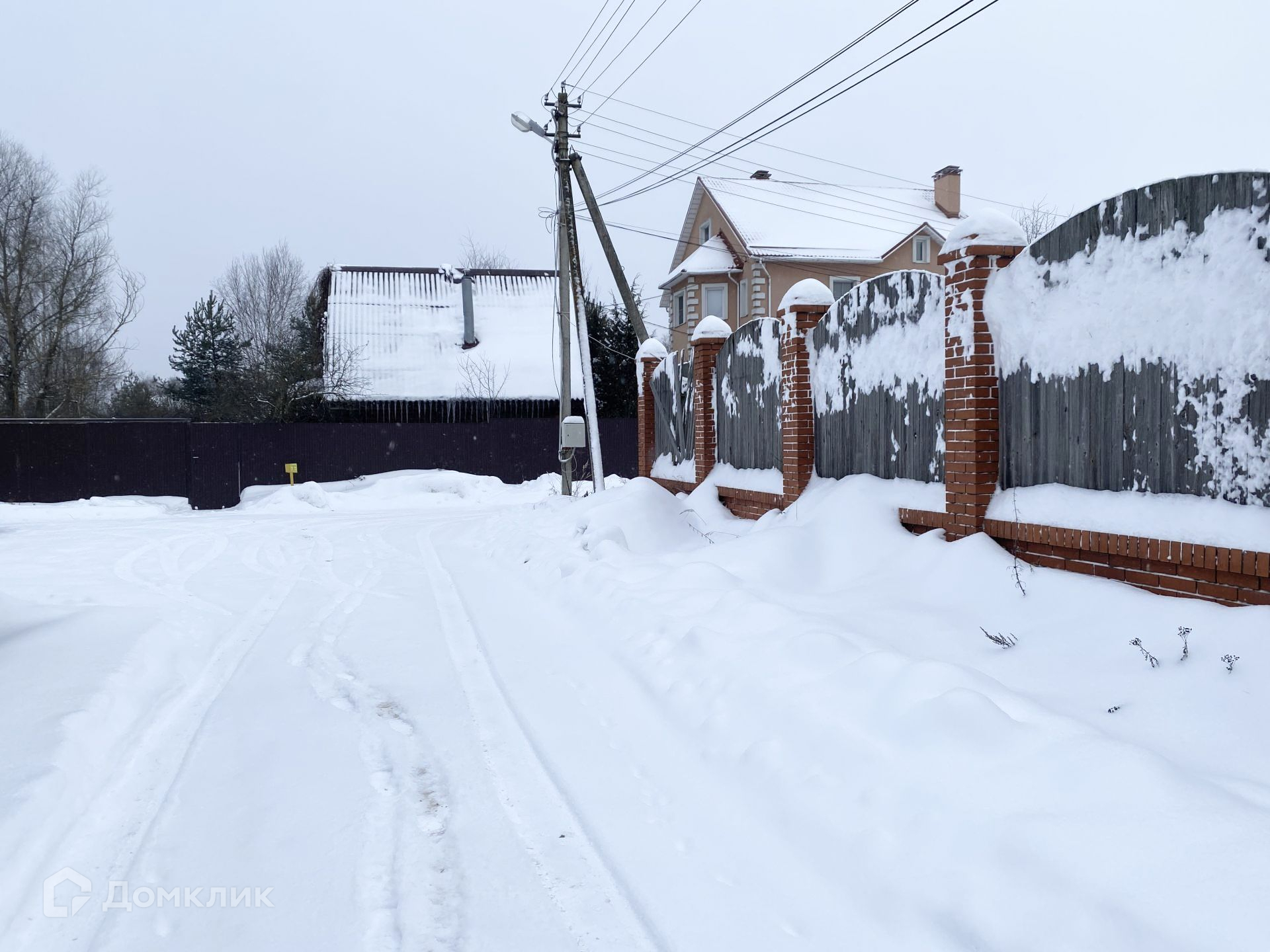 Забор капитальный - кирпичные столбы с фундаментом и деревянными секциями.