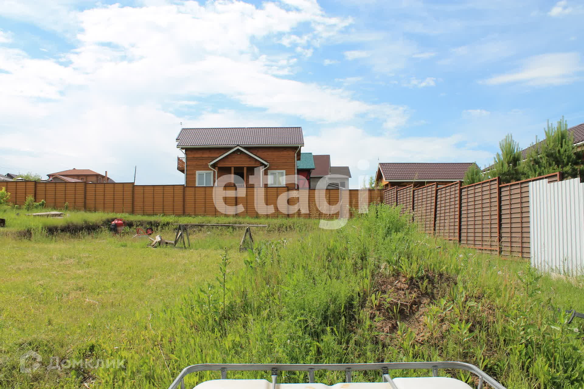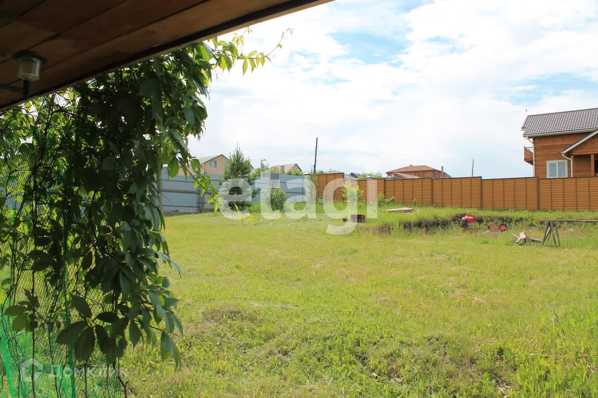 Участок частично разработан, присутствует небольшой уклон, имеются насаждения: сосны, калина, жимолость, яблони, вишня, слива.