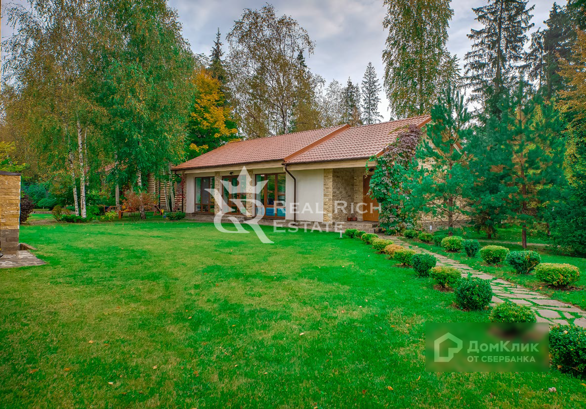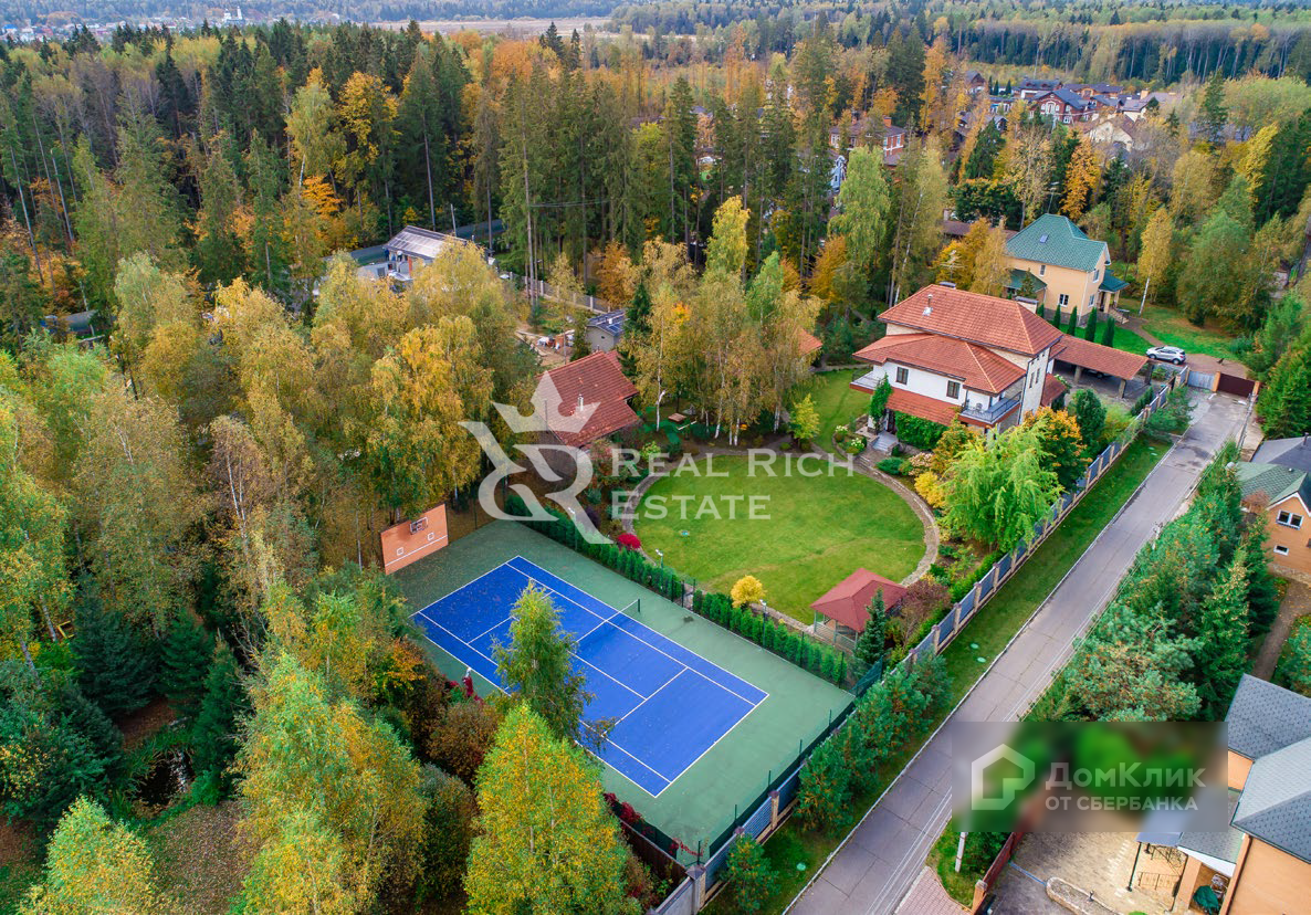 Дом: Дом расположен на лесном участке 60 соток. Одна часть участка -теннисный корт, вторая - с красивым ландшафтным дизайном. Также на участке построен гостевой дом с баней и двумя спальнями. Гараж на 2 автомобиля и помещение для персонала.