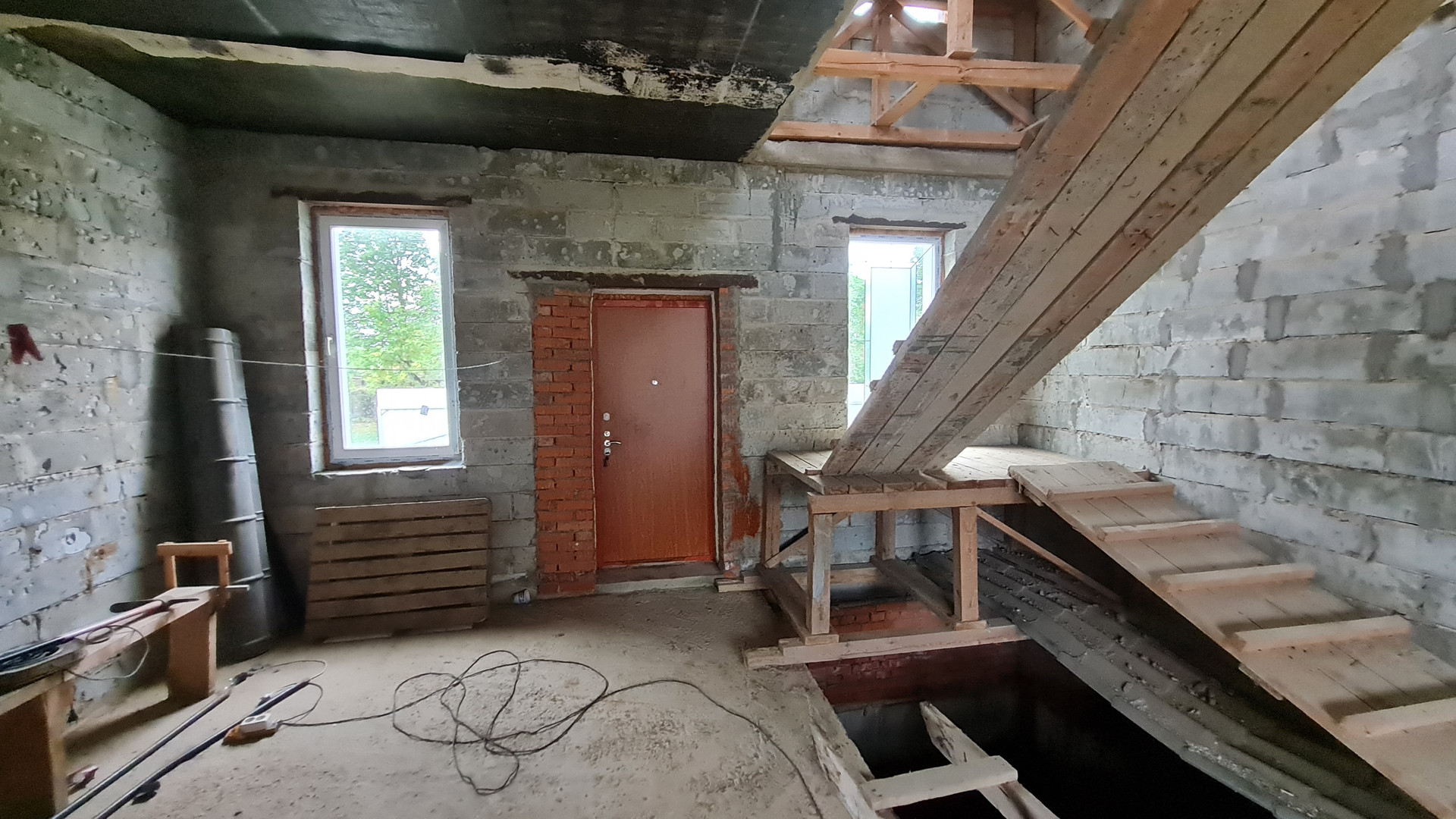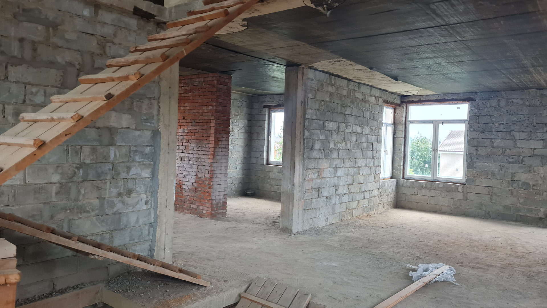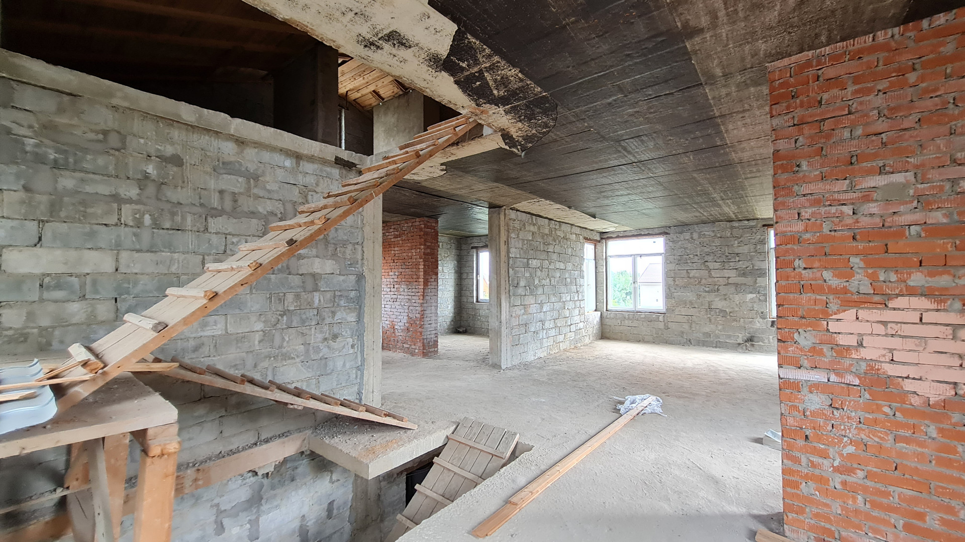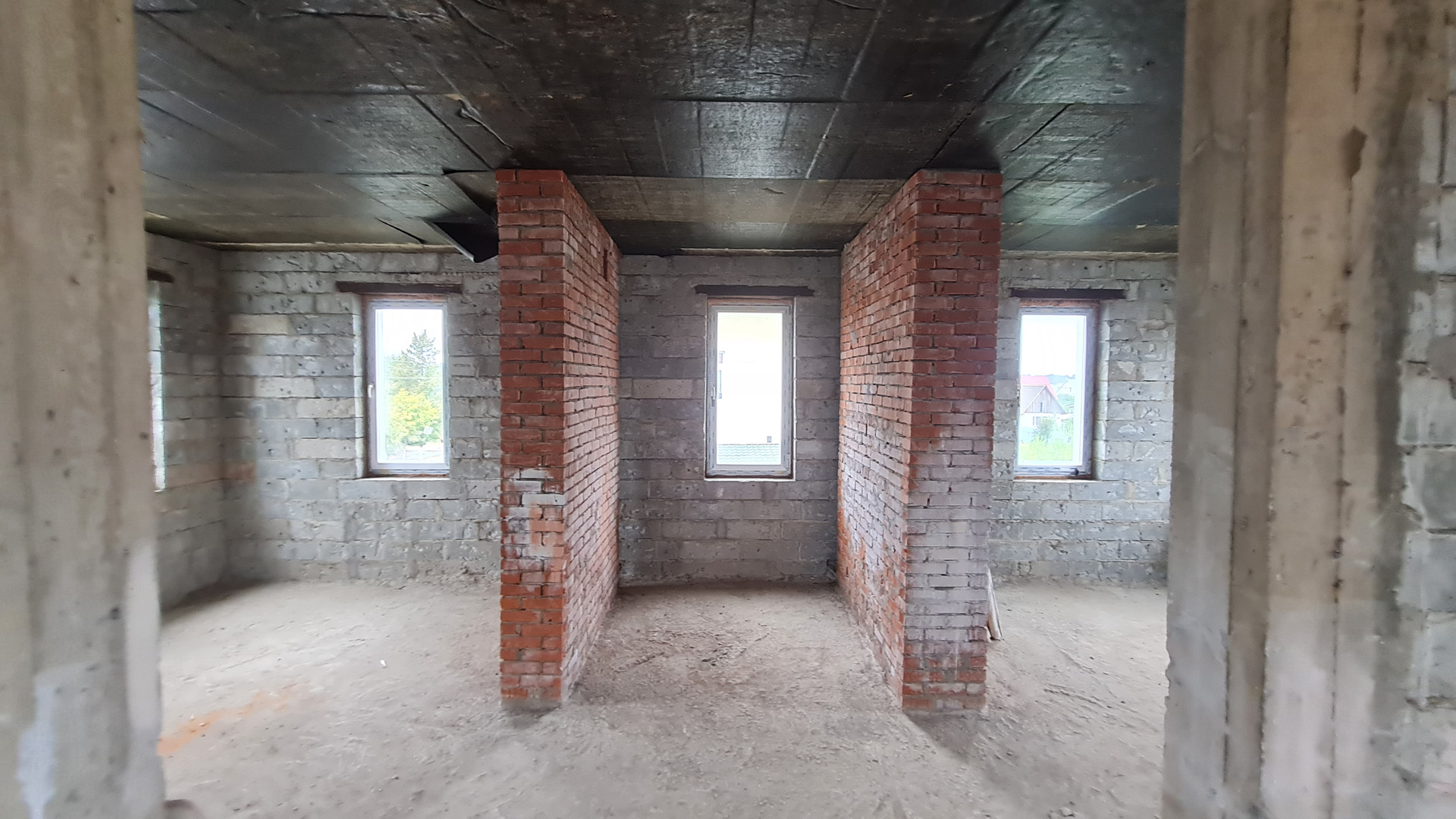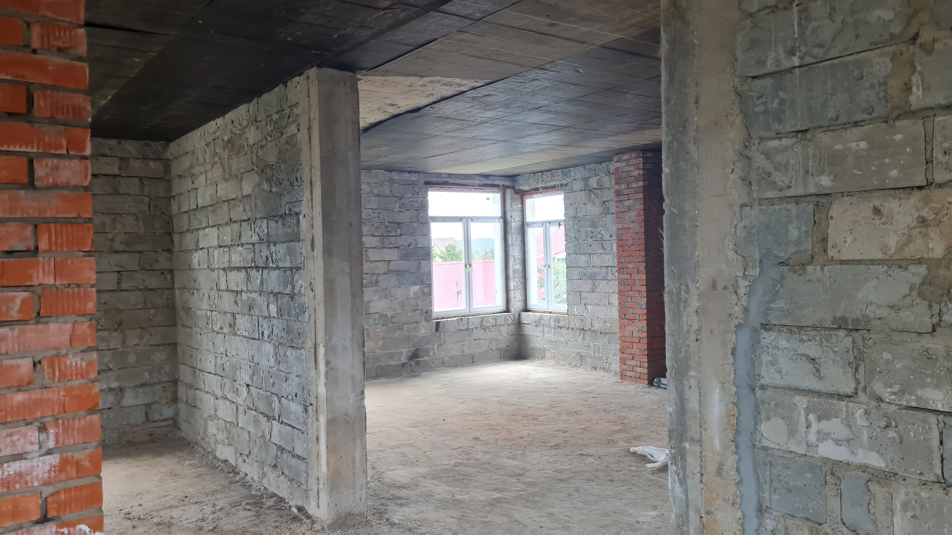 Два жилых этажа 240 кв.м. + 1 мансардный + 1 цокольный (с окнами). Каждый этаж около 110 кв.м. Всего 400 кв.м. + закрытый теплый паркинг пристроен к дому. Материал стен кирпич, железобетонный каркас, монолитные перекрытия, сплошной монолитный фундамент, внутренние стены кирпич, газобетон. Свободная планировка, без отделки.