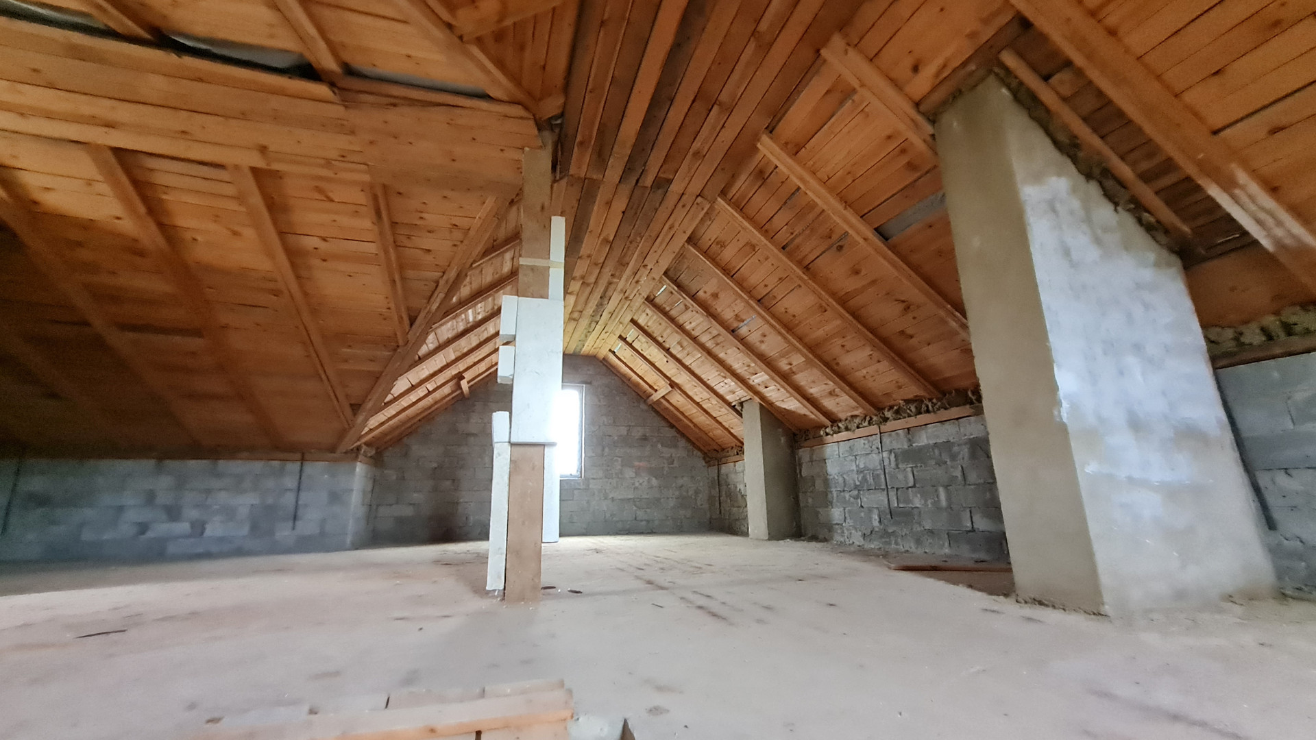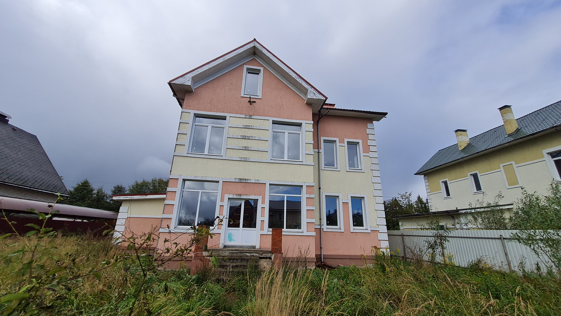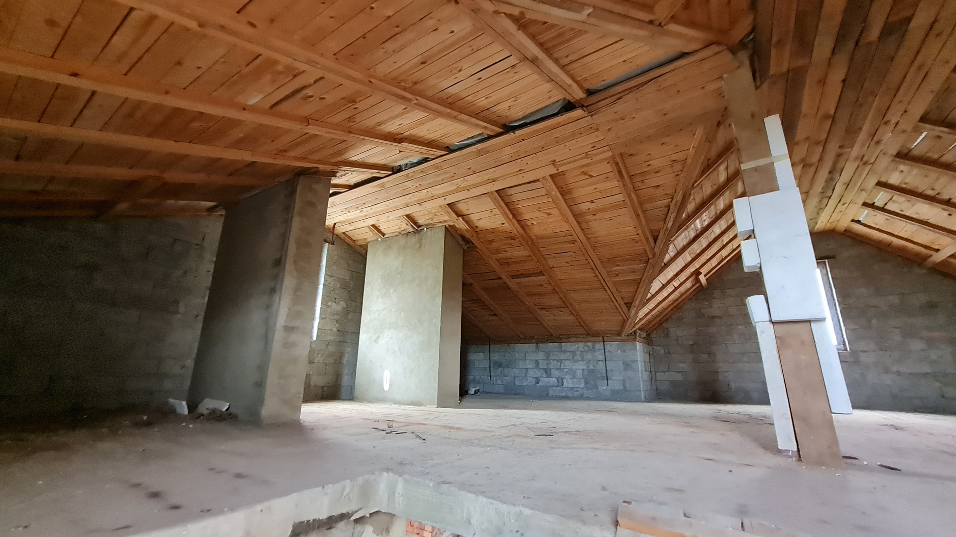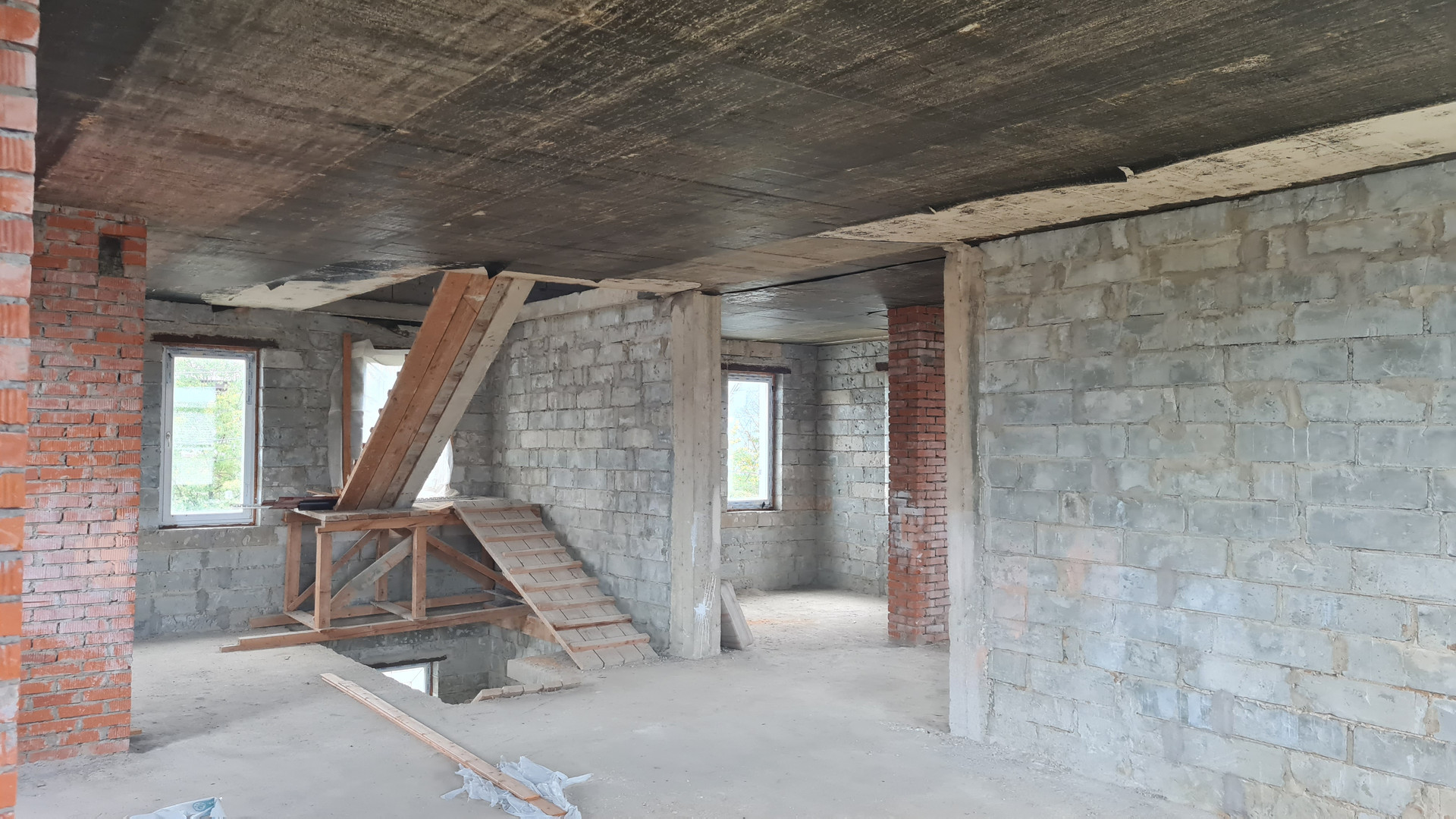 Два жилых этажа 240 кв.м. + 1 мансардный + 1 цокольный (с окнами). Каждый этаж около 110 кв.м. Всего 400 кв.м. + закрытый теплый паркинг пристроен к дому. Материал стен кирпич, железобетонный каркас, монолитные перекрытия, сплошной монолитный фундамент, внутренние стены кирпич, газобетон. Свободная планировка, без отделки.