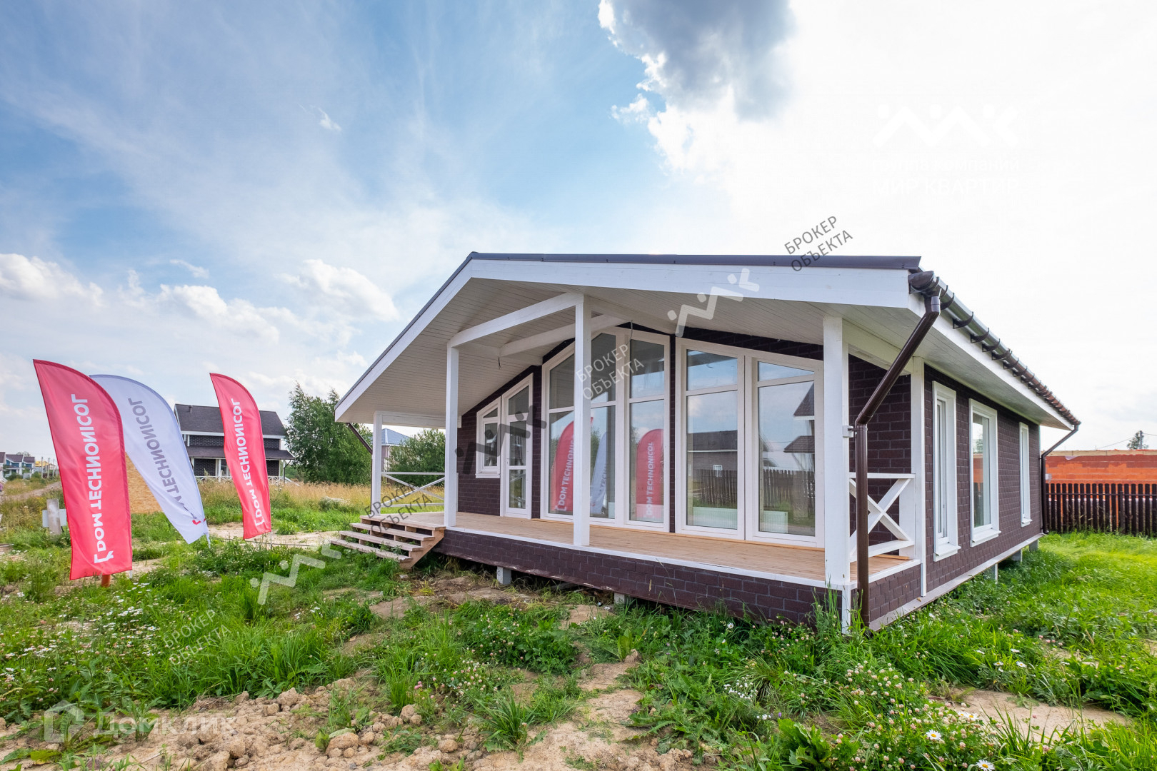 Территория коттеджного поселка занимает 3 Га и разделена на 74 участка размером от 5 до 6,5 соток. Вид разрешенного использования земли — ИЖС. На данных участках и предлагаются уже построенный или в процессе возведения дом. Дом построенный по каркасной технологии размер дома с учетом террасы — 12 на 9,15 м, общая площадь дома — 109,8 кв. м. из них терасса 26,16 кв.м. продается либо: