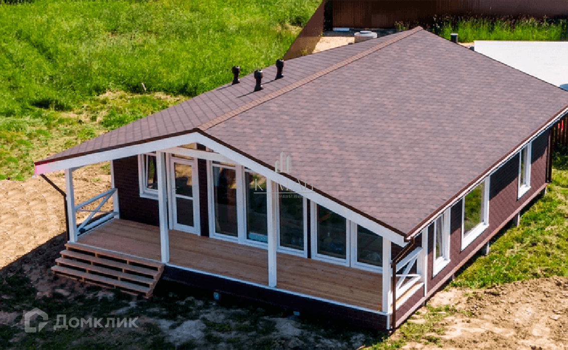 Каркасная технология строительства с внутренней чистовой отделкой (Пол: ламинат, санузел — кафельная плитка. Стены: имитация бруса, санузел — кафельная плитка. Натяжные потолки. Электрика: встроенные светильники, выключатели, розетки. Сантехника: радиаторы отопления. Вода: скважина.  Локальная канализация: септик Эл. мощность 15 кВт.