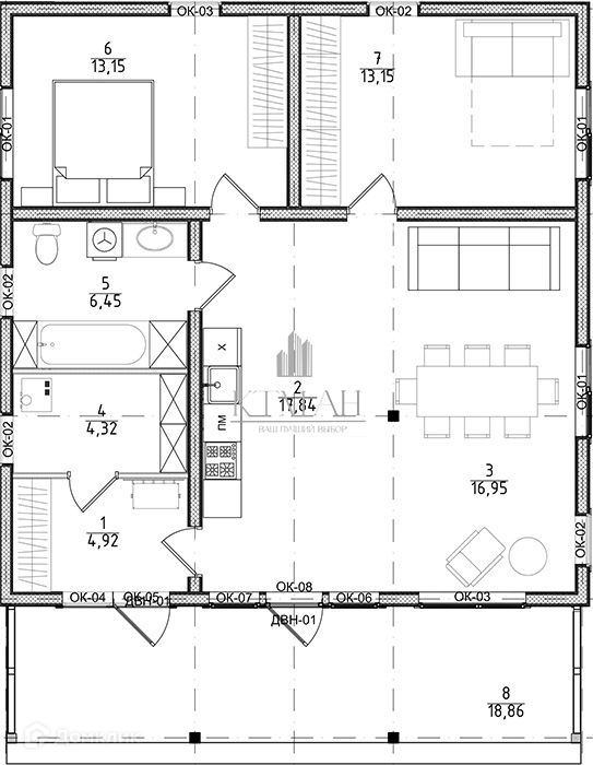 Общая площадь дома 92.5 кв.м. Кухня-гостиная 34.79 кв.м. Две спальни по 13.15 кв.м. Совмещенный санузел 6.45 кв.м. Гардеробная 4.32 кв.м. Прихожая 4.92 кв.м.