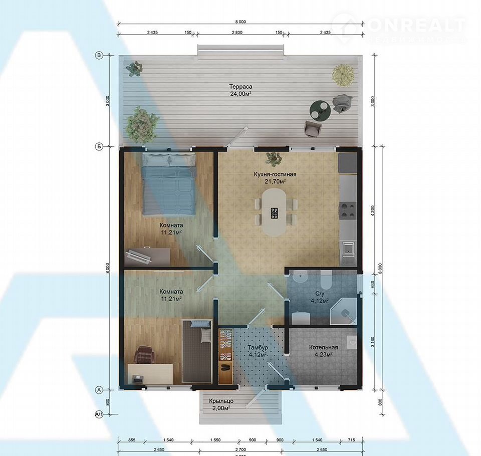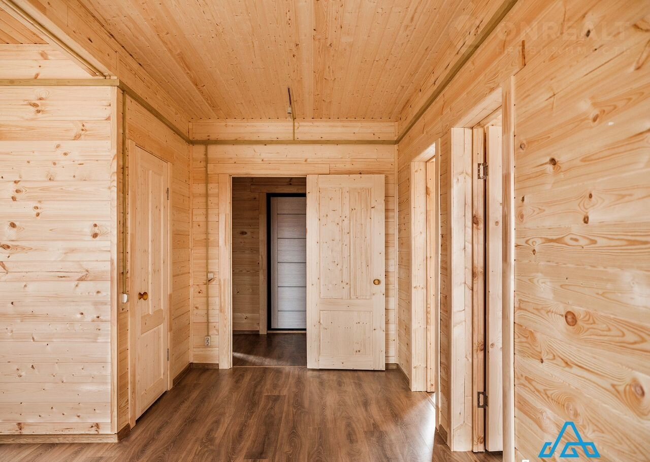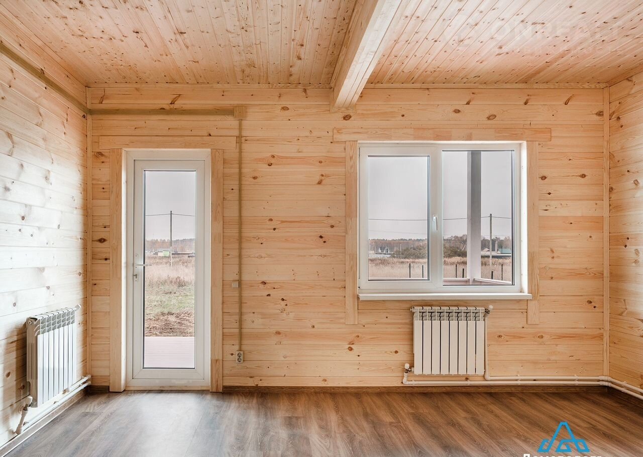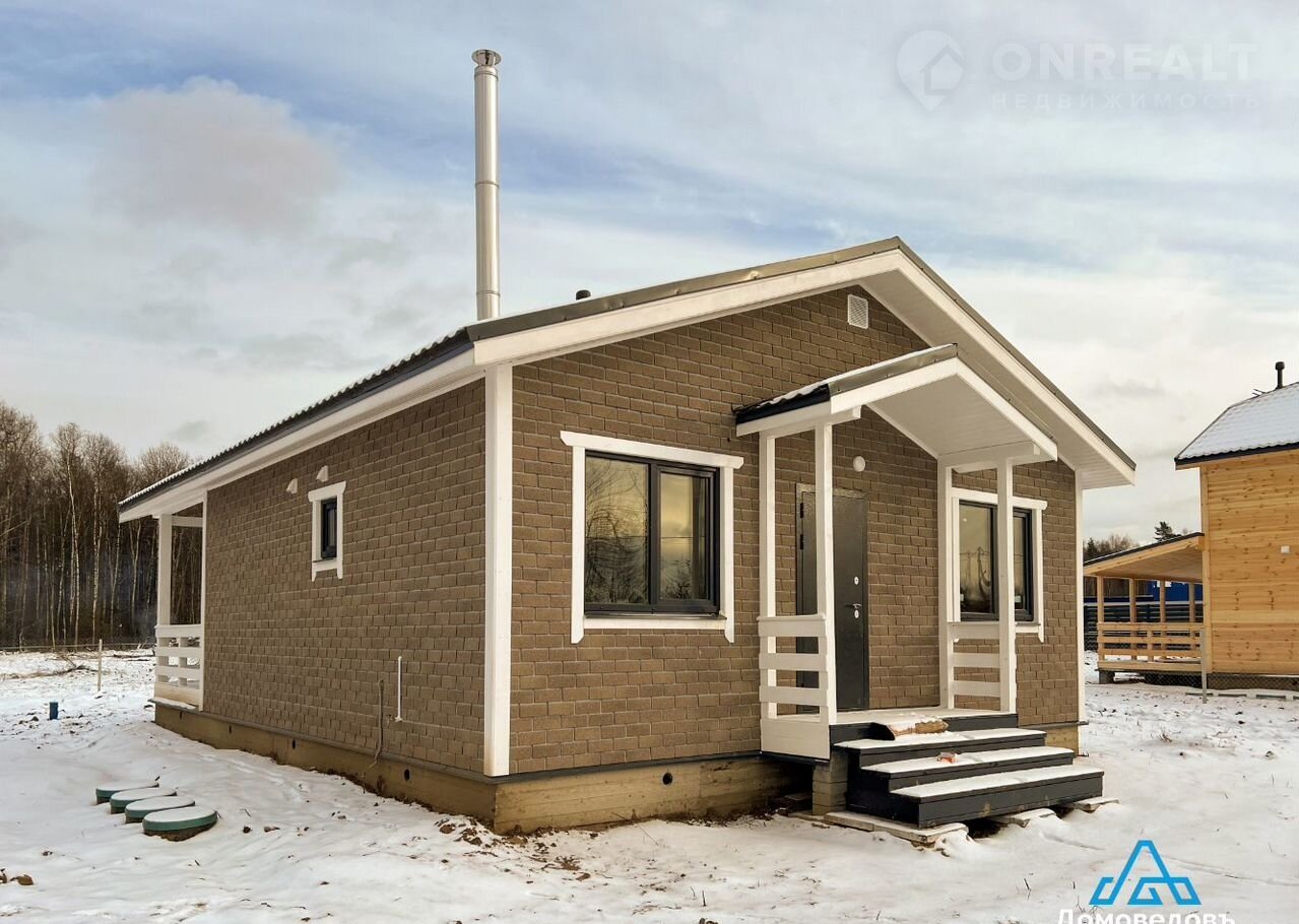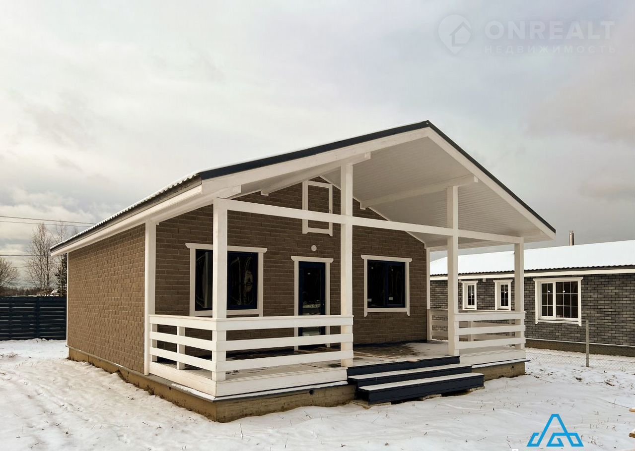 В доме кухня-гостиная площадью 22 кв. м с выходом на террасу 24 кв. м, две комнаты по 11 кв. м, санузел, холл и техническое помещение.