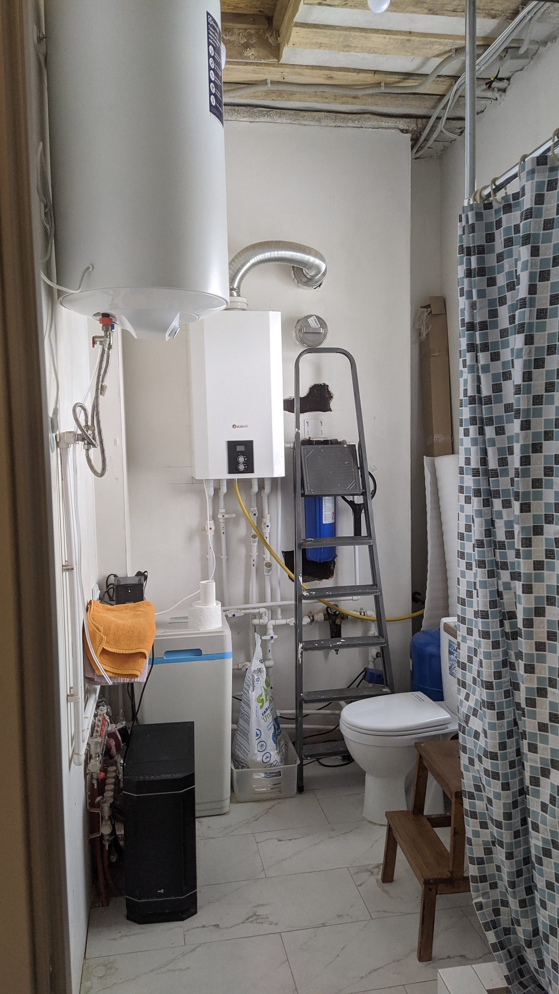 Вода холодная - скважина, горячая - бойлер на 100 литров , так же газовый котел может греть воду.