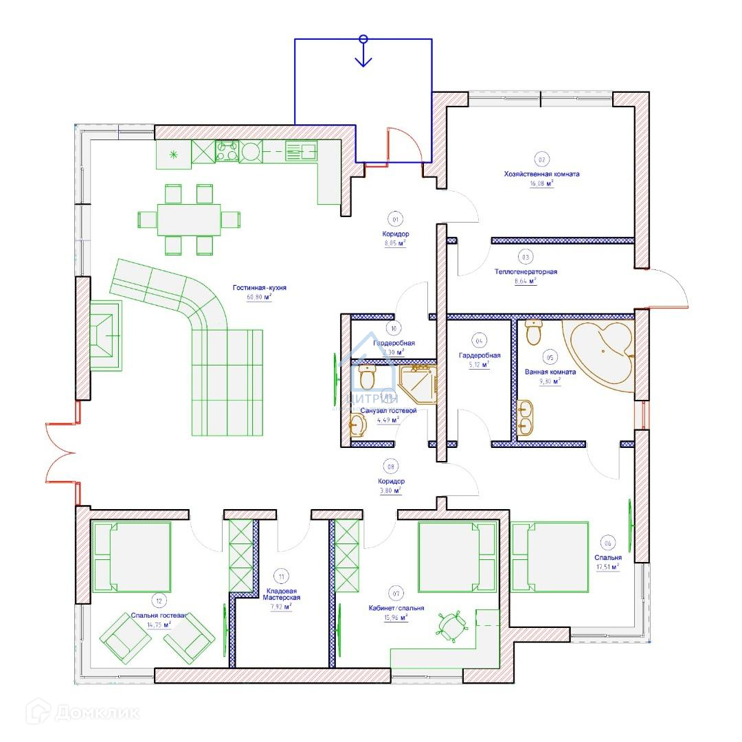 Проектные параметры дома: общая S дома – 182,3 м2, жилая S – 48,22 м2, S кухни-гостиной - 60,8 м2, S гардеробных комнат – 7,42 м2, S хозяйственной комнаты – 16,08 м2, S санузлов – 13,79 м2, S коридоров – 11,85 м2, S технических помещений – 16,56 м2, h потолков многоуровневая – 3 м и 4 м.