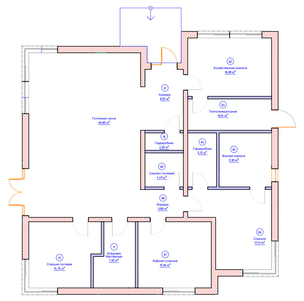 - проектирование: выполнено индивидуально. Дом рассчитан на круглогодичное проживание семьи из 3 – 4 человек. В доме есть: огромная гостиная (60 м2) с потолками 4м, мастер-спальня (17 м2) с выходом на терассу, гардеробную и большой санузел. Две гостевые спальни, кабинет/мастерская, гостевой санузел, большая хозяйственная комната и техническое помещение с отдельным входом;