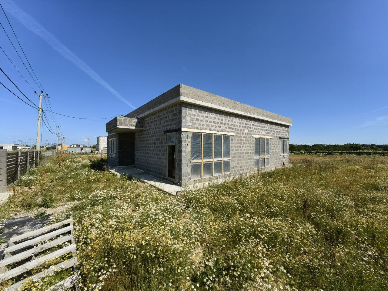 - благоустройство: выполнен весь цикл наружных работ – ввод воды в дом, разводка электричества по участку до ворот, крыльца и патио. Закопан дренаж по периметру дома, смонтирована канализация, аэрационная станция и дренажный колодец. Все подключено и запущено. Сделан въезд на участок. По двум сторонам участка установлен забор;
