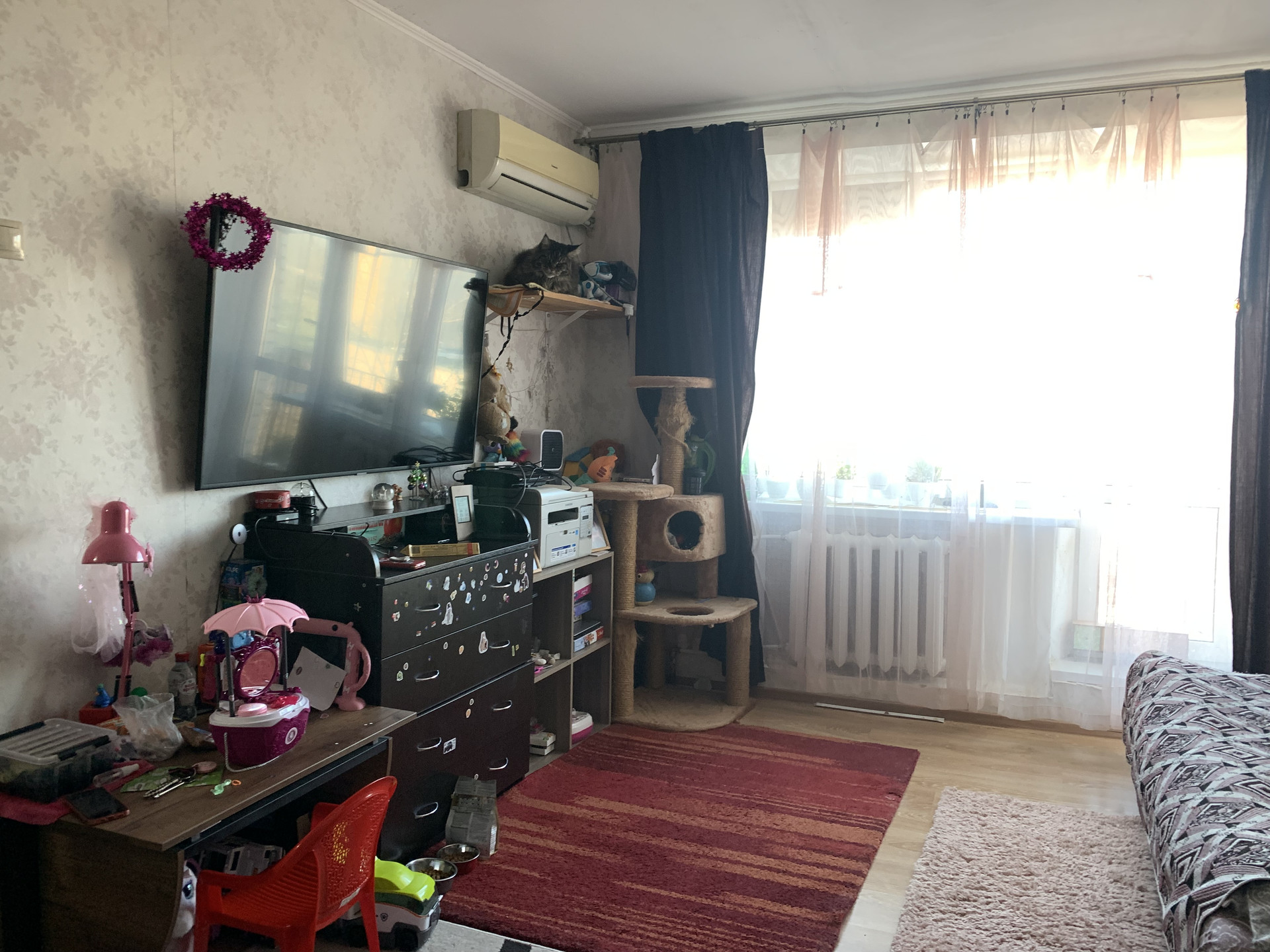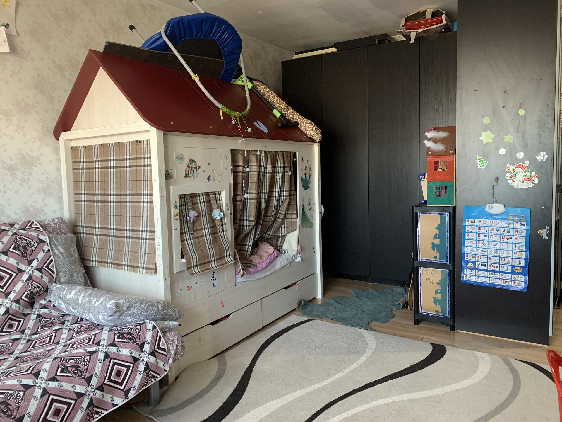 В квартире остается кухонный гарнитур, шкафы, домик-кровать для ребенка (хотя войдет и взрослый). Есть всё необходимое для жизни: магазины, школа, детский сад, досуговый центр для детей, почта, остановки общественного транспорта.