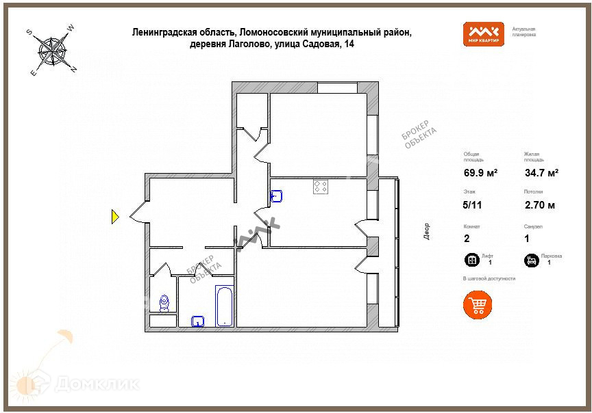 2-комнатная квартира, 69.89 м2, этаж 5 / 11, на продажу в деревне Лаголово, Садовая улица, 14