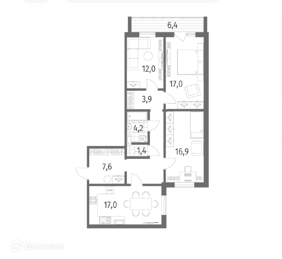 Жилая площадь 45.9 м2