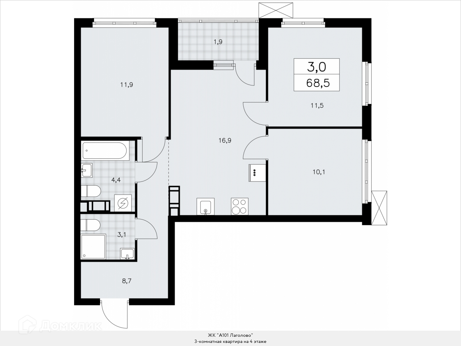 Продаю трехкомнатную квартиру площадью 68.5 кв.м., без отделки, на 4 этаже из 9 в жилом комплексе комфорт-класса "А101 Лаголово". Угловая квартира, в течение дня комнаты отлично освещаются, можно открыть окна и получить естественную вентиляцию. В квартире одна лоджия, два совмещенных санузла. Высота потолков 2.87 м.