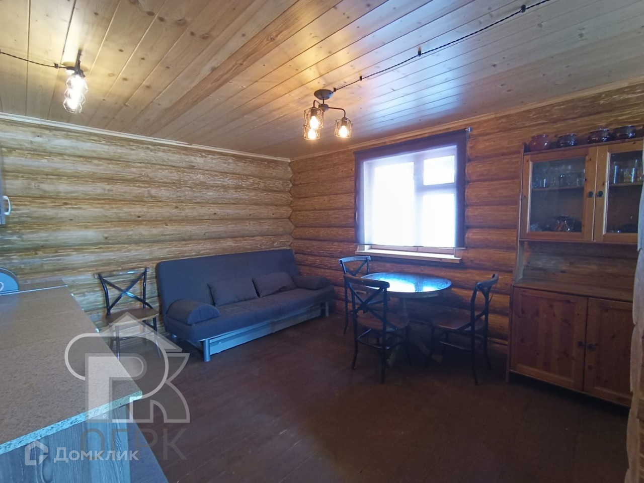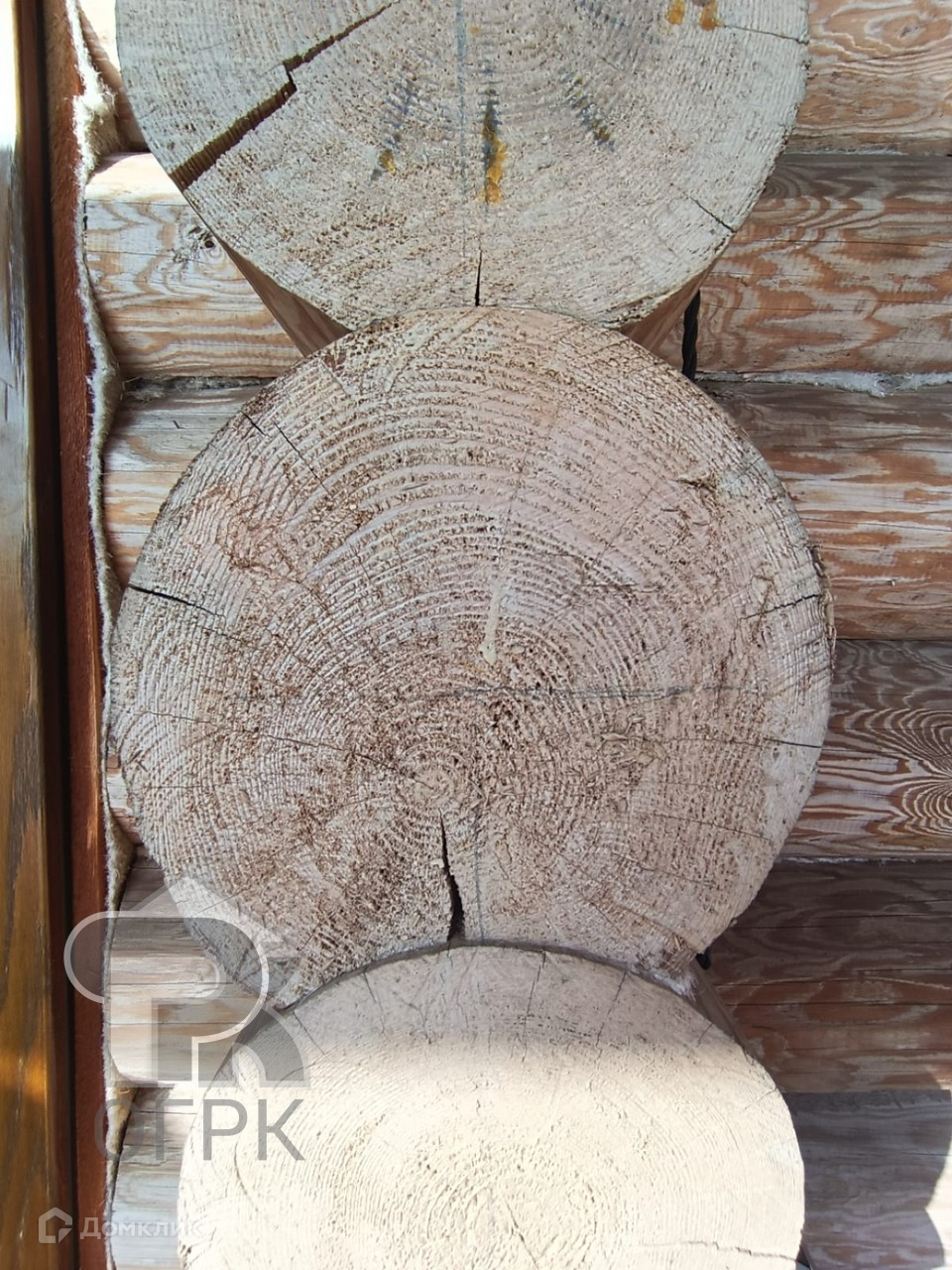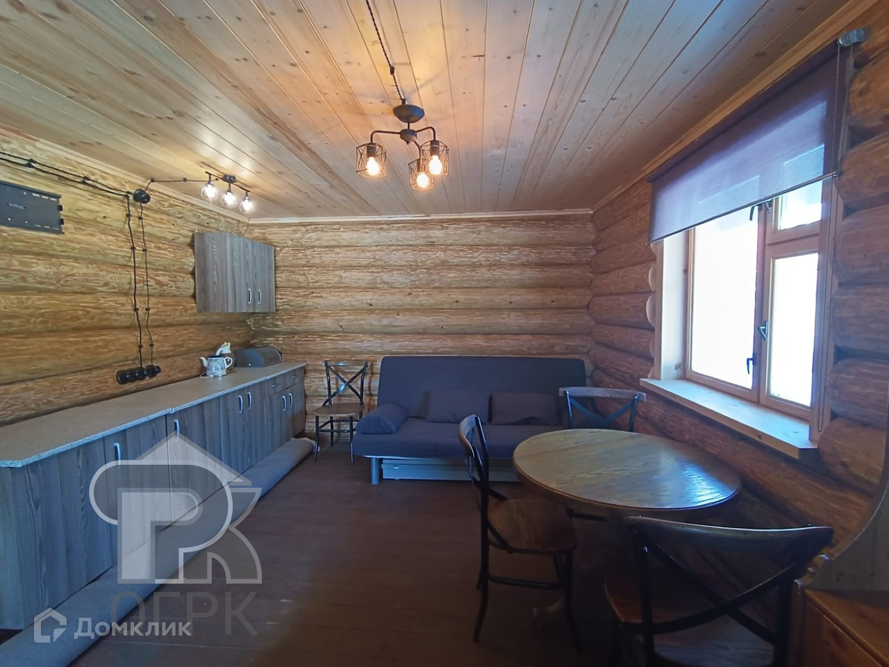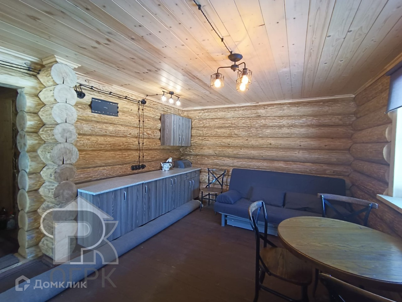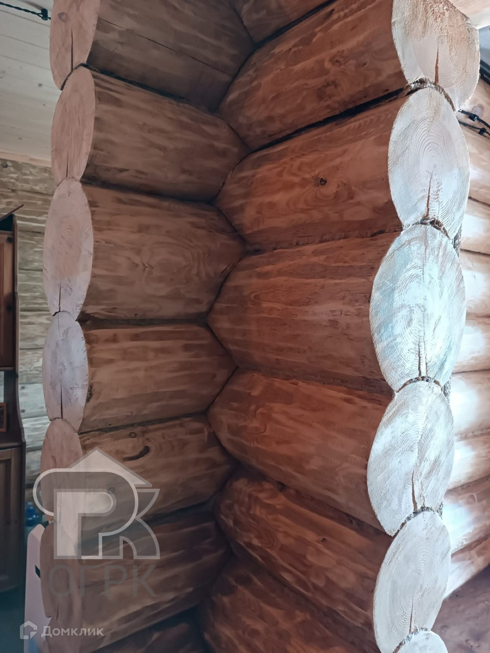 Сруб расположен так, чтобы было место для строительства большого дома. На первом этаже сруба располагается веранда, спальня, кухонная зона. Второй этаж ожидает отделки, предполагается спальня и кладовая.