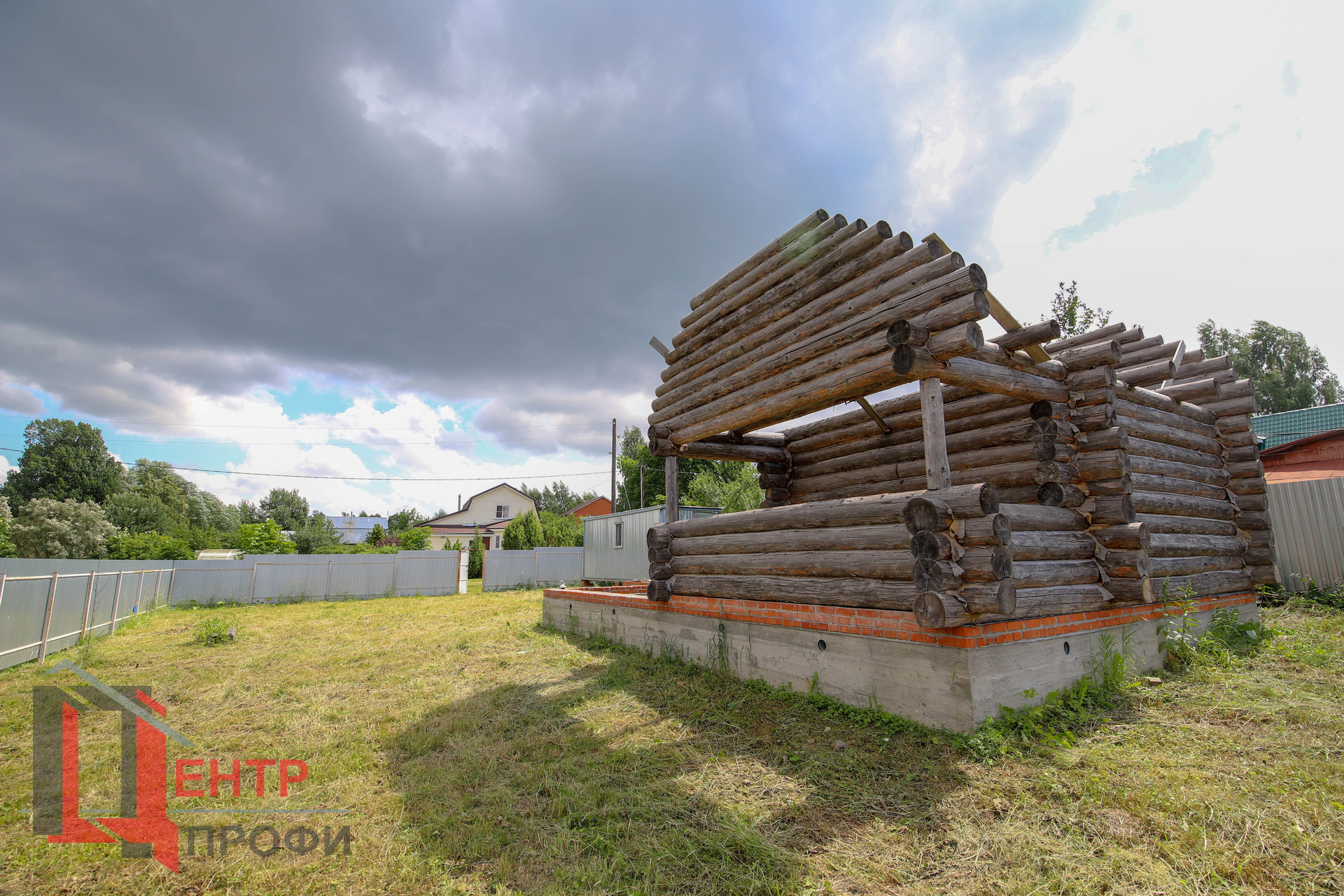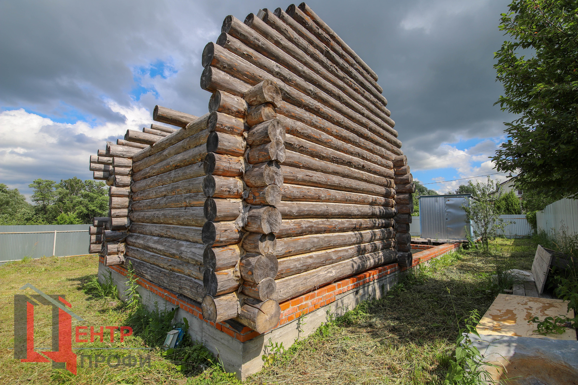 Фундамент большого заглубления шириной полтора кирпича, по периметру фундамента сделана кирпичная кладка в два ряда через гидроизоляционный слой. На части фундамента установлен сруб под комбинированный дом (можно сруб снять и установить рядом под большую баню (нижний венец дуб, фронтоны рубленные).