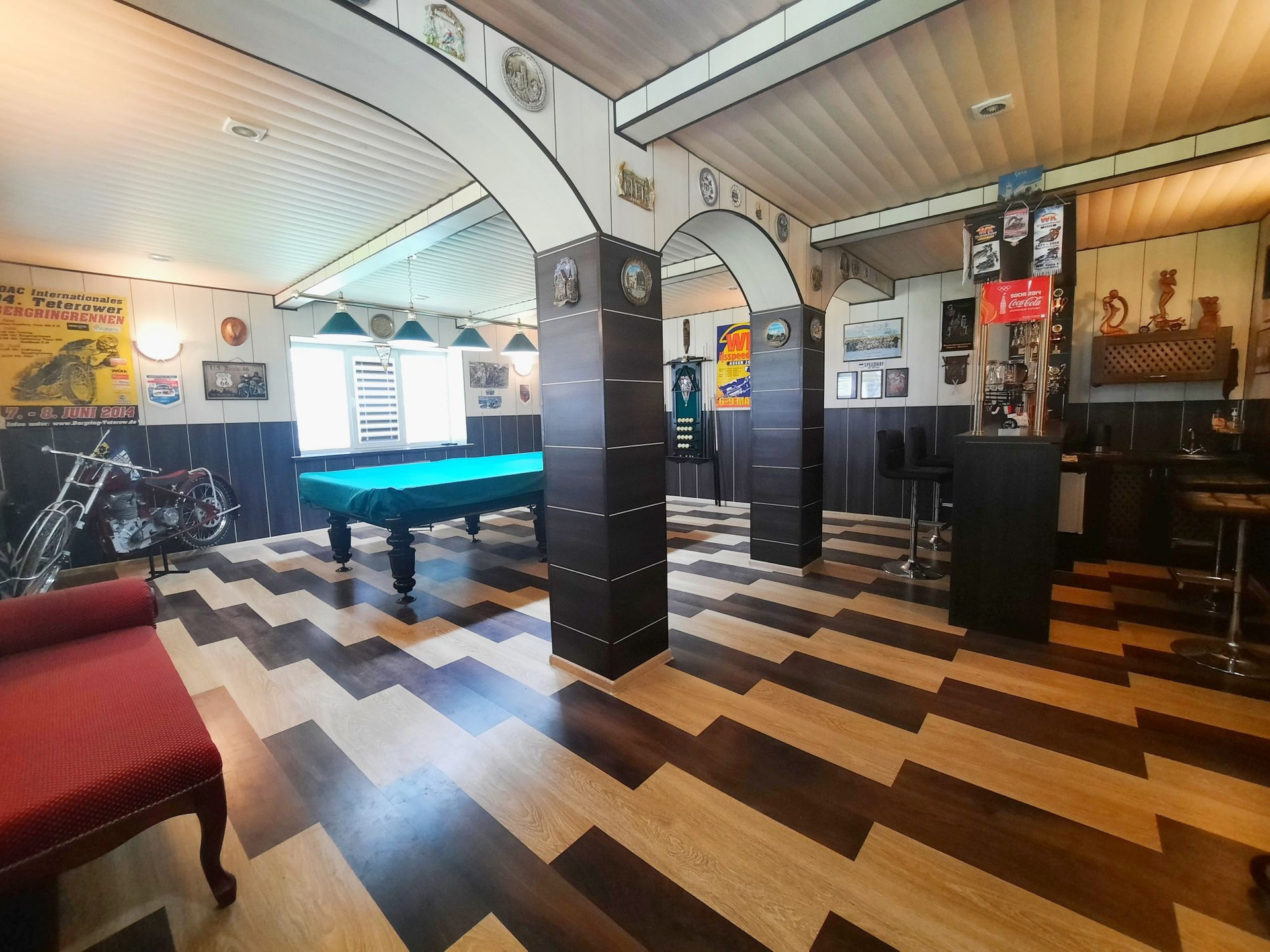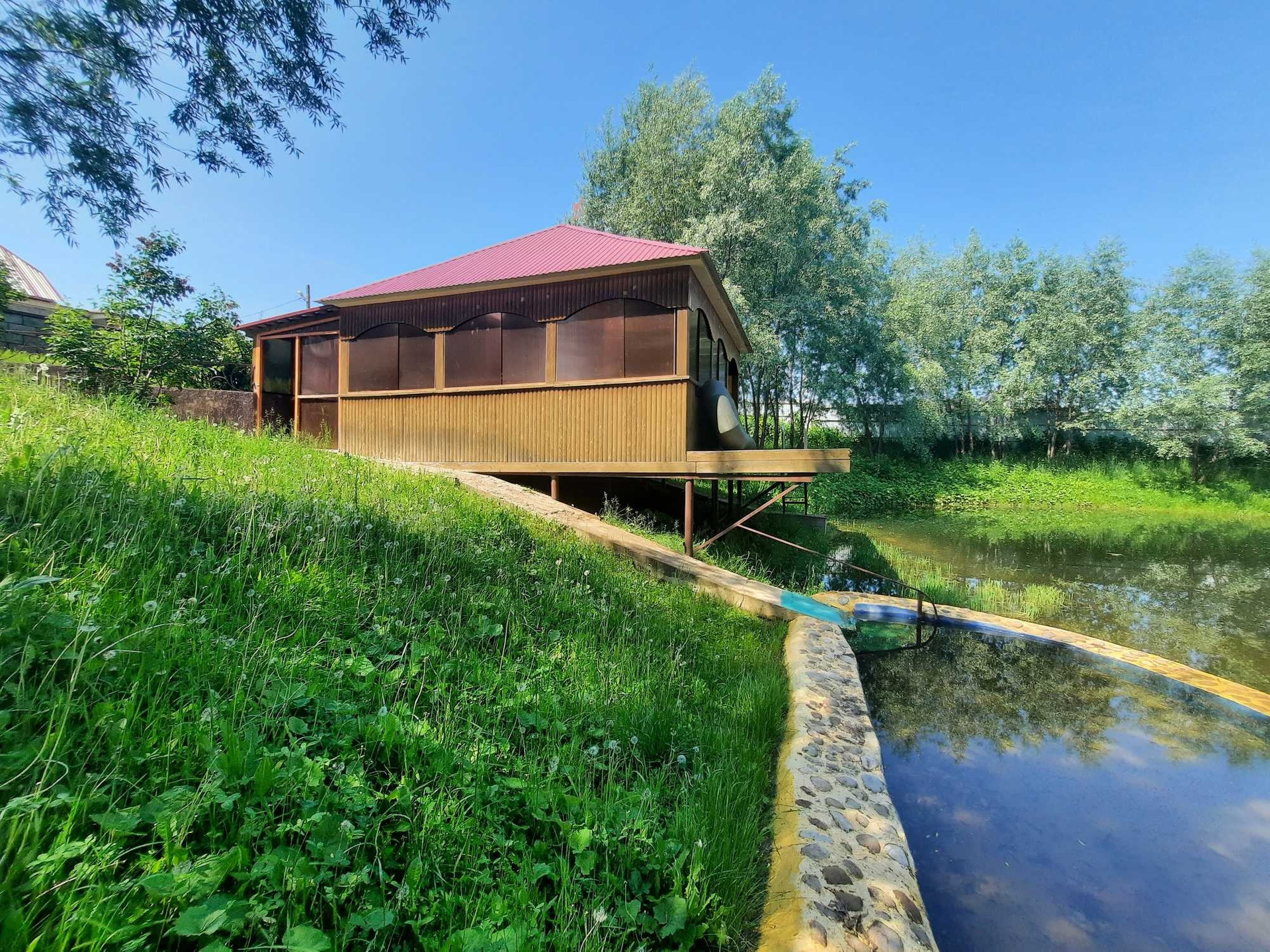 В банном комплексе располагается комната отдыха с бильярдным столом и барной стойкой, русская баня на дровах, парная и моечная. Также есть отопление, тёплый пол, санузел. Имеется всё для комфортного отдыха. Вблизи, на территории усадьбы располагается собственный пруд с карасиками, где можно порыбачить и поплавать на лодке. Просторная беседка с печью и зоной барбекю, огромный стол для трапезы на природе.