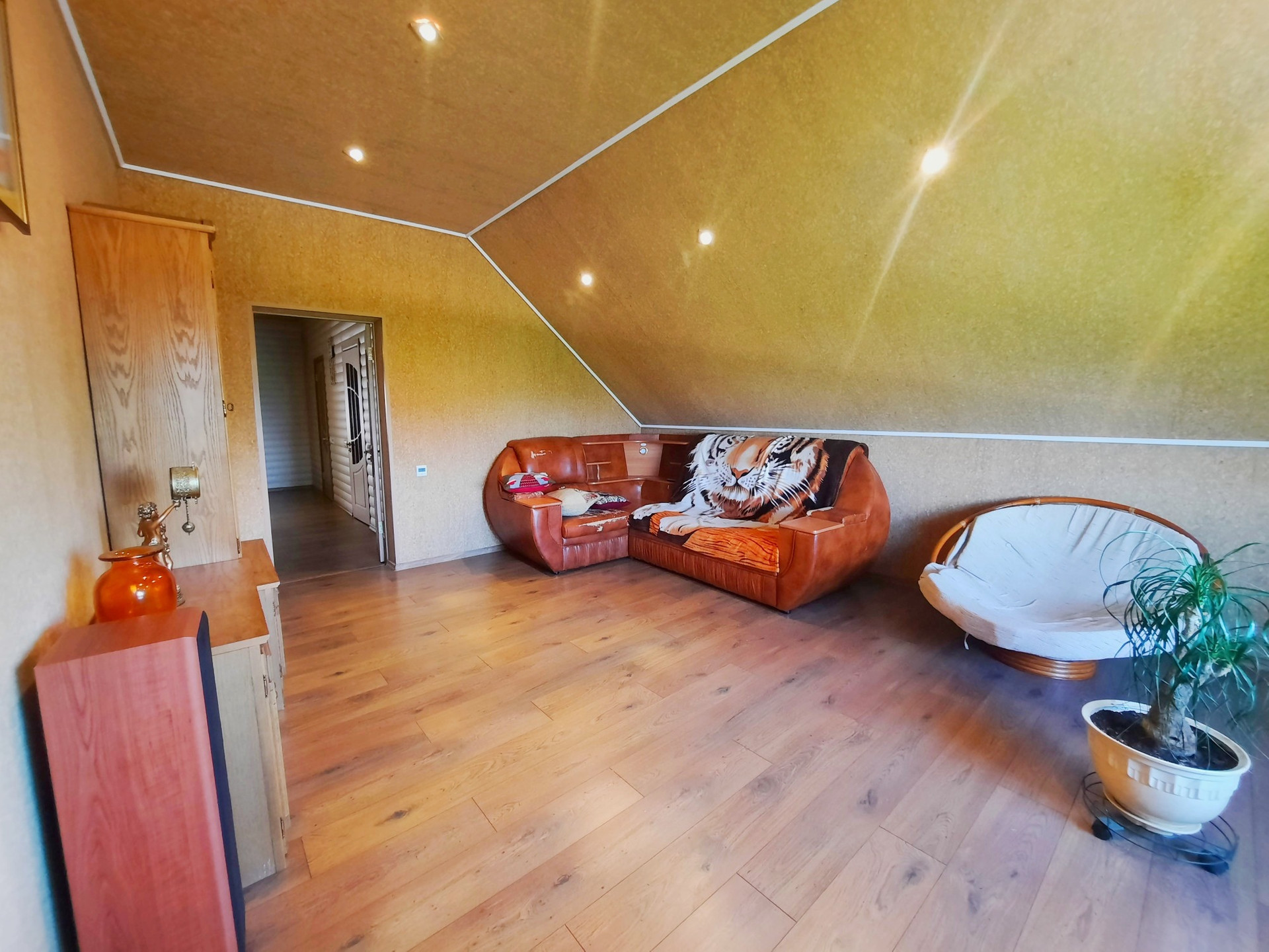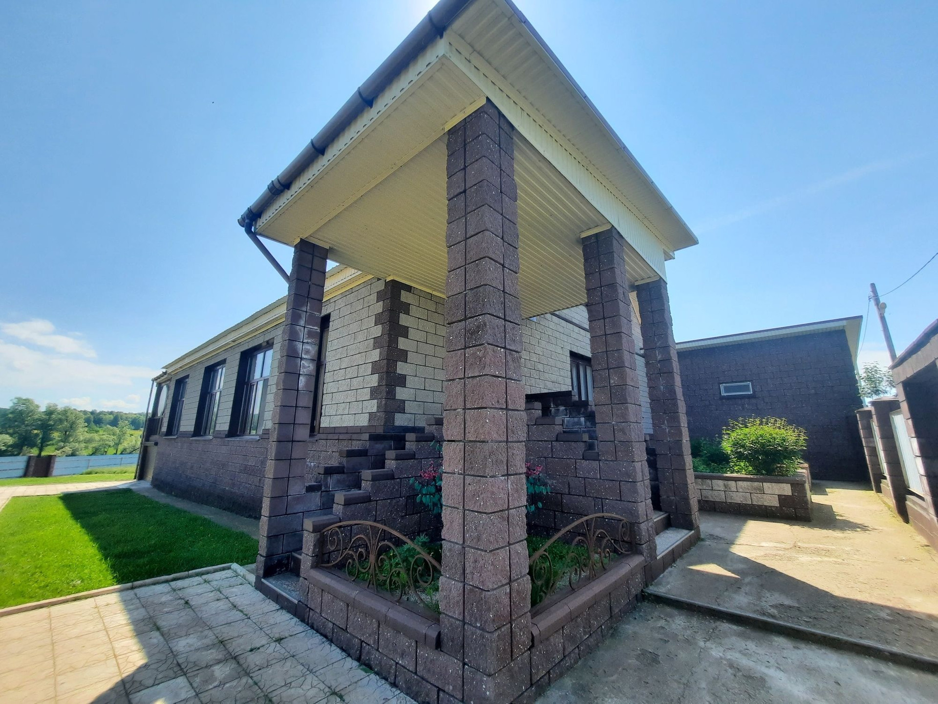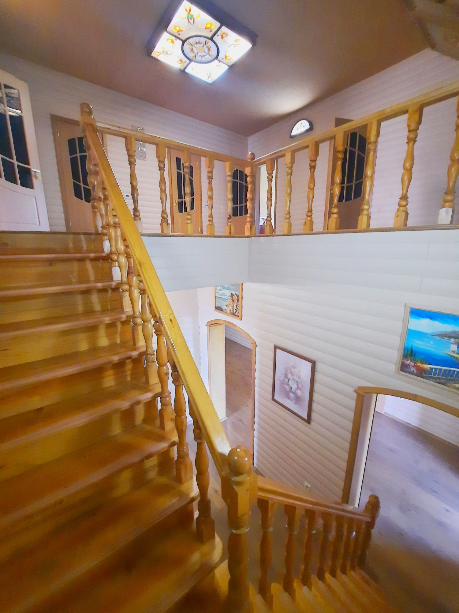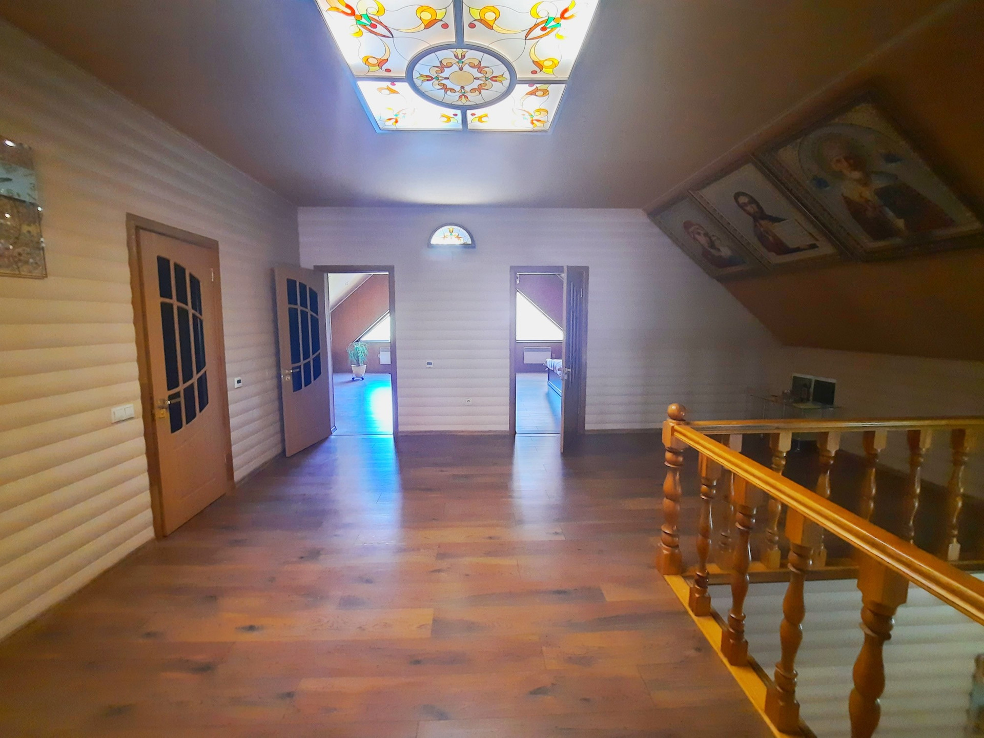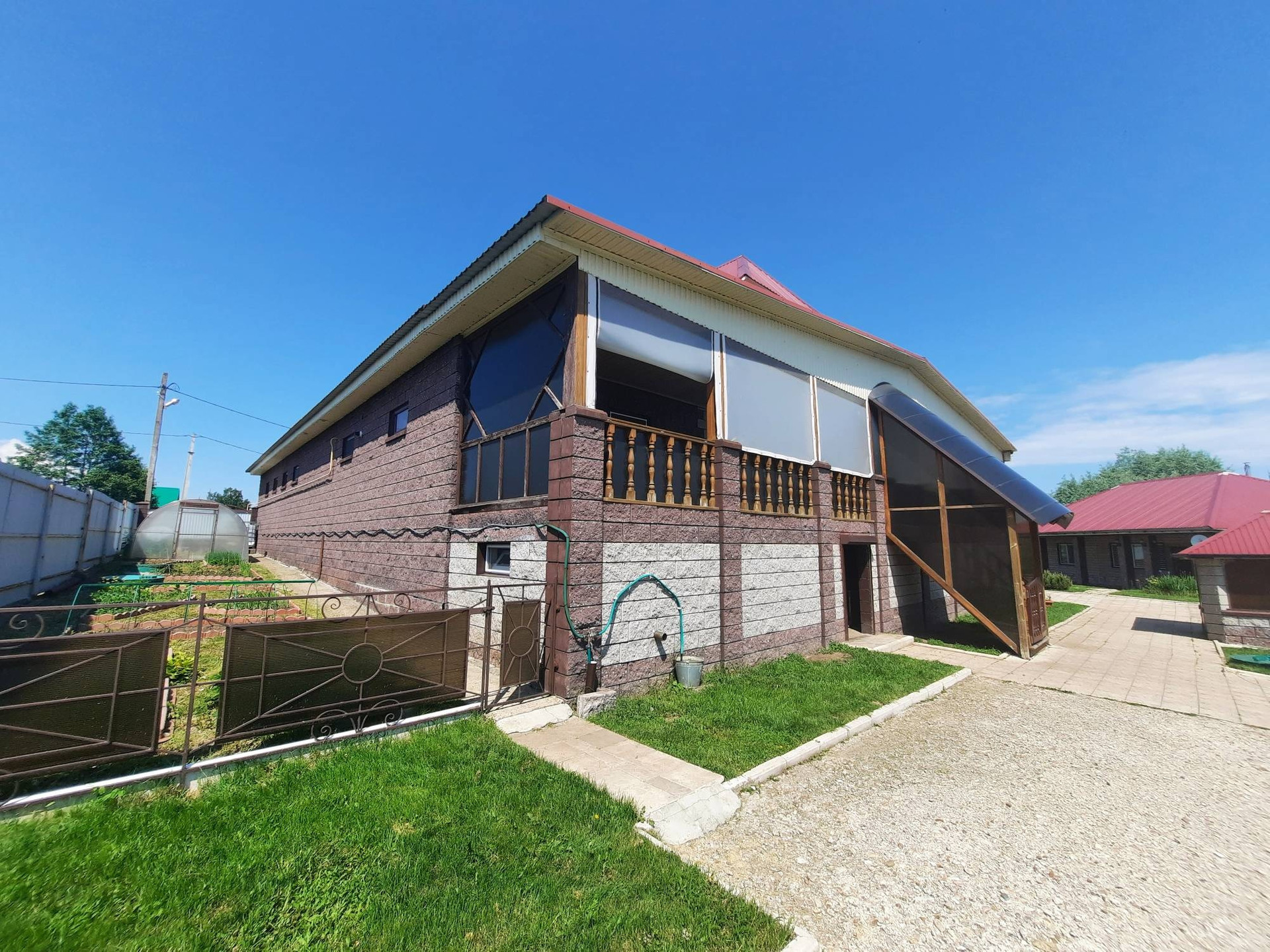 Дом построен из бруса в 2010 году, утеплен и обшит качественными материалами. Здесь все продумано до мелочей. Есть отдельная бойлерная, электрощитовая, постирочная-прачечная, большой гараж на несколько машин с выходом прямо в дом. На первом этаже также располагается большая гостиная 48 м² с камином, кухня столовая 50,6 м² с панорамными окнами, встроенным кухонным гарнитуром и встроенной техникой, большим обеденным столом. Терраса с выходом во двор. Раздельный санузел. Огромный холл 42,9 м² с панорамными окнами. На второй этаж ведёт удобная деревянная лестница. Второй этаж состоит из просторного холла 25,9 м², трёх комнат площадью 31,1 м² , 24 м² и 23,5 м², большой ванной комнаты и туалета.