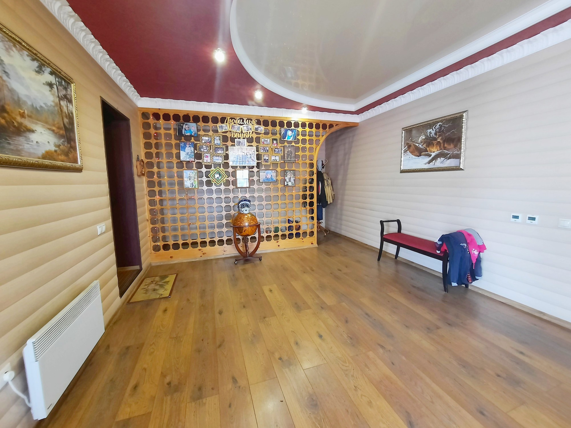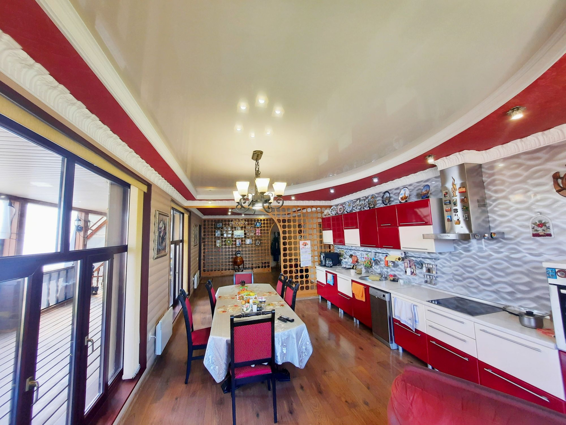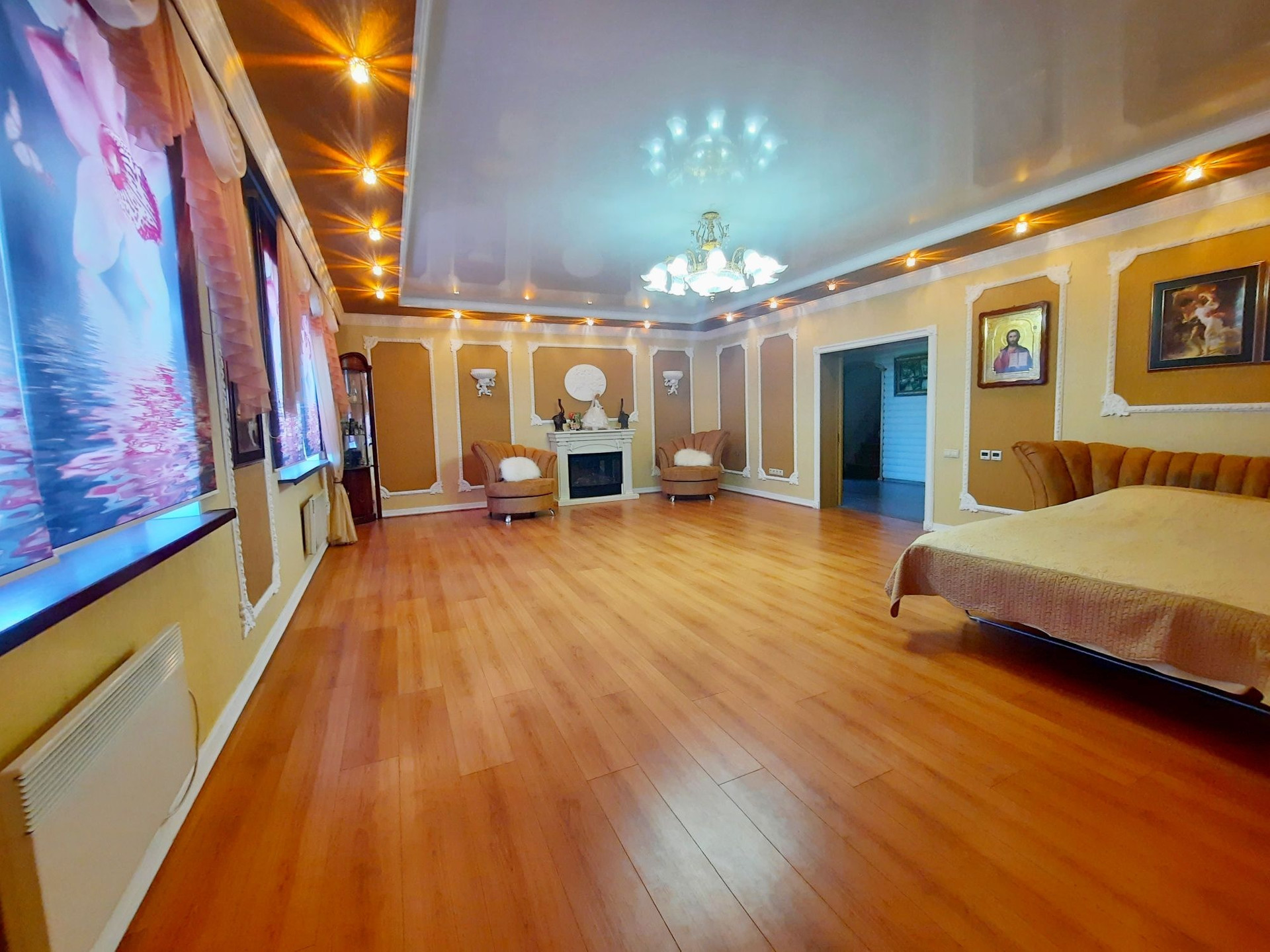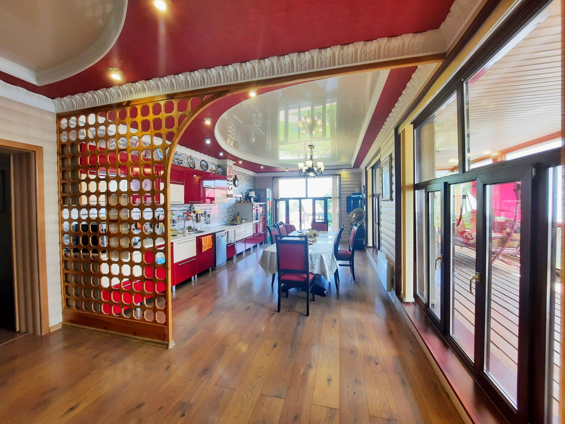 Дом построен из бруса в 2010 году, утеплен и обшит качественными материалами. Здесь все продумано до мелочей. Есть отдельная бойлерная, электрощитовая, постирочная-прачечная, большой гараж на несколько машин с выходом прямо в дом. На первом этаже также располагается большая гостиная 48 м² с камином, кухня столовая 50,6 м² с панорамными окнами, встроенным кухонным гарнитуром и встроенной техникой, большим обеденным столом. Терраса с выходом во двор. Раздельный санузел. Огромный холл 42,9 м² с панорамными окнами. На второй этаж ведёт удобная деревянная лестница. Второй этаж состоит из просторного холла 25,9 м², трёх комнат площадью 31,1 м² , 24 м² и 23,5 м², большой ванной комнаты и туалета.