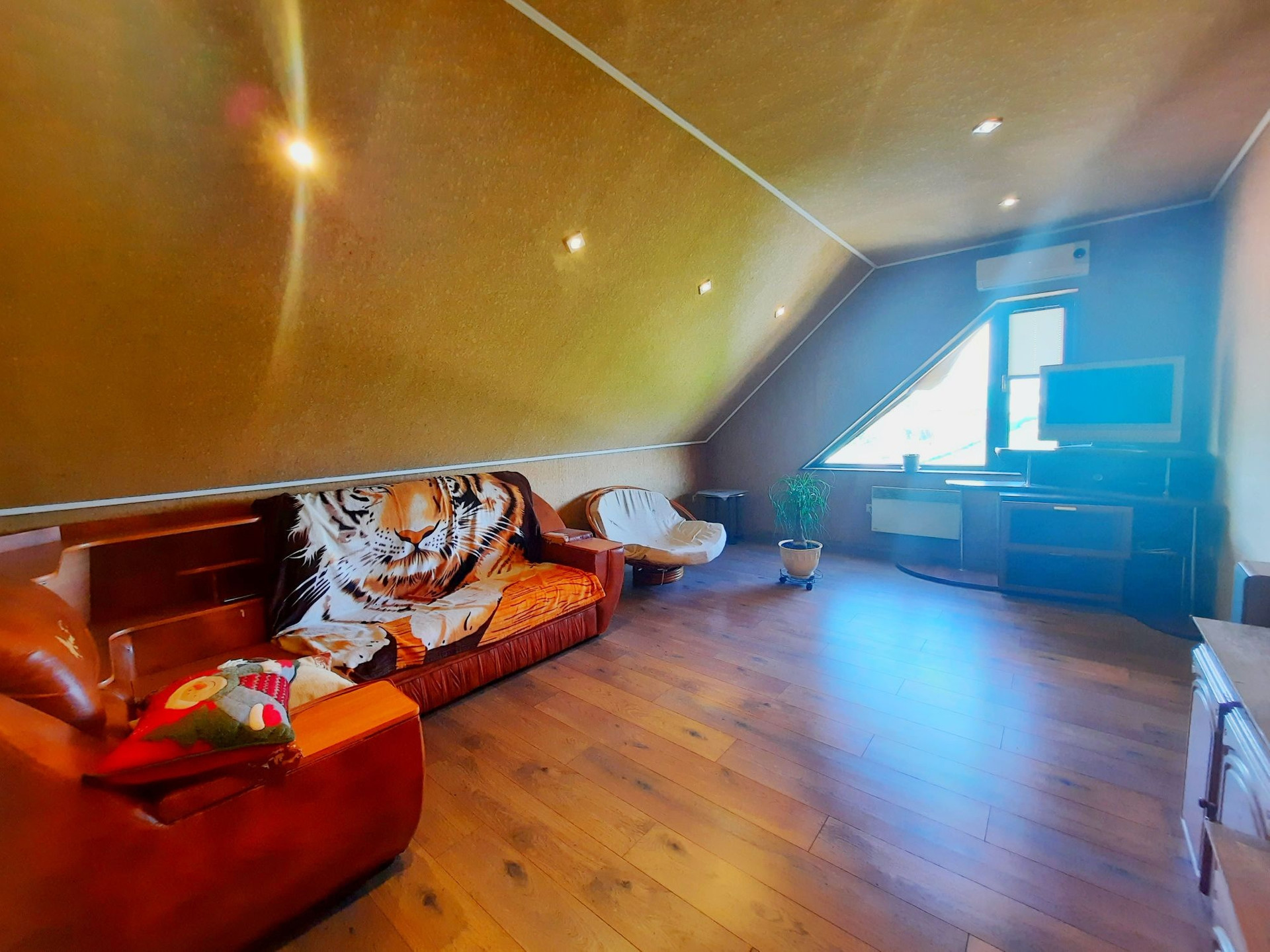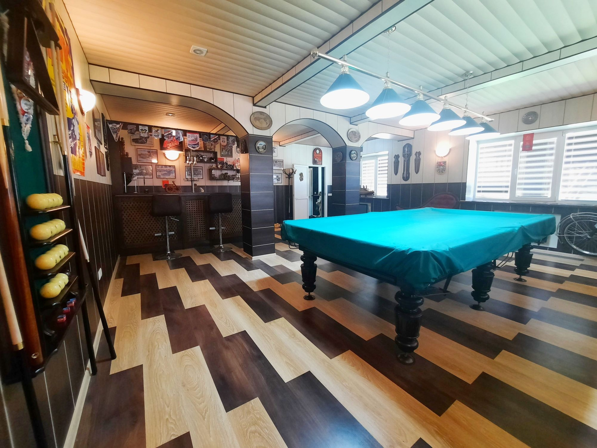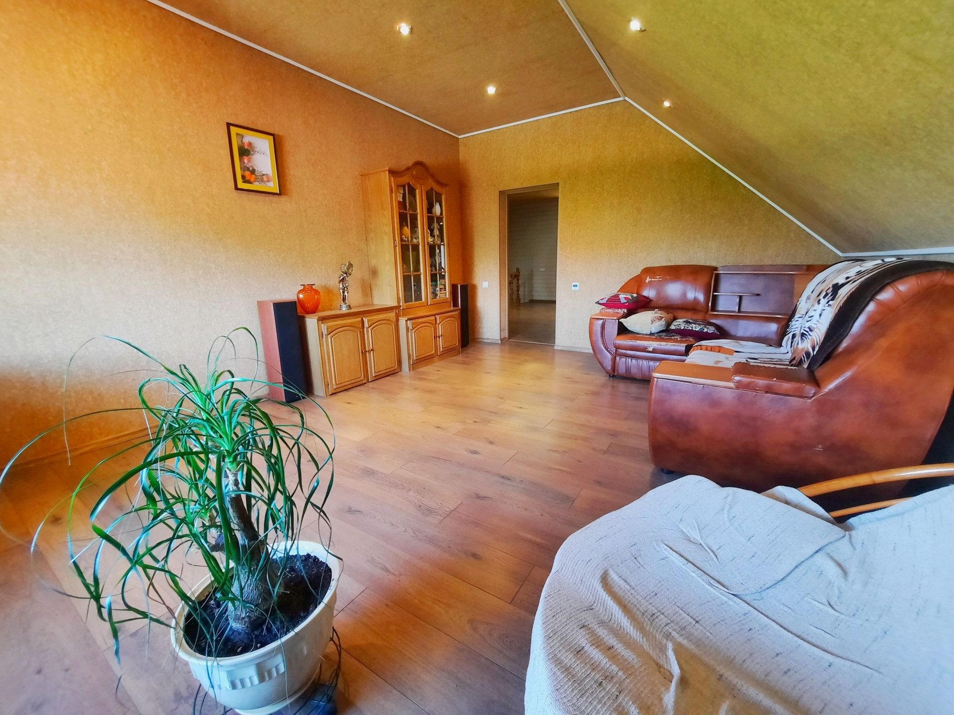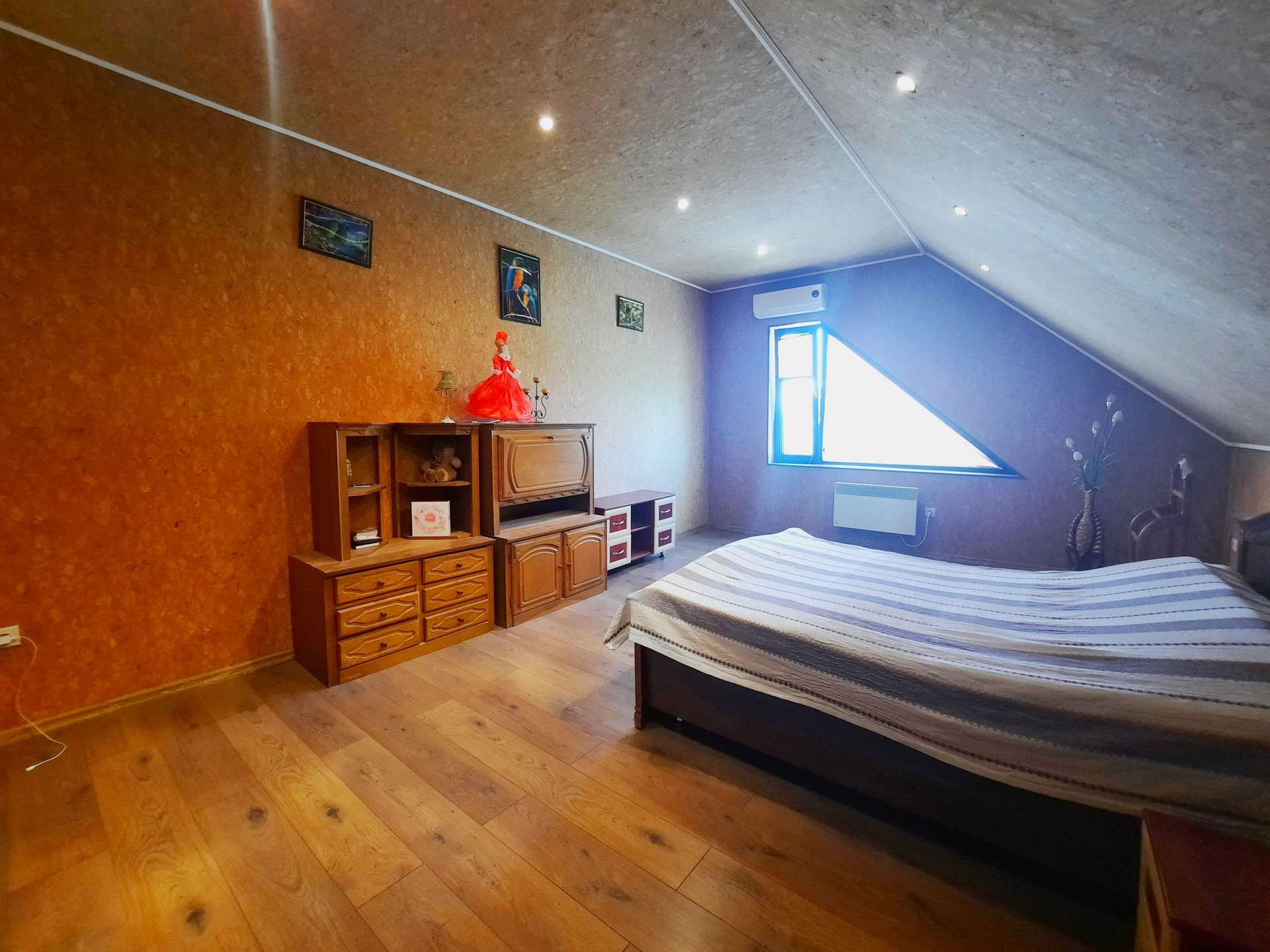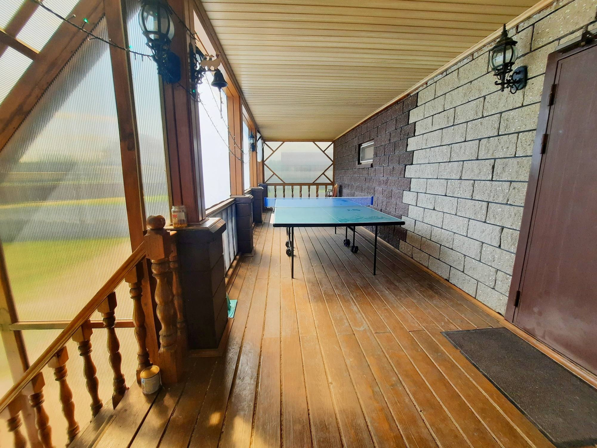 Дом построен из бруса в 2010 году, утеплен и обшит качественными материалами. Здесь все продумано до мелочей. Есть отдельная бойлерная, электрощитовая, постирочная-прачечная, большой гараж на несколько машин с выходом прямо в дом. На первом этаже также располагается большая гостиная 48 м² с камином, кухня столовая 50,6 м² с панорамными окнами, встроенным кухонным гарнитуром и встроенной техникой, большим обеденным столом. Терраса с выходом во двор. Раздельный санузел. Огромный холл 42,9 м² с панорамными окнами. На второй этаж ведёт удобная деревянная лестница. Второй этаж состоит из просторного холла 25,9 м², трёх комнат площадью 31,1 м² , 24 м² и 23,5 м², большой ванной комнаты и туалета.