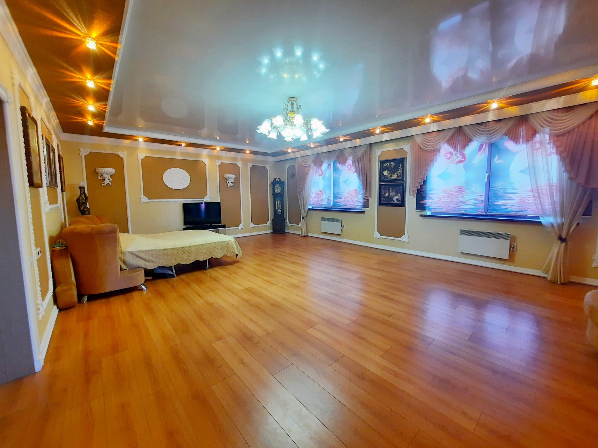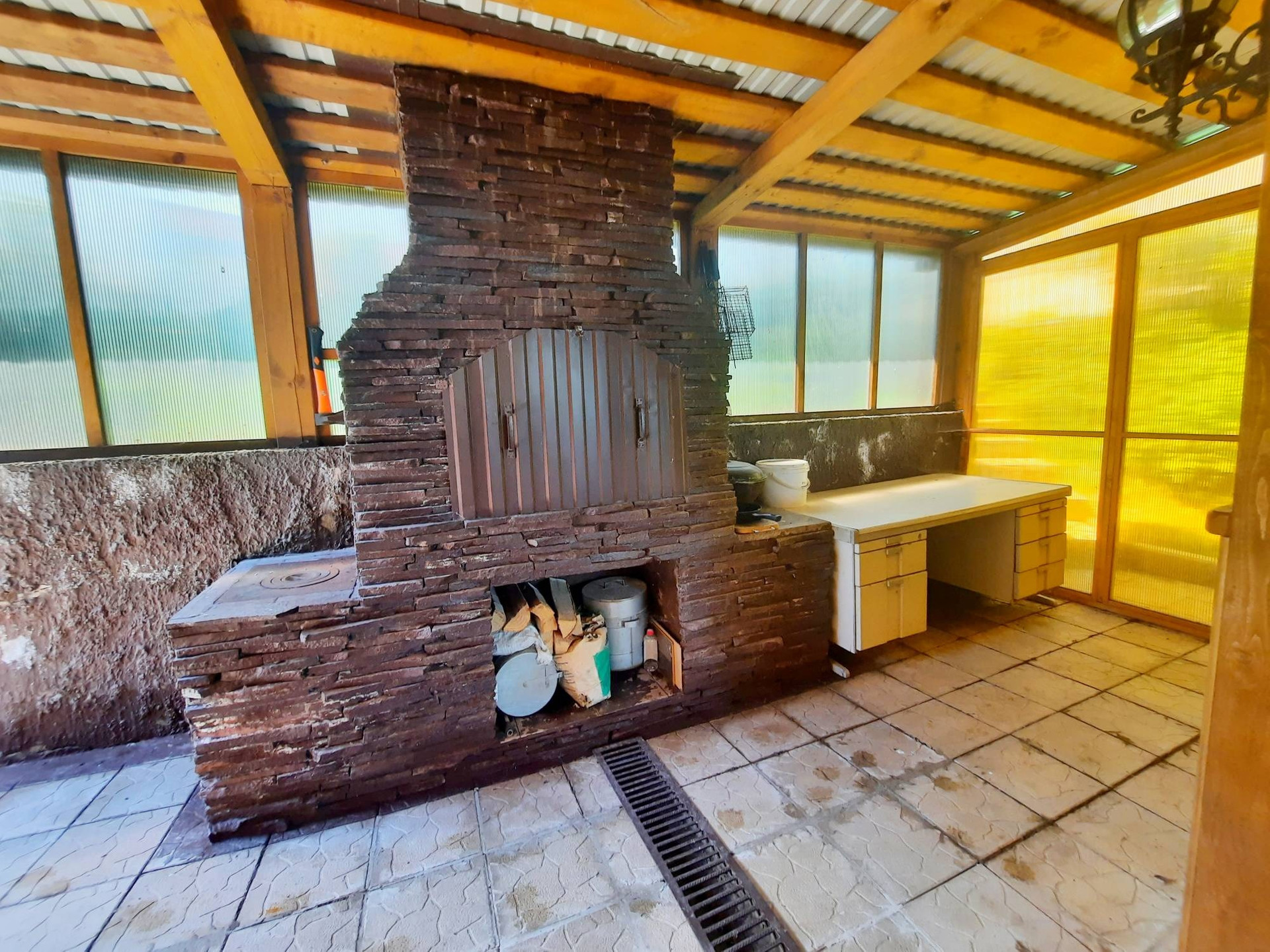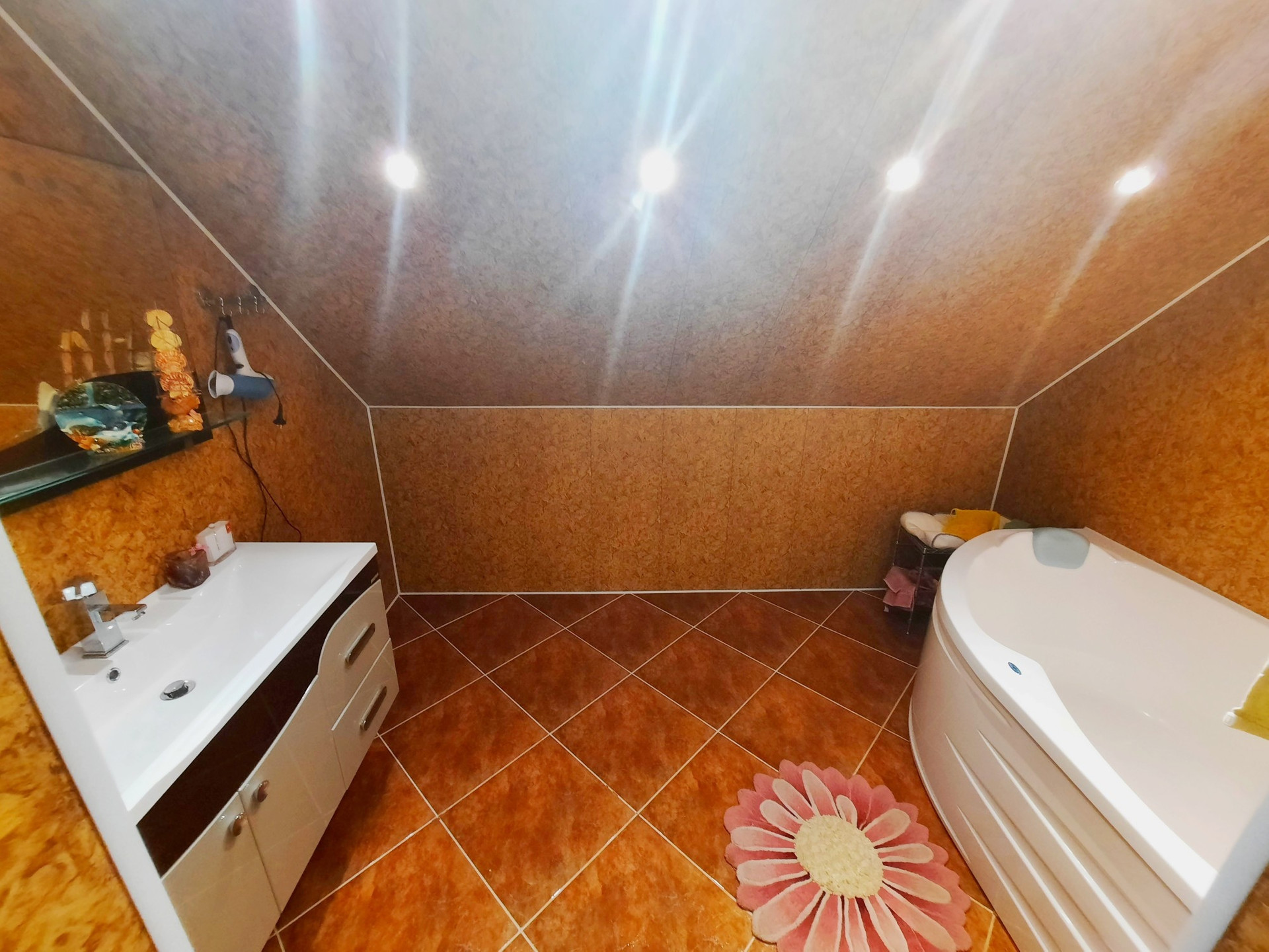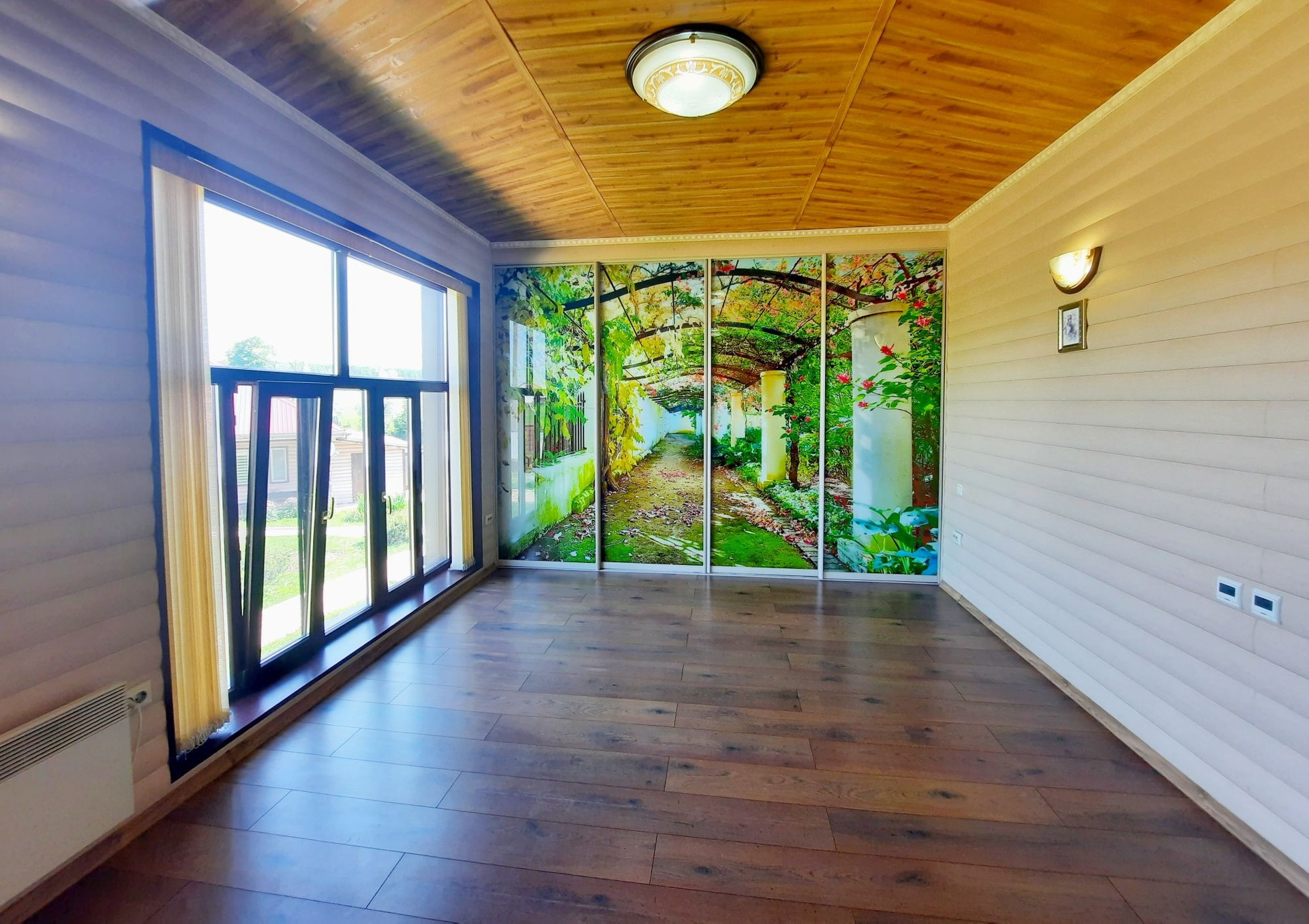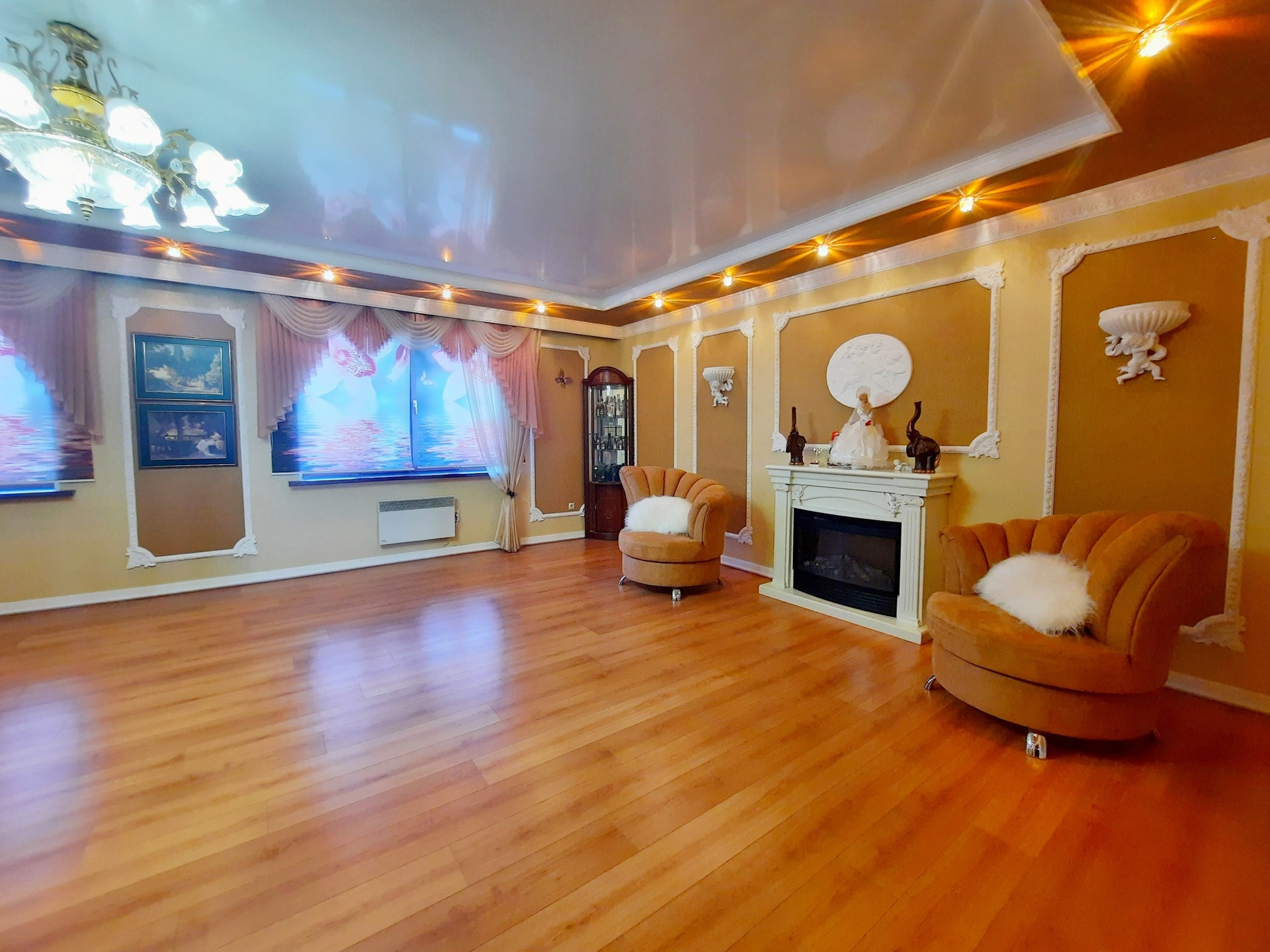 Дом построен из бруса в 2010 году, утеплен и обшит качественными материалами. Здесь все продумано до мелочей. Есть отдельная бойлерная, электрощитовая, постирочная-прачечная, большой гараж на несколько машин с выходом прямо в дом. На первом этаже также располагается большая гостиная 48 м² с камином, кухня столовая 50,6 м² с панорамными окнами, встроенным кухонным гарнитуром и встроенной техникой, большим обеденным столом. Терраса с выходом во двор. Раздельный санузел. Огромный холл 42,9 м² с панорамными окнами. На второй этаж ведёт удобная деревянная лестница. Второй этаж состоит из просторного холла 25,9 м², трёх комнат площадью 31,1 м² , 24 м² и 23,5 м², большой ванной комнаты и туалета.