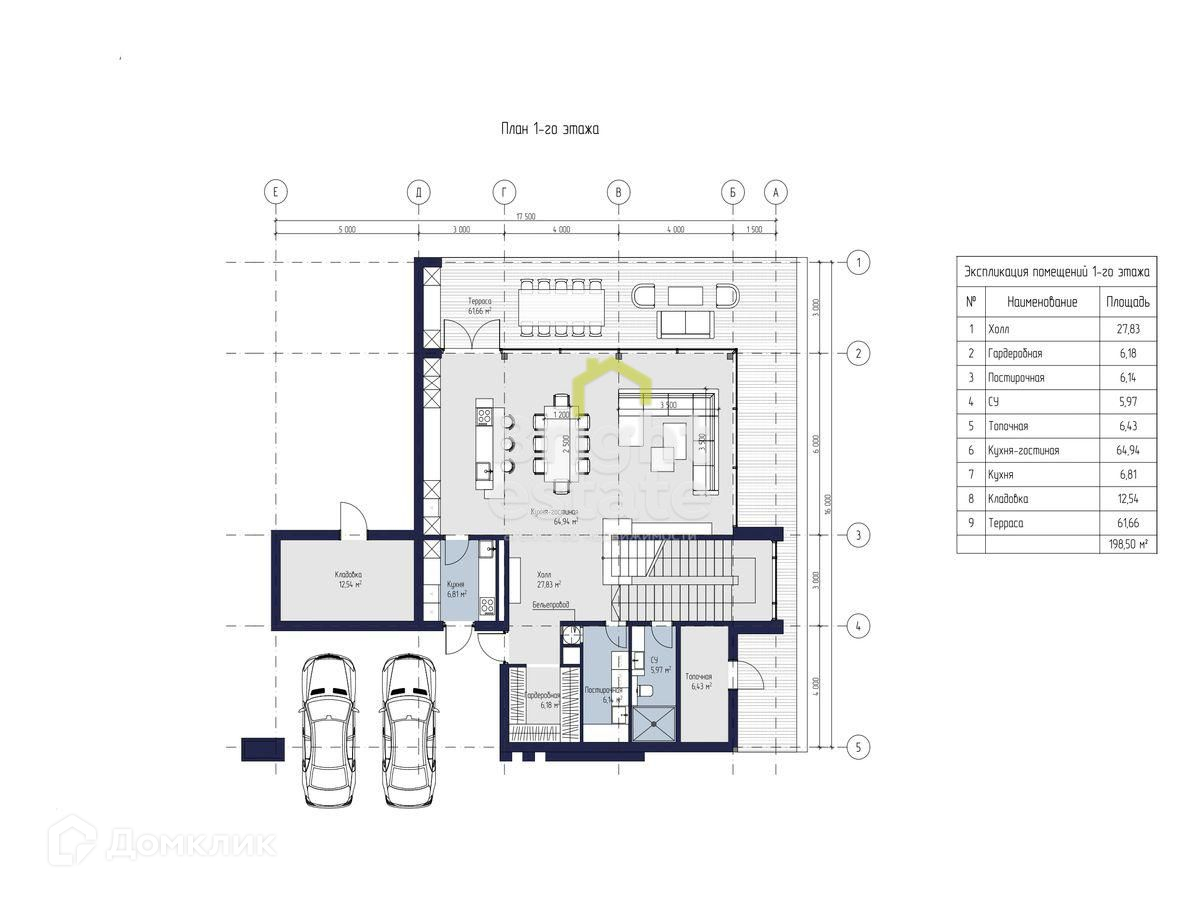 1 этаж: навес на 2 м/м, прихожая, кухня-гостиная, гардеробная, постирочная, с/у.