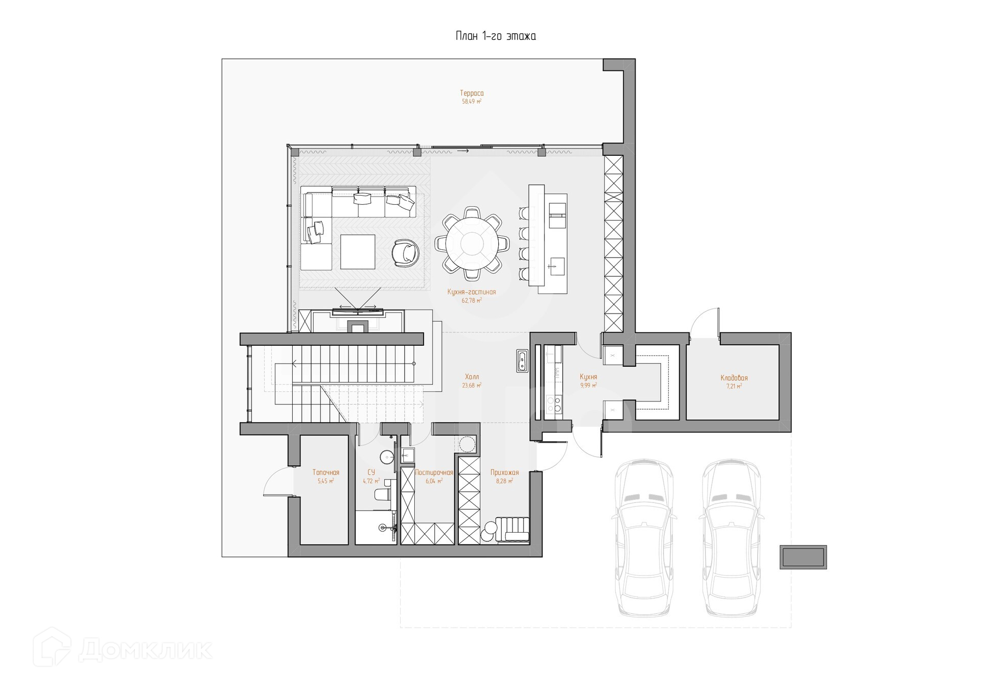 1 этаж: кухня-гостиная с выходом на веранду, рабочая кухня, построчная, кладовая, бойлерная, санузел, гараж на 2 машины.