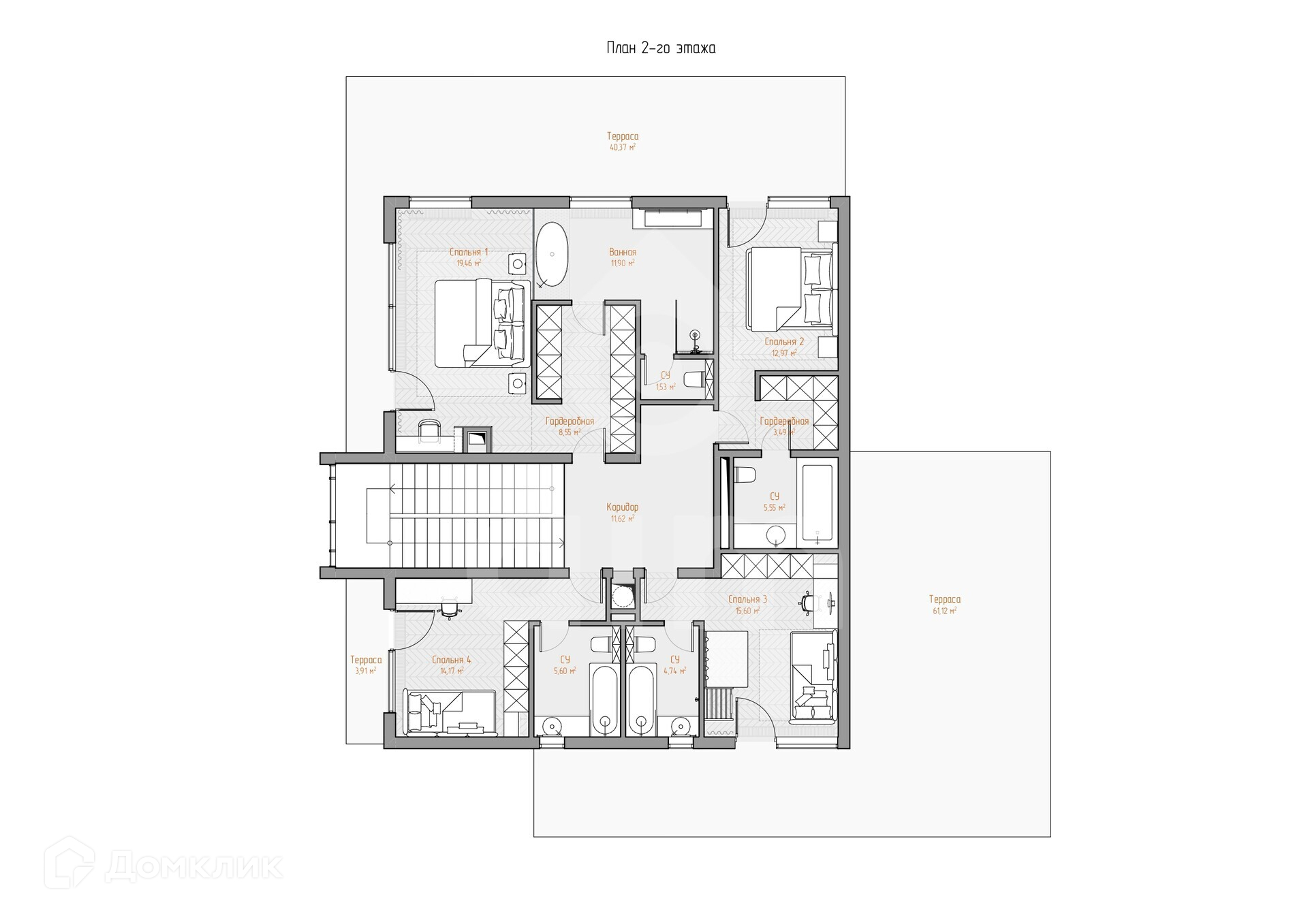 2 этаж: мастер-спальня, три спальни с гардеробными и санузлам.