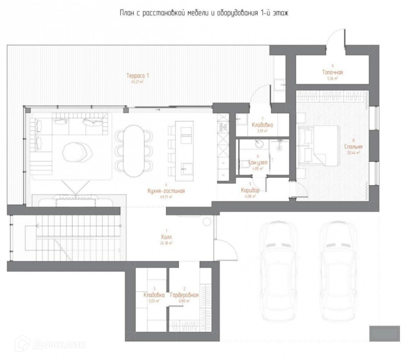 1 этаж: Прихожая/холл, гардеробная, кухня-столовая-гостиная с выходом на террасу с камином, спальня со своим су, гостевой су, постирочная, техническое помещение/котельная, кладовая, выход на крытый паркинг.
