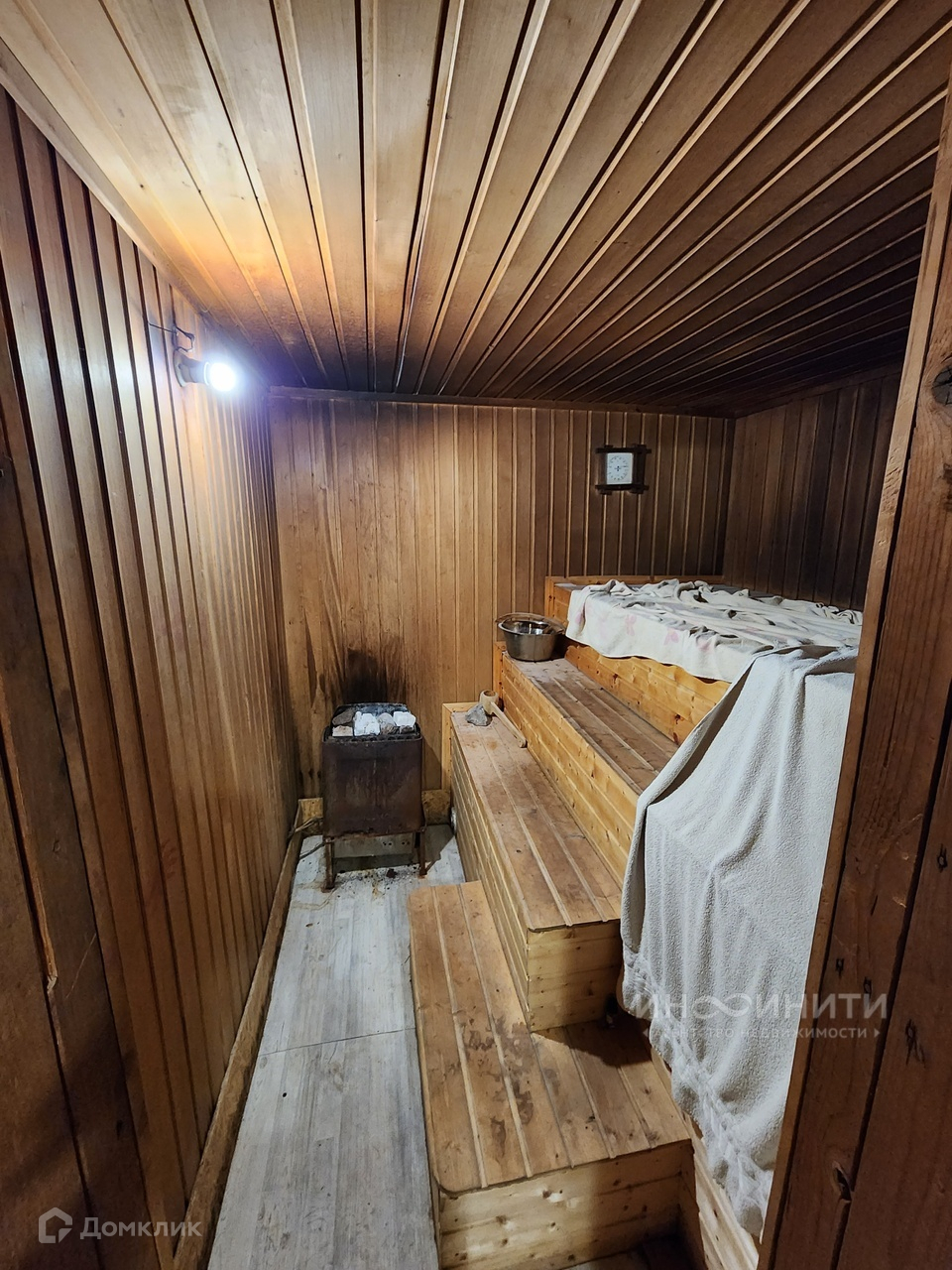 На цоколе расположена сауна , комната отдыха с бассейном и душевой, кладовая, морозильная камера, мастерская, бойлерная.