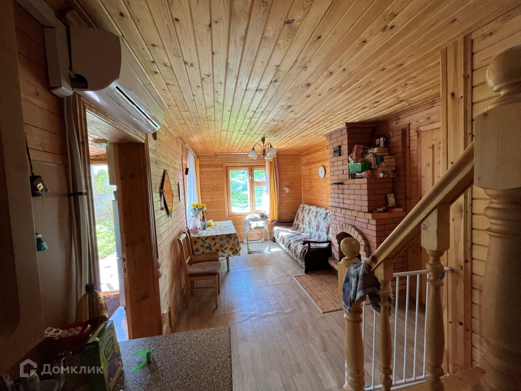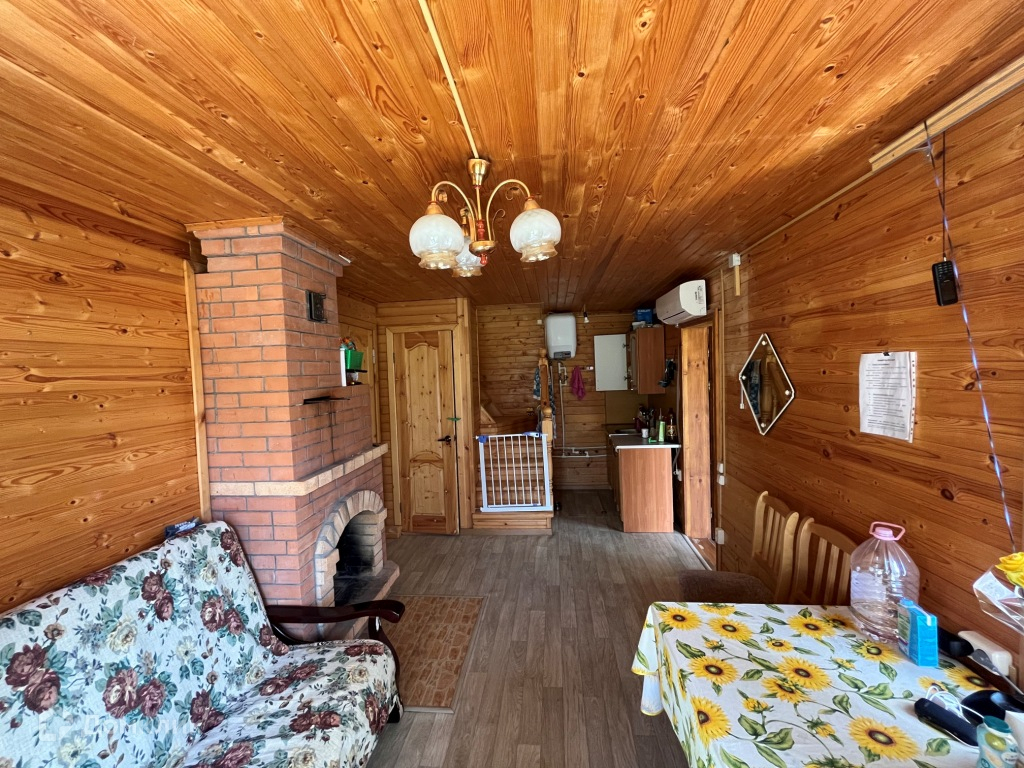 По планировке: на 1-м этаже: кухня-терраса, большая комната с камином, спальня с печкой, на 2-м этаже: одна комната. Коммуникации: вода от собственного колодца на участке (в дом заведена и баню), туалет в доме, свой септик(кольца), электричество 8Квт.